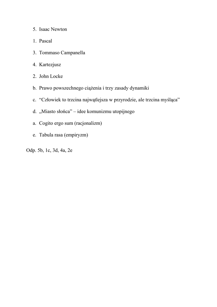 5. Isaac Newton 1. Pascal 3. Tommaso Campanella 4. Kartezjusz 2. John Locke b. Prawo powszechnego ciążenia i trzy zasady dynamiki c. “Człowiek to trzcina najwątlejsza w przyrodzie, ale trzcina myśląca” d. „Miasto słońca” – idee komunizmu utopijnego a. Cogito ergo sum (racjonalizm) e. Tabula rasa (empiryzm) Odp. 5b, 1c, 3d, 4a, 2e