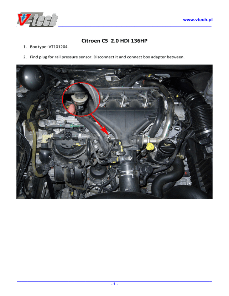 www.vtech.pl ____________________________________________________________________________ Citroen C5 2.0 HDI 136HP 1. Box type: VT101204. 2. Find plug for rail pressure sensor. Disconnect it and connect box adapter between. ___________________________________________________________________________________________ -1-