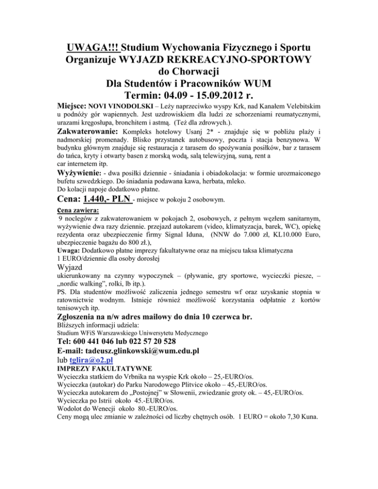 UWAGA!!! Studium Wychowania Fizycznego i Sportu Organizuje WYJAZD REKREACYJNO-SPORTOWY do Chorwacji Dla Studentów i Pracowników WUM Termin: 04.09 - 15.09.2012 r. Miejsce: NOVI VINODOLSKI – LeŜy naprzeciwko wyspy Krk, nad Kanałem Velebitskim u podnóŜy gór wapiennych. Jest uzdrowiskiem dla ludzi ze schorzeniami reumatycznymi, urazami kręgosłupa, bronchitem i astmą. (TeŜ dla zdrowych.). Zakwaterowanie: Kompleks hotelowy Usanj 2* - znajduje się w pobliŜu plaŜy i nadmorskiej promenady. Blisko przystanek autobusowy, poczta i stacja benzynowa. W budynku głównym znajduje się restauracja z tarasem do spoŜywania posiłków, bar z tarasem do tańca, kryty i otwarty basen z morską wodą, salą telewizyjną, suną, rent a car internetem itp. WyŜywienie: - dwa posiłki dziennie - śniadania i obiadokolacja: w formie urozmaiconego bufetu szwedzkiego. Do śniadania podawana kawa, herbata, mleko. Do kolacji napoje dodatkowo płatne. Cena: 1.440,- PLN - miejsce w pokoju 2 osobowym. cena zawiera: 9 noclegów z zakwaterowaniem w pokojach 2, osobowych, z pełnym węzłem sanitarnym, wyŜywienie dwa razy dziennie. przejazd autokarem (video, klimatyzacja, barek, WC), opiekę rezydenta oraz ubezpieczenie firmy Signal Iduna, (NNW do 7.000 zł, KL10.000 Euro, ubezpieczenie bagaŜu do 800 zł.), Uwaga: Dodatkowo płatne imprezy fakultatywne oraz na miejscu taksa klimatyczna 1 EURO/dziennie dla osoby dorosłej Wyjazd ukierunkowany na czynny wypoczynek – (pływanie, gry sportowe, wycieczki piesze, – „nordic walking”, rolki, lb itp.). PS. Dla studentów moŜliwość zaliczenia jednego semestru wf oraz uzyskanie stopnia w ratownictwie wodnym. Istnieje równieŜ moŜliwość korzystania odpłatnie z kortów tenisowych itp. Zgłoszenia na n/w adres mailowy do dnia 10 czerwca br. BliŜszych informacji udziela: Studium WFiS Warszawskiego Uniwersytetu Medycznego Tel: 600 441 046 lub 022 57 20 528 E-mail: [email protected] lub [email protected] IMPREZY FAKULTATYWNE Wycieczka statkiem do Vrbnika na wyspie Krk około – 25,-EURO/os. Wycieczka (autokar) do Parku Narodowego Plitvice około – 45,-EURO/os. Wycieczka autokarem do „Postojnej” w Słowenii, zwiedzanie groty ok. – 45,-EURO/os. Wycieczka po Istrii około 45.-EURO/os. Wodolot do Wenecji około 80.-EURO/os. Ceny mogą ulec zmianie w zaleŜności od liczby chętnych osób. 1 EURO = około 7,30 Kuna.
