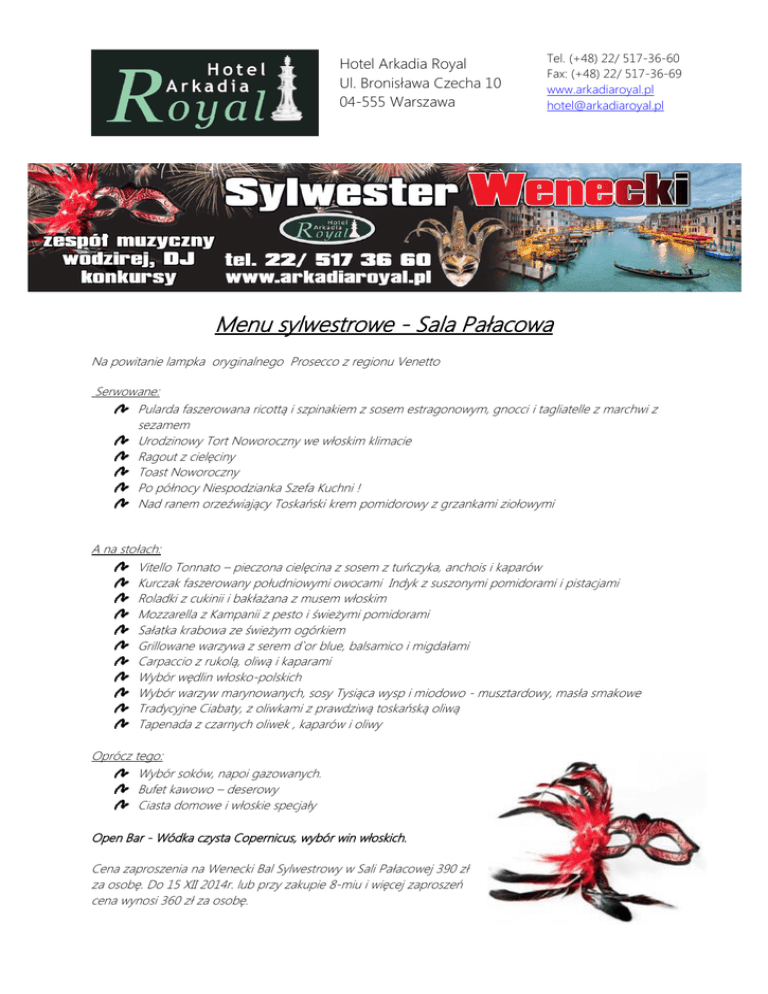 Hotel Arkadia Royal Ul. Bronisława Czecha 10 04-555 Warszawa Tel. (+48) 22/ 517-36-60 Fax: (+48) 22/ 517-36-69 www.arkadiaroyal.pl [email protected] Menu sylwestrowe - Sala Pałacowa Na powitanie lampka oryginalnego Prosecco z regionu Venetto Serwowane: Pularda faszerowana ricottą i szpinakiem z sosem estragonowym, gnocci i tagliatelle z marchwi z sezamem Urodzinowy Tort Noworoczny we włoskim klimacie Ragout z cielęciny Toast Noworoczny Po północy Niespodzianka Szefa Kuchni ! Nad ranem orzeźwiający Toskański krem pomidorowy z grzankami ziołowymi A na stołach: Vitello Tonnato – pieczona cielęcina z sosem z tuńczyka, anchois i kaparów Kurczak faszerowany południowymi owocami Indyk z suszonymi pomidorami i pistacjami Roladki z cukinii i bakłażana z musem włoskim Mozzarella z Kampanii z pesto i świeżymi pomidorami Sałatka krabowa ze świeżym ogórkiem Grillowane warzywa z serem d`or blue, balsamico i migdałami Carpaccio z rukolą, oliwą i kaparami Wybór wędlin włosko-polskich Wybór warzyw marynowanych, sosy Tysiąca wysp i miodowo - musztardowy, masła smakowe Tradycyjne Ciabaty, z oliwkami z prawdziwą toskańską oliwą Tapenada z czarnych oliwek , kaparów i oliwy Oprócz tego: Wybór soków, napoi gazowanych. Bufet kawowo – deserowy Ciasta domowe i włoskie specjały Open Bar - Wódka czysta Copernicus, wybór win włoskich. Cena zaproszenia na Wenecki Bal Sylwestrowy w Sali Pałacowej 390 zł za osobę. Do 15 XII 2014r. lub przy zakupie 8-miu i więcej zaproszeń cena wynosi 360 zł za osobę.