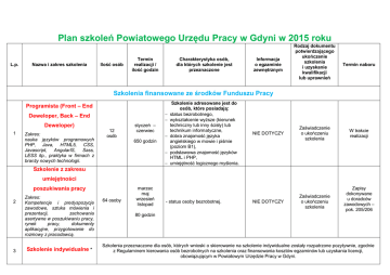Plan szkoleń Powiatowego Urzędu Pracy w Gdyni w 2015 roku L.p. Nazwa i zakres szkolenia Ilość osób Termin realizacji / ilość godzin Charakterystyka osób, dla których szkolenie jest przeznaczone Informacja o egzaminie zewnętrznym Rodzaj dokumentu potwierdzającego ukończenie szkolenia i uzyskanie kwalifikacji lub uprawnień Termin naboru Szkolenia finansowane ze środków Funduszu Pracy Programista (Front – End Deweloper, Back – End Deweloper) 1 Zakres: nauka języków programowych PHP, Java, HTML5, CSS, Javascript, AngularIS, Sass, LESS itp., praktyka w firmach z branży nowych technologii. 12 osób styczeń – czerwiec 650 godzin Szkolenie adresowane jest do osób, które posiadają: status bezrobotnego, wykształcenie wyższe (kierunek techniczny lub inny ścisły) lub technikum informatyczne, dobra znajomość języka angielskiego w mowie i piśmie (poziom B1), podstawowa znajomość języków HTML i PHP, umiejętność logicznego myślenia. NIE DOTYCZY Zaświadczenie o ukończeniu szkolenia W trakcie realizacji Szkolenie z zakresu umiejętności poszukiwania pracy 2 3 Zakres: Kompetencje i predyspozycje zawodowe, sztuka mówienia i prezentacji, zachowania asertywne w poszukiwaniu pracy, rynek pracy, dokumenty aplikacyjne, przygotowanie do rozmowy z pracodawcą. Szkolenie indywidualne * 64 osoby marzec maj wrzesień listopad - status osoby bezrobotnej. NIE DOTYCZY Zaświadczenie o ukończeniu szkolenia Zapisy dokonywane u doradców zawodowych – pok. 205/206 80 godzin Szkolenia przeznaczone dla osób, których wnioski o skierowanie na szkolenie indywidualne zostały rozpatrzone pozytywnie, zgodnie z Regulaminem kierowania osób bezrobotnych na szkolenia oraz finansowania kosztów egzaminów lub uzyskania licencji, obowiązującym w Powiatowym Urzędzie Pracy w Gdyni. Szkolenia finansowane ze środków Funduszu Pracy w ramach Programu Regionalnego adresowane do: osób zarejestrowanych w Powiatowym Urzędzie Pracy w Gdyni, należących do II profilu pomocy. W pierwszej kolejności rekrutowane będą: osoby bez kwalifikacji zawodowych, osoby bez doświadczenia zawodowego, osoby bez wykształcenia średniego, absolwenci, w tym osoby, które ukończyły szkołę wyższą, inne osoby o kwalifikacjach niedopasowanych do rynku pracy. II/III/IV kwartał II/III/IV kwartał Bony szkoleniowe dla 4 osób do 30 roku życia Zakres uzależniony jest od rodzaju wnioskowanych szkoleń. 10 osób Ilość godzin uzależniona jest od rodzaju wnioskowa nych szkoleń Brak dodatkowych wymagań. Rodzaj egzaminu uzależniony jest od wnioskowanych szkoleń. Rodzaj zaświadczenia uzależniony jest od wnioskowanych szkoleń. Szczegółowe informacje o terminie naboru zamieszczone zostaną na stronie internetowej (www.pupgdynia. pl) oraz w miejscu ogólnodostępnym w siedzibie Urzędu II kwartał Nowoczesny sprzedawca 5 Zakres: obsługa kas fiskalnych, fakturowanie, profesjonalna obsługa klienta, aktywna sprzedaż, merchandising, obsługa wózków widłowych i paletowych. czerwiec lipiec 10 157 godzin Dodatkowo szkolenie adresowane jest do osób posiadających min. wykształcenie zasadnicze zawodowe oraz dobry stan zdrowia. Egzamin państwowy przeprowadzany przez uprawnioną instytucję zewnętrzną Zaświadczenie o ukończeniu szkolenia Zezwolenie na kierowanie wózkami jezdniowymi. Szczegółowe informacje o terminie naboru zamieszczone zostaną na stronie internetowej (www.pupgdynia. pl) oraz w miejscu ogólnodostępnym w siedzibie Urzędu II/III kwartał 6 Kurs spawania metodą MAG (proces 136) – moduł I i II - z egzaminem DNV 10 osób lipiec - sierpień 256 godzin Zakres: spawanie blach i rur metodą MAG. Dodatkowo szkolenie adresowane jest do osób posiadających dobry stan zdrowia. Egzamin DNV Zaświadczenie o ukończeniu szkolenia Certyfikat DNV Szczegółowe informacje o terminie naboru zamieszczone zostaną na stronie internetowej (www.pupgdynia. pl) oraz w miejscu ogólnodostępnym w siedzibie Urzędu II kwartał 7 Kurs spawania metodą TIG (proces 141) – moduł I, II i III - z egzaminem DNV Zakres: spawanie blach i rur metodą TIG. 10 osób maj - czerwiec 256 godzin Dodatkowo szkolenie adresowane jest do osób posiadających dobry stan zdrowia. Egzamin DNV Zaświadczenie o ukończeniu szkolenia Certyfikat DNV Szczegółowe informacje o terminie naboru zamieszczone zostaną na stronie internetowej (www.pupgdynia. pl) oraz w miejscu ogólnodostępnym w siedzibie Urzędu Szkolenia finansowane ze środków Europejskiego Funduszu Społecznego w ramach Programu Operacyjnego PO WER adresowane do: osób w wieku 18 – 29 lat zarejestrowanych w Powiatowym Urzędzie Pracy w Gdyni, należących do I lub II profilu pomocy, i będących tzw. młodzieżą NEET, tzn. nie pracującą (bezrobotną lub bierną zawodowo – zarejestrowaną w PUP), nie kształcącą się (nie uczestniczącą w kształceniu formalnym w trybie stacjonarnym), nie szkolącą się (nie uczestniczącą w pozaszkolnych zajęciach mających na celu uzyskanie, uzupełnienie lub doskonalenie kwalifikacji zawodowych w okresie ostatnich 4 tygodni). Dodatkowo: osoby w wieku 18 – 25 lat zarejestrowane nie dłużej niż 4 miesiące, osoby w wieku 25 – 29 lat bez względu na długość rejestracji. W pierwszej kolejności rekrutowane będą: osoby długotrwale bezrobotne: osoby w wieku 18 – 25 lat zarejestrowane nieprzerwanie przez okres ponad 6 miesięcy osoby w wieku 25 – 29 lat zarejestrowane nieprzerwanie przez okres ponad 12 miesięcy. osoby niepełnosprawne, osoby o niskich kwalifikacjach (ukończona szkoła podstawowa, gimnazjum lub szkoła ponadgimnazjalna). II/III kwartał Nowoczesny sprzedawca 8 Zakres: obsługa kas fiskalnych, fakturowanie, profesjonalna obsługa klienta, aktywna sprzedaż, merchandising, obsługa wózków widłowych i paletowych. 10 osób wrzesień październik Dodatkowo szkolenie adresowane jest do osób posiadających min. wykształcenie zasadnicze zawodowe oraz dobry stan zdrowia. 157 godzin Z