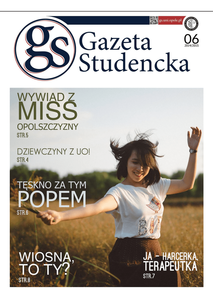 02 MARCIN ZAKRZEWSKI KATARZYNA KAŁA Słucham nowej płyty O.S.T.R - zapraszam do przeczytania recenzji Pana Szymona Kopca w tym numerze! Czytam „Czerwone Noce” Cybulskiego, książka o jakże kontrowersyjnym temacie - walce z nacjonalistycznymi bandami UPA w okresie okupacji hitlerowskiej. Oglądałem „W drodze do Jah”, dziwny film.. trochę o reggae, trochę o Jamajce, lekko brakuje tu spójności. Ostatnio nałogowo słucham i oglądam teledysk do „Sugar” Maroon 5. Która z nas nie życzyłaby sobie Adama Levine śpiewającego na naszej imprezie? Ostatnio czytałam „Niewiernego” Diane Brasseur - historię dojrzałego mężczyzny, który nie potrafi zostawić swojej kochanki, jednocześnie nie chce też rozwieść się z żoną. Świetnie się czyta. Jestem w trakcie oglądania trzeciego sezonu „House of Cards” i jeśli jeszcze nie widzieliście poprzednich dwóch, to zapewniam, że warto nadrobić i płynnie przejść do najnowszych odcinków! BARTEK PIĄTKOWSKI ASIA GERLICH Słuchałem: Alestorm - Captain Morgan’s Revenge. Się zdziwiłem, że jest gatunek, który nazywa się pirate metal. Czytałem: Młot na Czarownice. Jako ciekawostka historyczna bardzo przyjemna lektura, można się dowiedzieć wielu interesujących rzeczy o mentalności ludzi ery średniowiecza. Oglądałem: Na skraju jutra. Całkiem porządne SF z Tomem Cruisem w roli głównej. Ostatnio słucham Piha, „Tak mało czasu” non stop krąży po mojej głowie i sprawia, że mam ciary na plecach. Czytałam „Szczęście pachnące wanilią” o kobiecej pasji, sile i solidarności. Oglądałam 15 minut „Tańca z gwiazdami”, przereklamowany format, ale tańczącego Grzegorza Łapanowskiego musiałam obejrzeć. PATRYCJA WOŹNIAK MILENA JANCZAK Słucham całych albumów Linkin Park poznaje zespół od kuchni. Obejrzałam film „Fala”(2008), który pokazuje jak autokracja może wpłynąć na dzisiejsze uprzedzone społeczeństwo. Przeczytałam „Nagrody Darwina”- Wendy Northcutt. Krótkie historyjki o tym jak nie umierać, czyli nietypowe zgony świata. Słuchałam: ,,Scarborough Fair”. Wszystkich wersji: od najbardziej znanej Simona i Garfunkela, po zupełnie mroczną My Dying Bride. Z pełną świadomością mogę polecić tę piosenkę w wykonaniu Sarah Brightman. Piękna pieśń w jeszcze piękniejszej interpretacji. Czytałam: a właściwie ciągle czytam ,,Annę Kareninę” Lwa Tołstoja. Wciągająca, przyjemna, skłaniająca do refleksji. Klasyka. Oglądałam: na szklany ekran niestety brakło już czasu. ANIA GAUZA PAMELA OTWINOWSKA Ostatnio miałam w ręku klasykę powieści francuskiej „Dama Kameliowa” - książka o nieszczęśliwej miłości, poświęceniu i utraconym szczęściu. Idealna dla fanów melodramatów. Oglądałam drugi sezon „Brooklyn nine-nine” - komedia kryminalna na odprężenie i wyluzowanie po ciężkim dniu. Słuchałam: „Mind How You Go” (2006) debiutancka płyta Skye – polecam wszystkim samotnikom. Nieustannie wsłuchuję się w muzykę Izy Lach (znaną głównie z duetu ze Snoop Doggiem) i wciąż odkrywam każdy bit na nowo. Wczytywałam się z wielkim zainteresowaniem w bloga Michała Pasterskiego. Polecam osobom, które chcą skończyć z chroniczną prokrastynacją i zgłębić temat motywacji oraz autorozwoju. Oglądałam: „Miasto 44”. Scena pocałunku wśród kul słusznie zasłużyła na nominację Węży w kategorii efekty specjalnej troski. Ten numer zdecydowaliśmy się poświęcić kobietom. Po pierwsze ze względu na ich niedawne święto. Po drugie ponieważ pierwszy numer tematyczny był bardzo męski, więc teraz zachowamy równowagę. Staraliśmy się znaleźć i pokazać Wam jak najwięcej ciekawych studentek. Porozmawialiśmy z dziewczynami, które spotykacie codziennie na zajęciach, w kolejce do dziekanatu lub mijacie gdzieś na kampusie, a nawet nie zdajecie sobie sprawy z tego jak fascynującymi osobami są! Nasi publicyści starali się pokazać jak bardzo niezwykłe są w ich oczach kobiety, a ja myślę, że naprawdę nieźle im się to udało! Zachęcam was do odszukania waszych koleżanek na zdjęciach, które niedługo staną się częścią naszego nowego projektu. Od dziecka byłam nauczona samodzielności. Dziadek miał zawsze naszykowany dla mnie mały młotek, imadło i piłę bym mogła mu pomagać przy pracy. Jak skończyłam sześć lat to zrobił nawet dla mnie małą czerwoną taczkę dzięki której czułam się naprawdę ważna! Nadal nie potrzebuję pomocy przy wbijaniu gwoździ czy pompowaniu koła w rowerze. Nie oznacza to jednak, że nie jest mi miło gdy ktoś przepuści mnie w drzwiach;) Często słyszę, że kobiety mają w życiu łatwiej. Że jak mają z czymś problem lub potrzebują coś załatwić to wystarczy, że założą bluzkę z większym dekoltem, a sprawa „jakoś” się rozwiąże. Tymczasem zazwyczaj jak dziewczyna jest ładna to tylko nienawistne i zazdrosne spojrzenia łapie. Zdarzały mi się egzaminy na studiach, o których starsi koledzy mówili, że wykładowczyni nie lubi dziewczyn i jeżeli już jakaś ma zdać to tylko taka skromnie ubrana i niepomalowana. Wszystkie więc solidarnie wiązałyśmy włosy, zakładałyśmy płaskie buty oraz białe koszule. Zdałyśmy. 03 O STUDIACH ZE STUDENTAMI - PRAWO MARCIN ZAKRZEWSKI Jesteś przed wyborem studiów? Wybrałeś źle i chcesz odmienić swój los? „O studiach ze studentami” to nowy cykl rozmów z żakami o ich kierunkach, studiowaniu ich formie, plusach czy minusach. Pierwszym badanym przez nas kierunkiem będzie prawo. W świecie studenckim i nie tylko panuje przeświadczenie, że aby zostać prawnikiem trzeba mieć ojca z własną kancelarią albo dobrą ciocię, która załatwi nam ciepłą posadę w sądzie. Czy tak naprawdę jest? Czy Uniwersytet Opolski ma dobry odbiór wśród pracodawców? Warto studiować prawo skoro do naboru zgłaszają się ogromne liczby ludzi? Na te i inne pytania przeczytacie w