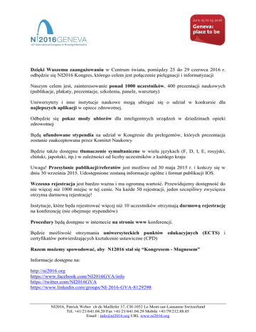 Dzięki Waszemu zaangażowaniu w Centrum świata, pomiędzy 25 do 29 czerwca 2016 r. odbędzie się NI2016 Kongres, którego celem jest połączenie pielęgnacji i informatyzacji Naszym celem jest, zainteresowanie ponad 1000 uczestników, 400 prezentacji naukowych (publikacje, plakaty, prezentacje, szkolenia, panele, warsztaty) Uniwersytety i inne instytucje naukowe mogą ubiegać się o udział w konkursie dla najlepszych aplikacji w opiece zdrowotnej. Odbędzie się pokaz mody ubiorów dla inteligentnych urządzeń w dziedzinach opieki zdrowotnej Będą ufundowane stypendia na udział w Kongresie dla prelegentów, których prezentacja zostanie zaakceptowana przez Komitet Naukowy Będzie także dostępne tłumaczenie symultaniczne w wielu językach (F, D, I, E, rosyjski, chiński, japoński, itp.) w zależności od liczby uczestników z każdego kraju Uwaga! Przesyłanie publikacji/referatów jest możliwe od 30 maja 2015 r. i kończy się w dniu 30 września 2015. Udostępnione zostaną informacje ogólne i format publikacji IOS. Wczesna rejestracja jest bardzo ważna i ma ogromną wartość. Przewidujemy dostępność do nie więcej niż 1000 miejsc w tej cenie. Na każde 50 rejestracji, jeden szczęśliwy zwycięzca otrzyma darmową rejestrację! Instytucje, które będa rejestrować więcej niż 10 uczestników otrzymają darmową rejestrację na konferencję (nie obejmuje stypendiów) Procedury będą dostępne w internecie na stronie www konferencji. Będzie możliwość otrzymania uniwersyteckich punktów edukacyjnych (ECTS) i certyfikatów potwierdzających kształcenie ustawiczne (CPD) Razem możemy spowodować, aby N12016 stał się “Kongresem - Magnesem” Informacje dostępne na: http://ni2016.org https://www.facebook.com/NI2016GVA/info https://twitter.com/NI2016GVA https://www.linkedin.com/groups/NI-2016-GVA-8129298 NI2016, Patrick Weber ch de Maillefer 37, CH-1052 Le Mont-sur-Lausanne Switzerland Tél. +41/21/641.04.20 Fax +41/21/641.04.29 Mobile +41/79/212.88.85 Email : [email protected] URL www.ni2016.org
