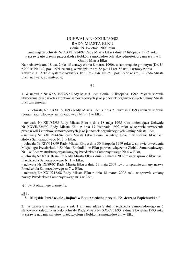 UCHWAŁA Nr XXIII/230/08 RADY MIASTA EŁKU z dnia 29 kwietnia 2008 roku zmieniająca uchwałę Nr XXVII/224/92 Rady Miasta Ełku z dnia 17 listopada 1992 roku w sprawie utworzenia przedszkoli i żłobków samorządowych jako jednostek organizacyjnych Gminy Miasta Ełku Na podstawie art. 18 ust. 2 pkt 15 ustawy z dnia 8 marca 1990r. o samorządzie gminnym (Dz. U. z 2001r. Nr 142, poz. 1591 ze zm.), w związku z art. 5c pkt 1 i art. 58 ust. 1 ustawy z dnia 7 września 1991r. o systemie oświaty (Dz. U. z 2004r. Nr 256, poz. 2572 ze zm.) – Rada Miasta Ełku uchwala, co następuje: §1 1. W uchwale Nr XXVII/224/92 Rady Miasta Ełku z dnia 17 listopada 1992 roku w sprawie utworzenia przedszkoli i żłobków samorządowych jako jednostek organizacyjnych Gminy Miasta Ełku zmienionej: - uchwałą Nr XXXIII/280/93 Rady Miasta Ełku z dnia 21 września 1993 roku w sprawie reorganizacji żłobków samorządowych Nr 2 i 3 w Ełku, - uchwałą Nr XIII/82/95 Rady Miasta Ełku z dnia 18 maja 1995 roku zmieniająca Uchwałę Nr XXVII/224/92 Rady Miasta Ełku z dnia 17 listopada 1992 roku w sprawie utworzenia przedszkoli i żłobków samorządowych jako jednostek organizacyjnych Gminy Miasta Ełku, - uchwałą Nr XXIII/144/96 Rady Miasta Ełku z dnia 14 lutego 1996 r. w sprawie likwidacji żłobka Samorządowego Nr 3 w Ełku, - uchwałą Nr XIV/118/99 Rady Miasta Ełku z dnia 30 listopada 1999 roku w sprawie utworzenia Miejskiego Przedszkola i Żłobka „Ekoludki” w Ełku poprzez włączenie Żłobka Samorządowego Nr 1 w Ełku w strukturę organizacyjną Przedszkola Samorządowego Nr 4 w Ełku, - uchwałą Nr XXXIII/347/02 Rady Miasta Ełku z dnia 25 marca 2002 roku w sprawie likwidacji Przedszkola Samorządowego Nr 1 w Ełku, - uchwałą Nr IX/89/07 Rady Miasta Ełku z dnia 29 maja 2007 roku w sprawie zmiany nazwy Przedszkola Samorządowego nr 7 w Ełku, - uchwałą Nr XXII/216/08 Rady Miasta Ełku z dnia 18 marca 2008 roku w sprawie zmiany nazwy Przedszkola Samorządowego nr 3 w Ełku, § 1 pkt 5 otrzymuje brzmienie: „§ 1. 5. Miejskie Przedszkole „Bajka” w Ełku z siedzibą przy ul. Ks. Jerzego Popiełuszki 6.” 2. W zakresie wynikającym z ust. 1 zmianie ulega Statut Przedszkola Samorządowego nr 5 stanowiący załącznik nr 5 do uchwały Rady Miasta Nr XXX/251/93 z dnia 2 kwietnia 1993 roku w sprawie nadania statutów przedszkolom i żłobkom samorządowym w Ełku. §2 Wykonanie uchwały powierza się Prezydentowi Miasta Ełku. §3 Uchwała wchodzi w życie z dniem podjęcia. Przewodniczący Rady Miasta Ełku Waldemar Paweł Pieńkowski Uzasadnienie do projektu uchwały Rady Miasta Ełku w sprawie zmiany nazwy Przedszkola Samorządowego Nr 5 w Ełku. Podstawę prawną do zmiany nazwy przedszkola publicznego stanowią przepisy ustawy o systemie oświaty oraz Statut Przedszkola Samorządowego nr 5 w Ełku. Właściwym organem gminy do zmiany nazwy przedszkola publicznego jest rada gminy. W celu zmiany nazwy przedszkola – organy wewnętrzne przedszkola (Dyrektor, Rada Pedagogiczna, Rada Rodziców) zgodnie z obowiązującym Statutem przedszkola podjęły odpowiednią procedurę. Dyrektor Przedszkola Samorządowego w Ełku wystąpił z wnioskiem do Prezydenta Miasta Ełku o podjęcie procedury dotyczącej zmiany nazwy przedszkola. W okresie poprzedzającym złożenie wniosku Przedszkole Samorządowe nr 5 wykonało czynności i prace przygotowawcze związane ze zmianą nazwy. W tok prac przygotowawczych została włączona cała społeczność przedszkola, tj. pracownicy przedszkola pedagogiczni i niepedagogiczni, rodzice dzieci uczęszczających do przedszkola oraz wychowankowie przedszkola. W wyniku prac przygotowawczych została zaproponowana zmiana nazwy przedszkola z obecnej: Przedszkole Samorządowe nr 5 w Ełku – na Miejskie Przedszkole „Bajka”. Wnioskodawcy dokonali wyboru nowej nazwy w sposób demokratyczny i wybór ten uzasadnili. Wybór takiej nazwy związany jest z pracą dydaktyczno-wychowawczą placówki. Szczegółowa dokumentacja związana z procedurą zmiany nazwy znajduje się w placówce. W opinii Wydziału Edukacji poprzez zmianę swoich nazw – miejskie przedszkola publiczne wypracowują pewien swoisty charakter działalności, a także identyfikują się z nazwą oraz podejmują stosowne działania dydaktyczno - wychowawcze. Należy nadmienić, iż podążanie przedszkoli miejskich w kierunku przyjmowania nazwy własnej ma także charakter porządkujący placówki na mapie edukacyjnej Ełku. Wszystkie funkcjonujące w Ełku przedszkola publiczne są przedszkolami samorządowymi i w swojej nazwie zawierają zazwyczaj kolejny numer porządkowy. Obecnie proponowane zmiany nazwy polegają m.in. na zastąpieniu w dotychczasowej nazwie „Przedszkole Samorządowe ....” na „Miejskie Przedszkole ....”. Nazwy własne posiadają już przedszkola: „Ekoludki”, „Mali Odkrywcy” i „Niezapominajka”. Na podstawie obserwacji Wydziału Edukacji i uwag Dyrektorów przedszkoli można wywnioskować, iż w odbiorze społecznym chętniej przyjmowana i akceptowana jest nazwa własna nie zawierająca numeru porządkowego. Przewiduje się, iż w najbliższym czasie pozostałe przedszkola, tj. nr 6 i 8 podejmą prace przygotowawcze w celu zmiany nazwy. Podjęcie przez Radę Miasta Ełku przedmiotowej uchwały wywołuje skutek finansowy związany z poniesieniem wydatków na zmianę szyldu i pieczęci przedszkola (z budżetu przedszkola). Ełk, 10.04.2008, sporządziła U. Dobrowolska