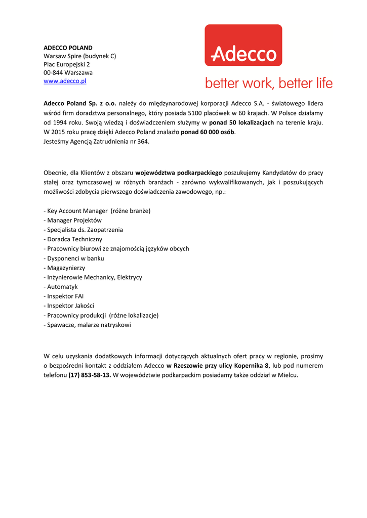 ADECCO POLAND Warsaw Spire (budynek C) Plac Europejski 2 00-844 Warszawa www.adecco.pl Adecco Poland Sp. z o.o. należy do międzynarodowej korporacji Adecco S.A. - światowego lidera wśród firm doradztwa personalnego, który posiada 5100 placówek w 60 krajach. W Polsce działamy od 1994 roku. Swoją wiedzą i doświadczeniem służymy w ponad 50 lokalizacjach na terenie kraju. W 2015 roku pracę dzięki Adecco Poland znalazło ponad 60 000 osób. Jesteśmy Agencją Zatrudnienia nr 364. Obecnie, dla Klientów z obszaru województwa podkarpackiego poszukujemy Kandydatów do pracy stałej oraz tymczasowej w różnych branżach - zarówno wykwalifikowanych, jak i poszukujących możliwości zdobycia pierwszego doświadczenia zawodowego, np.: - Key Account Manager (różne branże) - Manager Projektów - Specjalista ds. Zaopatrzenia - Doradca Techniczny - Pracownicy biurowi ze znajomością języków obcych - Dysponenci w banku - Magazynierzy - Inżynierowie Mechanicy, Elektrycy - Automatyk - Inspektor FAI - Inspektor Jakości - Pracownicy produkcji (różne lokalizacje) - Spawacze, malarze natryskowi W celu uzyskania dodatkowych informacji dotyczących aktualnych ofert pracy w regionie, prosimy o bezpośredni kontakt z oddziałem Adecco w Rzeszowie przy ulicy Kopernika 8, lub pod numerem telefonu (17) 853-58-13. W województwie podkarpackim posiadamy także oddział w Mielcu.