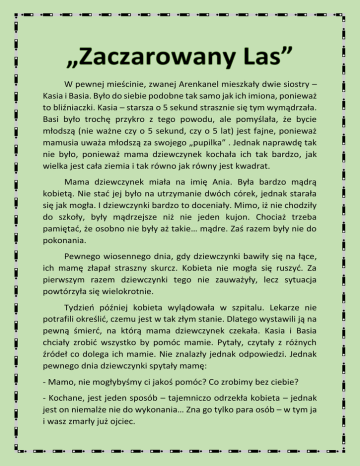 W pewnej mieścinie, zwanej Arenkanel mieszkały dwie siostry – Kasia i Basia. Było do siebie podobne tak samo jak ich imiona, ponieważ to bliźniaczki. Kasia – starsza o 5 sekund strasznie się tym wymądrzała. Basi było trochę przykro z tego powodu, ale pomyślała, że bycie młodszą (nie ważne czy o 5 sekund, czy o 5 lat) jest fajne, ponieważ mamusia uważa młodszą za swojego „pupilka” . Jednak naprawdę tak nie było, ponieważ mama dziewczynek kochała ich tak bardzo, jak wielka jest cała ziemia i tak równo jak równy jest kwadrat. Mama dziewczynek miała na imię Ania. Była bardzo mądrą kobietą. Nie stać jej było na utrzymanie dwóch córek, jednak starała się jak mogła. I dziewczynki bardzo to doceniały. Mimo, iż nie chodziły do szkoły, były mądrzejsze niż nie jeden kujon. Chociaż trzeba pamiętać, że osobno nie były aż takie… mądre. Zaś razem były nie do pokonania. Pewnego wiosennego dnia, gdy dziewczynki bawiły się na łące, ich mamę złapał straszny skurcz. Kobieta nie mogła się ruszyć. Za pierwszym razem dziewczynki tego nie zauważyły, lecz sytuacja powtórzyła się wielokrotnie. Tydzień później kobieta wylądowała w szpitalu. Lekarze nie potrafili określić, czemu jest w tak złym stanie. Dlatego wystawili ją na pewną śmierć, na którą mama dziewczynek czekała. Kasia i Basia chciały zrobić wszystko by pomóc mamie. Pytały, czytały z różnych źródeł co dolega ich mamie. Nie znalazły jednak odpowiedzi. Jednak pewnego dnia dziewczynki spytały mamę: - Mamo, nie mogłybyśmy ci jakoś pomóc? Co zrobimy bez ciebie? - Kochane, jest jeden sposób – tajemniczo odrzekła kobieta – jednak jest on niemalże nie do wykonania… Zna go tylko para osób – w tym ja i wasz zmarły już ojciec. - Co mamy zrobić – odpowiedziały zgodnym tonem dziewczynki. - Musicie iść do zaczarowanego lasu po złote jabłko – powiedziała matka. - Gdzie on jest? – zapytała Kasia - Tego nie wiem, ale znajdziecie podpowiedź… Jednak nie wiem gdzie ona jest. - Czyli jak mamy ją znaleźć? – zapytała zrozpaczona Basia. - Otwórzcie oczy, a znajdziecie. Dziewczynki szukały całe dnie i noce. Aż w końcu zawaliła się ściana, w której była podpowiedź. Brzmiała ona tak: „Miejsce to jest bardzo odległe, jednak jest blisko. Byłyście w nim nieraz, jednak ani razu w dzień. By do niego dojść, musicie pokonać własne lęki, ale czystym osobom uda się to bez problemu.” Gdy dziewczynki przeczytały ten tekst, Basia zakrzyknęła radosnym głosem: - To znaczy, że mamy się umyć i już będziemy na miejscu?! - Myślę, że to ma głębszy sens. Musimy się przespać z tą myślą – odpowiedziała Kasia i jak powiedziała, tak zrobiła. Całą noc dziewczynką śnił się ten sam sen. Przemierzały one odległą krainę i stawiały czoła swoim lękom. Gdy się obudziły, zrozumiały sens zagadki. Zrozumiały, że to miejsce z ich snu to miejsce, do którego mają się udać. Wiedziały, że czeka je pełna przygód podróż. […] Epilog Dziewczynkom udało się uratować mamę, ponieważ znalazły Złote Jabłko w Zaczarowanym Lesie. Wszyscy żyli długo i szczęśliwie. Zuzanna