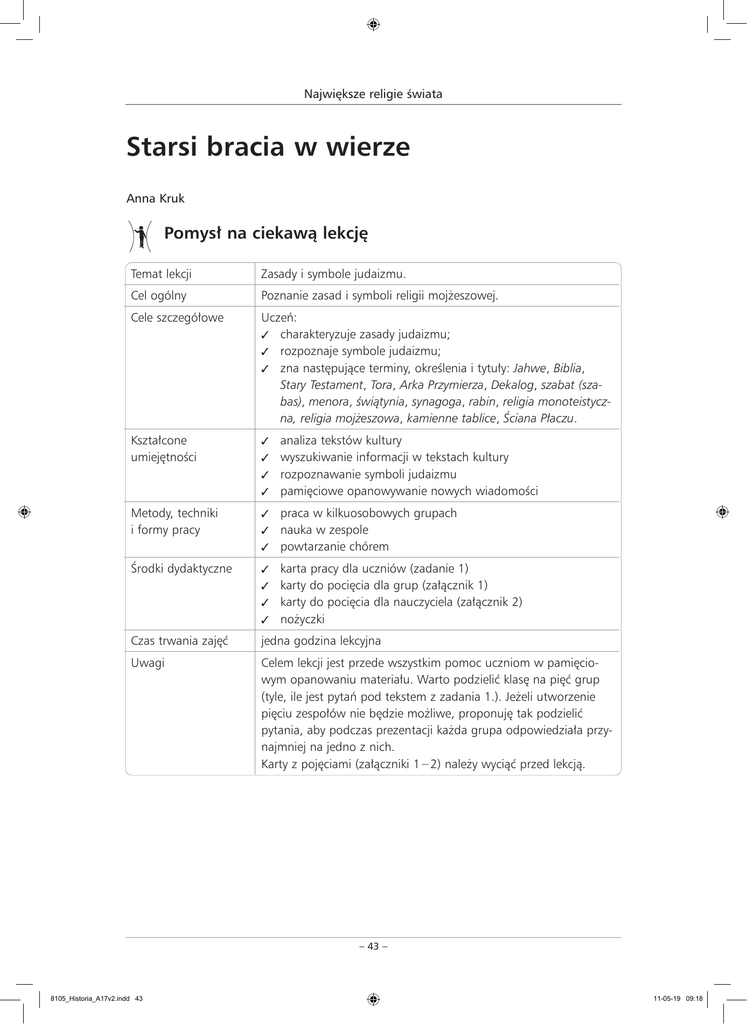 Największe religie świata Starsi bracia w wierze Anna Kruk Pomysł na ciekawą lekcję Temat lekcji Zasady i symbole judaizmu. Cel ogólny Poznanie zasad i symboli religii mojżeszowej. Cele szczegółowe Uczeń: ✓✓ charakteryzuje zasady judaizmu; ✓✓ rozpoznaje symbole judaizmu; ✓✓ zna następujące terminy, określenia i tytuły: Jahwe, Biblia, Stary Testament, Tora, Arka Przymierza, Dekalog, szabat (szabas), menora, świątynia, synagoga, rabin, religia monoteistyczna, religia mojżeszowa, kamienne tablice, Ściana Płaczu. Kształcone umiejętności ✓✓ Metody, techniki i formy pracy ✓✓ Środki dydaktyczne ✓✓ Czas trwania zajęć jedna godzina lekcyjna Uwagi Celem lekcji jest przede wszystkim pomoc uczniom w pamięciowym opanowaniu materiału. Warto podzielić klasę na pięć grup (tyle, ile jest pytań pod tekstem z zadania 1.). Jeżeli utworzenie pięciu zespołów nie będzie możliwe, proponuję tak podzielić pytania, aby podczas prezentacji każda grupa odpowiedziała przynajmniej na jedno z nich. Karty z pojęciami (załączniki 1−2) należy wyciąć przed lekcją. analiza tekstów kultury wyszukiwanie informacji w tekstach kultury ✓✓ rozpoznawanie symboli judaizmu ✓✓ pamięciowe opanowywanie nowych wiadomości ✓✓ praca w kilkuosobowych grupach nauka w zespole ✓✓ powtarzanie chórem ✓✓ karta pracy dla uczniów (zadanie 1) ✓✓ karty do pocięcia dla grup (załącznik 1) ✓✓ karty do pocięcia dla nauczyciela (załącznik 2) ✓✓ nożyczki – 43 – 8105_Historia_A17v2.indd 43 11-05-19 09:18 Największe religie świata Przebieg zajęć Etapy lekcji Czas w minutach Czynności nauczyciela i uczniów Wprowadzenie 5 Informujemy uczniów, że na lekcji poznają zasady i symbole pierwszej religii monoteistycznej – judaizmu, czyli religii żydowskiej. Przypominamy, że z judaizmu wywodzą się chrześcijaństwo i islam. Podkreślamy, że nadal na świecie żyje wielu jego wyznawców. Następnie dzielimy klasę na kilkuosobowe zespoły. Badanie (I) i przekształcanie (I) 9 Przypominamy, że według Biblii Starego Testamentu, świętej ksiegi judaizmu, Bóg objawił się przywódcy Izraelitów, prorokowi Abrahamowi w XVIII w. p.n.e. Zakazał mu czcić inne bóstwa poza nim, a w zamian obiecał liczne potomstwo i władzę nad Ziemią Obiecaną (Palestyną), do której po 40-letniej wędrówce Abraham przyprowadził z Mezopotamii swoje plemię, nazwane później od imienia jego potomka plemieniem Izraela. Religia żydowska kształtowała się przez wieki, główne jej zasady zostały przyjęte przez Mojżesza (w XIII w. p.n.e.), dlatego religię tę nazywamy też mojżeszową. Zasady, czyli 10 przykazań, zawarto w Dekalogu. Rozdajemy grupom karty pracy (zadanie 1) i prosimy o przygotowanie odpowiedzi na przydzielone pytanie. Prezentacja (I) 5 Grupy kolejno odczytują odpowiedzi. Badanie (II) i przekształcanie (II) 9 Wyjaśniamy, że zadanie uczniów będzie polegało na opanowaniu najważniejszych pojęć związanych z judaizmem. Rozdajemy każdej grupie komplet kart (załącznik 1). Prosimy, aby w ciągu 10 minut wszyscy członkowie grupy zapamiętali informacje zawarte w materiałach. Nie zdradzamy, w jaki sposób sprawdzimy efekty pracy grup. Prezentacja (II) 10 Podnosimy kartę z pojęciem bądź ilustracją (załącznik 2), pytamy, co przedstawia karta lub co oznacza zapisane na niej słowo i prosimy członków wskazanej przez nas grupy o udzielenie odpowiedzi chórem na pytanie. Następnie powtarzamy odpowiedź uczniów i pokazujemy kolejną kartę. Zachęcamy grupy do rywalizacji w jak najszybszym udzielaniu odpowiedzi. Podsumowanie 2 Pytamy uczniów, czy – według nich − taki sposób utrwalania wiedzy jest skuteczny. Jeśli tak, to zachęcamy do wspólnej nauki tą metodą. – 44 – 8105_Historia_A17v2.indd 44 11-05-19 09:18 Największe religie świata Zadania dla ucznia 1. Przeczytajcie tekst i przygotujcie ustnie odpowiedź na przydzielone wam pytanie. Dekalog 1. Ja jestem Panem, Bogiem Twoim, który cię wyprowadził z ziemi egipskiej, z domu niewoli. Nie będziesz miał bogów przede mną. 2. Nie czyń sobie obrazu [...] żadnego podobieństwa rzeczy tych, które są na niebie w górze, ani na ziemi nisko i w wodach pod ziemią. Nie będziesz się im kłaniał ani im służył, bo ja jestem Panem, Bogiem twoim [...], który karze nieprawości ojców na synach [...] tych, którzy mnie nienawidzą, a okazuję miłosierdzie tysiącom tych, którzy mnie kochają i strzegą moich przykazań. 3. Nie bierz imienia Pana Boga nadaremno, bo Pan ukarze tego, który imię Jego nadaremno bierze. 4. Pamiętaj święcić dzień odpoczynku. Przez sześć dni pracować będziesz i wykonasz całą pracę swoją, ale dnia siódmego jest odpoczynek Pana Boga twego; nie będziesz wykonywał żadnej pracy [...], bo przez sześć dni stworzył Pan niebo, ziemię, morze i wszystko, co jest, i odpoczął dnia siódmego; dlatego pobłogosławił Pan dzień odpoczynku i poświęcił go. 5. Czcij ojca twego i matkę twoją, aby przedłużone były dni twoje na ziemi, którą Pan, Bóg twój, da tobie. 6. Nie zabijaj. 7. Nie cudzołóż. 8. Nie kradnij. 9. Nie mów fałszywego świadectwa przeciw bliźniemu twemu. 10. Nie pożądaj domu bliźniego twego ani żony bliźniego twego, ani sługi, ani służebnicy jego, ani wołu jego, ani osła jego, ani żadnej rzeczy bliźniego twego. Biblia to jest Pismo Święte Starego i Nowego Testamentu, Warszawa 1989, s. 83. 1. Jakich dwóch sfer dotyczą przykazania? 2. Czego oczekuje Bóg od Izraelitów według Dekalogu? Czy Dekalog można nazwać przymierzem Izraelitów z Bogiem? 3. Dlaczego Bóg nie zgadza się na sporządzanie wizerunków ludzi, zwierząt? Czy w myśl Dekalogu można sporządzać wizerunek Boga? 4. Co to jest szabat? Dlaczego dla Żydów jest taki ważny? 5. Czy przykazania z kamiennych tablic mogą być zaakceptowane także przez wyznawców innych religii i ludzi niewierzących? Je