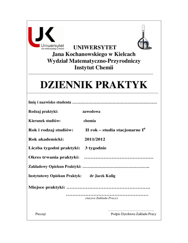 UNIWERSYTET Jana Kochanowskiego w Kielcach Wydział Matematyczno-Przyrodniczy Instytut Chemii ________________________________________________________________________ DZIENNIK PRAKTYK Imię i nazwisko studenta ……………………………………………………… Rodzaj praktyki: zawodowa Kierunek studiów: chemia Rok i rodzaj studiów: II rok – studia stacjonarne I0 Rok akademicki: 2011/2012 Liczba tygodni praktyki: 3 tygodnie Okres trwania praktyki: ……………………………………. Zakładowy Opiekun Praktyki: ………………………………………….. Instytutowy Opiekun Praktyk: dr Jacek Kulig Miejsce praktyki: ……………………………………………. …………………………………………… (nazwa Zakładu Pracy) Pieczęć …………………………………. Podpis Dyrektora Zakładu Pracy ................................................................................................................................................. Nazwa Zakładu Pracy ………………………………………………………………………………………………….. Imię i nazwisko studenta __________________________________________________________________________ KARTA TYGODNIOWA Tydzień od ......................................... 2012r. Dzień (data) Godziny pracy od - do Liczba godzin pracy do .................................... 2012r. Wyszczególnienie zajęć, wykonywane czynności ............................................................................ pieczęć i podpis Zakładowego Opiekuna Praktyki ……………………………………………… pieczątka Zakładu Pracy KARTA INFORMACYJNA (SPRAWOZDANIE) Z PRZEBIEGU PRAKTYKI ZAWODOWEJ STUDENTA UJK Imię i nazwisko studenta:……………………………………..………………………………… Kierunek studiów: Rok i rodzaj studiów: chemia II rok – studia stacjonarne I0 Rok akademicki: 2011/2012 Liczba tygodni praktyki: 3 tygodnie Okres trwania praktyki………………………………………………………………………….. Ocena opisowa: (opis zdobytych umiejętności przez studenta - praktykanta w Zakładzie Pracy) ………………………………………………………………………………………………… ………………………………………………………………………………………………… ………………………………………………………………………………………………… ………………………………………………………………………………………………… ………………………………………………………………………………………………… ………………………………………………………………………………………………… ………………………………………………………………………………………………… ………………………………………………………………………………………………… ………………………………………………………………………………………………… ………………………………………………………………………………………………… ………………………………………………………………………………………………… ………………………………………………………………………………………………… …………………………………………………………………………………………… Ocena ogólna: (Skala ocen: 2 - niedostateczny, 3 - dostateczny, 3,5 - dostateczny plus, 4 - dobry, 4,5 - dobry plus, 5 - bardzo dobry) ………………………………………………………………………………………………… ……..……………………..………………. …………………………………………. podpis Zakładowego Opiekuna Praktvk podpis Dyrektora Zakładu Pracy UWAGI, SPOSTRZEŻENIA, SUGESTIE I WNIOSKI STUDENTA DOTYCZĄCE ODBYTEJ PRAKTYKI CHARAKTERYSTYKA ZDOBYTYCH UMIEJĘTNOŚCI Imię i nazwisko studenta:……………………………………..……………………… ………………………………………………………………………………………………… ………………………………………………………………………………………………… ………………………………………………………………………………………………… ………………………………………………………………………………………………… ………………………………………………………………………………………………… ………………………………………………………………………………………………… ………………………………………………………………………………………………… ………………………………………………………………………………………………… ………………………………………………………………………………………………… ………………………………………………………………………………………………… ………………………………………………………………………………………………… ………………………………………………………………………………………………… ………………………………………………………………………………………………… ………………………................................................................................................................. …………………………………………………………………………………