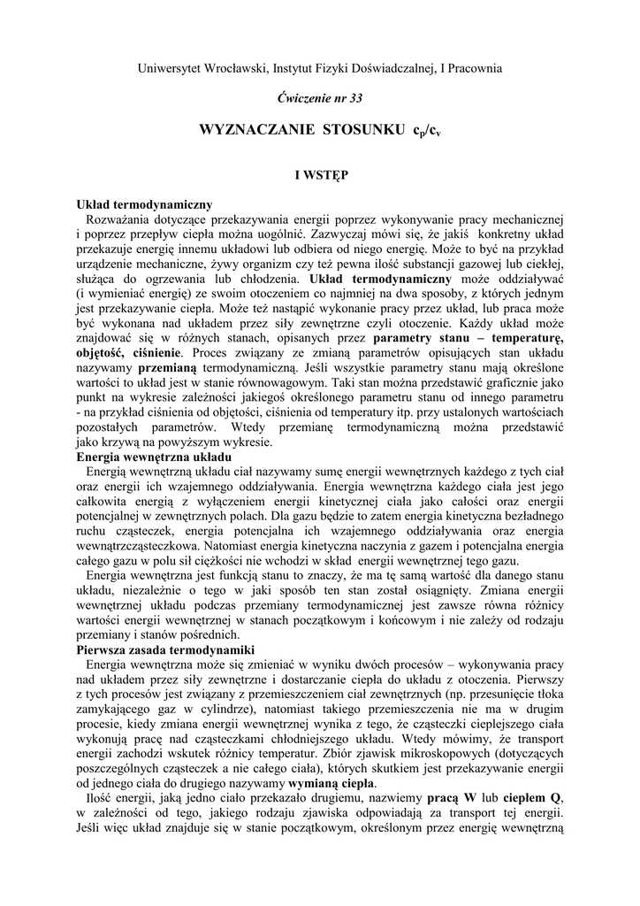 Uniwersytet Wrocławski, Instytut Fizyki Doświadczalnej, I Pracownia Ćwiczenie nr 33 WYZNACZANIE STOSUNKU cp/cv I WSTĘP Układ termodynamiczny Rozważania dotyczące przekazywania energii poprzez wykonywanie pracy mechanicznej i poprzez przepływ ciepła można uogólnić. Zazwyczaj mówi się, że jakiś konkretny układ przekazuje energię innemu układowi lub odbiera od niego energię. Może to być na przykład urządzenie mechaniczne, żywy organizm czy też pewna ilość substancji gazowej lub ciekłej, służąca do ogrzewania lub chłodzenia. Układ termodynamiczny może oddziaływać (i wymieniać energię) ze swoim otoczeniem co najmniej na dwa sposoby, z których jednym jest przekazywanie ciepła. Może też nastąpić wykonanie pracy przez układ, lub praca może być wykonana nad układem przez siły zewnętrzne czyli otoczenie. Każdy układ może znajdować się w różnych stanach, opisanych przez parametry stanu – temperaturę, objętość, ciśnienie. Proces związany ze zmianą parametrów opisujących stan układu nazywamy przemianą termodynamiczną. Jeśli wszystkie parametry stanu mają określone wartości to układ jest w stanie równowagowym. Taki stan można przedstawić graficznie jako punkt na wykresie zależności jakiegoś określonego parametru stanu od innego parametru - na przykład ciśnienia od objętości, ciśnienia od temperatury itp. przy ustalonych wartościach pozostałych parametrów. Wtedy przemianę termodynamiczną można przedstawić jako krzywą na powyższym wykresie. Energia wewnętrzna układu Energią wewnętrzną układu ciał nazywamy sumę energii wewnętrznych każdego z tych ciał oraz energii ich wzajemnego oddziaływania. Energia wewnętrzna każdego ciała jest jego całkowita energią z wyłączeniem energii kinetycznej ciała jako całości oraz energii potencjalnej w zewnętrznych polach. Dla gazu będzie to zatem energia kinetyczna bezładnego ruchu cząsteczek, energia potencjalna ich wzajemnego oddziaływania oraz energia wewnątrzcząsteczkowa. Natomiast energia kinetyczna naczynia z gazem i potencjalna energia całego gazu w polu sił ciężkości nie wchodzi w skład energii wewnętrznej tego gazu. Energia wewnętrzna jest funkcją stanu to znaczy, że ma tę samą wartość dla danego stanu układu, niezależnie o tego w jaki sposób ten stan został osiągnięty. Zmiana energii wewnętrznej układu podczas przemiany termodynamicznej jest zawsze równa różnicy wartości energii wewnętrznej w stanach początkowym i końcowym i nie zależy od rodzaju przemiany i stanów pośrednich. Pierwsza zasada termodynamiki Energia wewnętrzna może się zmieniać w wyniku dwóch procesów – wykonywania pracy nad układem przez siły zewnętrzne i dostarczanie ciepła do układu z otoczenia. Pierwszy z tych procesów jest związany z przemieszczeniem ciał zewnętrznych (np. przesunięcie tłoka zamykającego gaz w cylindrze), natomiast takiego przemieszczenia nie ma w drugim procesie, kiedy zmiana energii wewnętrznej wynika z tego, że cząsteczki cieplejszego ciała wykonują pracę nad cząsteczkami chłodniejszego układu. Wtedy mówimy, że transport energii zachodzi wskutek różnicy temperatur. Zbiór zjawisk mikroskopowych (dotyczących poszczególnych cząsteczek a nie całego ciała), których skutkiem jest przekazywanie energii od jednego ciała do drugiego nazywamy wymianą ciepła. Ilość energii, jaką jedno ciało przekazało drugiemu, nazwiemy pracą W lub ciepłem Q, w zależności od tego, jakiego rodzaju zjawiska odpowiadają za transport tej energii. Jeśli więc układ znajduje się w stanie początkowym, określonym przez energię wewnętrzną 2 U1, to po przejściu do stanu o energii wewnętrznej U2, jego energia wewnętrzna zmieni się o ∆U = U2 – U1. Zatem przyrost energii wewnętrznej układu jest sumą pracy W wykonanej nad układem i ilości ciepła Q dostarczonego do układu: ∆U = Q + W Równanie to, wynikające prawa zachowania energii, stanowi treść pierwszej zasady termodynamiki. Jeśli pracę Wu wykonuje układ nad siłami zewnętrznymi, to w tym równaniu jest ona ujemna i powyższą zasadę można wyrazić słownie – ciepło dostarczone do układu jest zużywane na przyrost jego energii wewnętrznej i na wykonanie przez układ pracy przeciw siłom zewnętrznym: Q = ∆U + Wu gdzie Wu = - W. Ponieważ W i Q są wielkościami algebraicznymi, to Q < 0 oznacza, że układ nie pobiera ciepła, lecz je oddaje otoczeniu. Wykonywanie pracy przez układ czy nad układem wiąże się ze zmianą jego objętości. Dla gazów ta zmiana jest dużo większa niż dla fazy skondensowanej (ciecz, ciało stałe). Ponieważ zmiana objętości wymaga wywarcia ciśnienia p, to wykonaną przy tym pracę można wyrazić jako: W = p ∆V jeśli ciśnienie w czasie przemiany pozostaje stałe a objętość gazu zmienia się od V1 do V2. W ogólnym przypadku należy dokonać całkowania w granicach od V1 do V2: W = ∫p dV Z powyższego można wywnioskować, że gaz podczas rozprężania wykonuje pracę dodatnią zaś siły zewnętrzne ujemną. Praca wykonana nad układem przez siły zewnętrzne jest dodatnia podczas sprężania gazu (objętość gazu maleje). Uwzględnienie tego daje prosty sposób analizy przemian termodynamicznych gazu doskonałego. Równanie stanu gazu doskonałego Stan danej masy gazu jest określony przez wartości ciśnienia p, objętości V i temperatury T. Wzajemną zależność tych parametrów daje równanie stanu. Jeśli oddziaływania pomiędzy cząsteczkami gazu są pomijalnie małe i ponadto zaniedbamy objętość cząsteczek, traktując je jako punkty materialne, to taki gaz nazwiemy doskonałym. Gazy rzeczywiste dostatecznie rozrzedzone (np. powietrze w warunkach normalnych) mają własności zbliżone do gazu doskonałego i dla nich z dużą dokładnością jest spełnione równanie: pV/T = const. Wartość powyższej stałej można obliczyć, korzystając z prawa Avoga
