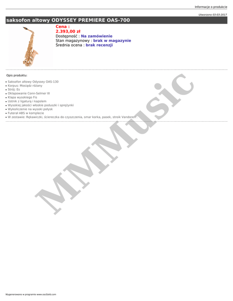 Informacje o produkcie Utworzono 03-03-2017 saksofon altowy ODYSSEY PREMIERE OAS-700 Cena : 2.393,00 zł Dostępność : Na zamówienie Stan magazynowy : brak w magazynie Średnia ocena : brak recenzji Opis produktu: ● ● ● ● ● ● ● M M M ● Saksofon altowy Odyssey OAS-130 Korpus: Mosiądz różany Strój: Es Oklapowanie Conn-Selmer III Klapa wysokiego Fis Ustnik z ligaturą i kapslem Wysokiej jakości włoskie poduszki i sprężynki Wykończenie na wysoki połysk Futerał ABS w komplecie W zestawie: Rękawiczki, ściereczka do czyszczenia, smar korka, pasek, stroik Vandoren . ic ● us ● Wygenerowano w programie www.oscGold.com