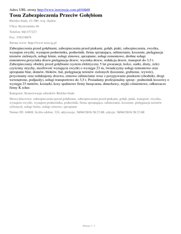Adres URL strony http://www.instytucje.com.pl/44048 Tosu Zabezpieczenia Przeciw Gołębiom Bielsko-biała, 43-309, woj. śląskie Ulica: Bystrzańska 46 Telefon: 601157223 Fax: 338218078 Strona www: http://www.tosu.ig.pl Zabezpieczenia przed gołębiami, zabezpieczenia przed ptakami, gołąb, ptaki, zabezpieczenia, zwyżka, wynajem zwyżki, wynajem podnośnika, podnośnik, firma sprzątająca, odśnieżanie, koszenie, pielęgnacja terenów zielonych, usługi letnie, usługi zimowe, sprzątanie, usługi remontowe, drobne usługi remontowe,przycinka drzew,pielęgnacja drzew, wycinka drzew, redukcja drzew, transport do 3,5 t. Zabezpieczamy obiekty przed gołębiami (system elektryczny 5 lat gwarancji, kolce, siatki, druty, żele) czyścimy strychy, możliwość wynajęcia zwyżki o wysięgu 23 m, świadczymy usługi remontowe oraz sprzątanie biur, domów, bloków, hal, pielęgnację terenów zielonych (koszenie, grabienie, wywóz), przycinamy oraz redukujemy drzewa, zimowe odśnieżanie wraz z posypywanie piaskiem (chodniki, drogi wewnętrzne, podjazdy), usługi transportowe do 3,5 t. Posiadamy profesjonalny sprzęt : podnośnik koszowy o wysięgu 23 metrów, kosiarki, kosy spalinowe firmy husqvarna, dmuchawy, myjki ciśnieniowe, odkurzacze firmy K rcher. Kategorie: Konserwacja zabytków Bielsko-biała Słowa kluczowe: zabezpieczenia przed gołębiami, zabezpieczenia przed ptakami, gołąb, ptaki, transport, zwyżka, wynajem zwyżki, wynajem podnośnika, podnośnik, firma sprzątająca, odśnieżanie, koszenie, pielęgnacja terenów zielonych, usługi letnie, usługi zimowe, sprzątanie Numer ID: 44048, liczba odsłon: 324, aktywacja: 30/04/2010 20:23:08, edycja: 30/04/2010 20:23:08 Strona 1 / 1