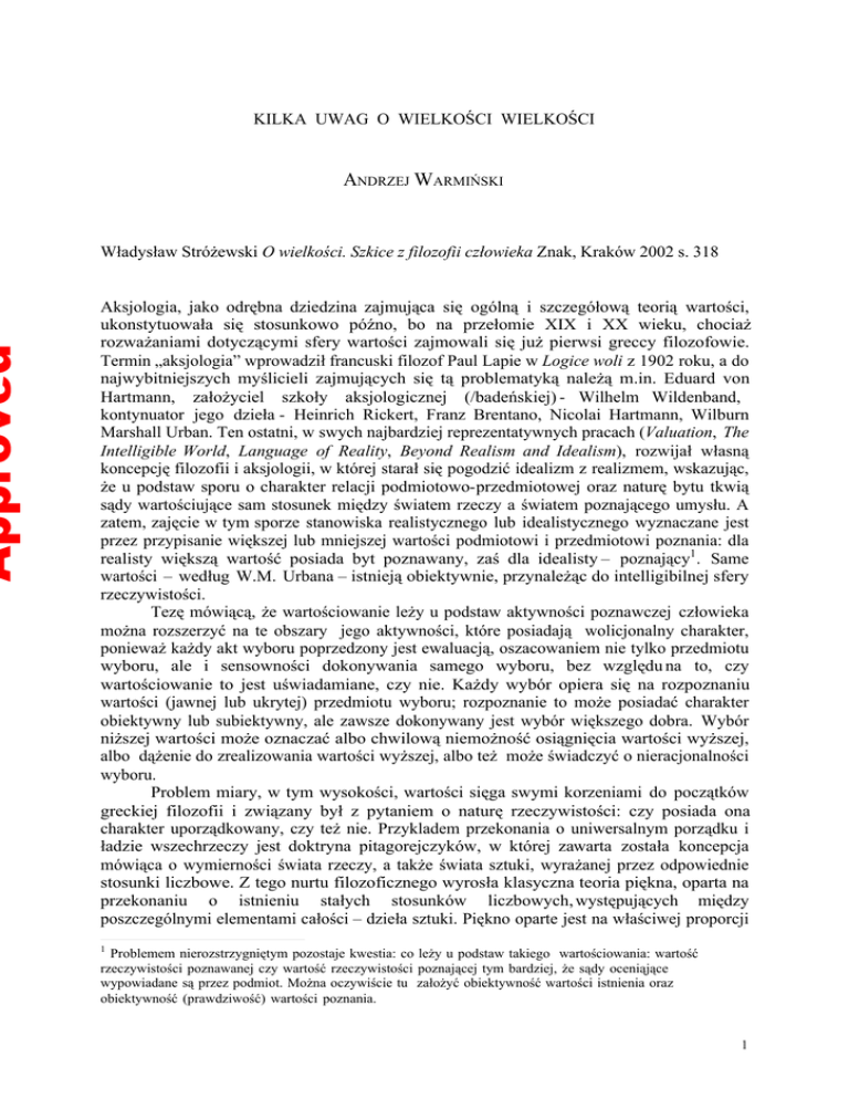 Approved KILKA UWAG O WIELKOŚCI WIELKOŚCI ANDRZEJ WARMIŃSKI Władysław Stróżewski O wielkości. Szkice z filozofii człowieka Znak, Kraków 2002 s. 318 Aksjologia, jako odrębna dziedzina zajmująca się ogólną i szczegółową teorią wartości, ukonstytuowała się stosunkowo późno, bo na przełomie XIX i XX wieku, chociaż rozważaniami dotyczącymi sfery wartości zajmowali się już pierwsi greccy filozofowie. Termin „aksjologia” wprowadził francuski filozof Paul Lapie w Logice woli z 1902 roku, a do najwybitniejszych myślicieli zajmujących się tą problematyką należą m.in. Eduard von Hartmann, założyciel szkoły aksjologicznej (/badeńskiej) - Wilhelm Wildenband, kontynuator jego dzieła - Heinrich Rickert, Franz Brentano, Nicolai Hartmann, Wilburn Marshall Urban. Ten ostatni, w swych najbardziej reprezentatywnych pracach (Valuation, The Intelligible World, Language of Reality, Beyond Realism and Idealism), rozwijał własną koncepcję filozofii i aksjologii, w której starał się pogodzić idealizm z realizmem, wskazując, że u podstaw sporu o charakter relacji podmiotowo-przedmiotowej oraz naturę bytu tkwią sądy wartościujące sam stosunek między światem rzeczy a światem poznającego umysłu. A zatem, zajęcie w tym sporze stanowiska realistycznego lub idealistycznego wyznaczane jest przez przypisanie większej lub mniejszej wartości podmiotowi i przedmiotowi poznania: dla realisty większą wartość posiada byt poznawany, zaś dla idealisty – poznający1 . Same wartości – według W.M. Urbana – istnieją obiektywnie, przynależąc do intelligibilnej sfery rzeczywistości. Tezę mówiącą, że wartościowanie leży u podstaw aktywności poznawczej człowieka można rozszerzyć na te obszary jego aktywności, które posiadają wolicjonalny charakter, ponieważ każdy akt wyboru poprzedzony jest ewaluacją, oszacowaniem nie tylko przedmiotu wyboru, ale i sensowności dokonywania samego wyboru, bez względu na to, czy wartościowanie to jest uświadamiane, czy nie. Każdy wybór opiera się na rozpoznaniu wartości (jawnej lub ukrytej) przedmiotu wyboru; rozpoznanie to może posiadać charakter obiektywny lub subiektywny, ale zawsze dokonywany jest wybór większego dobra. Wybór niższej wartości może oznaczać albo chwilową niemożność osiągnięcia wartości wyższej, albo dążenie do zrealizowania wartości wyższej, albo też może świadczyć o nieracjonalności wyboru. Problem miary, w tym wysokości, wartości sięga swymi korzeniami do początków greckiej filozofii i związany był z pytaniem o naturę rzeczywistości: czy posiada ona charakter uporządkowany, czy też nie. Przykladem przekonania o uniwersalnym porządku i ładzie wszechrzeczy jest doktryna pitagorejczyków, w której zawarta została koncepcja mówiąca o wymierności świata rzeczy, a także świata sztuki, wyrażanej przez odpowiednie stosunki liczbowe. Z tego nurtu filozoficznego wyrosła klasyczna teoria piękna, oparta na przekonaniu o istnieniu stałych stosunków liczbowych, występujących między poszczególnymi elementami całości – dzieła sztuki. Piękno oparte jest na właściwej proporcji 1 Problemem nierozstrzygniętym pozostaje kwestia: co leży u podstaw takiego wartościowania: wartość rzeczywistości poznawanej czy wartość rzeczywistości poznającej tym bardziej, że sądy oceniąjące wypowiadane są przez podmiot. Można oczywiście tu założyć obiektywność wartości istnienia oraz obiektywność (prawdziwość) wartości poznania. 1 Approved i odpowiednim układzie części. Dana rzecz jest piękna, jeżeli jej elementy porządkowane są w sposób symetryczny i harmonijny. W pitagorejskim ujęciu, miara świata, a tym samym miara sztuki, daje się jednoznacznie określić – struktura rzeczywistości wyraża się i może być wyrażona przez odpowiednie stosunki liczbowe, a istnienie odpowiednich proporcji przesądza o istnieniu piękna w dziele sztuki i dobra w człowieku kontemplującym harmonię świata. Zagadnienie miary pojawia się na przestrzeni wieków pod różnymi postaciami i z różnym natężeniem. Poprzez św. Augustyna, Boecjusza, Izydora zostaje ono podjęte w filozofii scholastyków, np. w Summie brata Aleksandra, gdzie znajdujemy poglad, że właściwy kształt, miara, ład przysługują, w większym lub mniejszym stopniu, każdemu bytowi, zarówno cielesnemu jak i duchowemu. „Im więcej w rzeczach miary kształtu, ładu, tym są lepsze”2 . Leonardo da Vinci traktuje miarę jako jeden z dwóch podstawowych (obok inwencji twórczej) elementów wyznaczających sztukę, chociaż w przypadku jego twórczości postulat rygorystycznego przestrzegania klasycznych proporcji ulega złagodzeniu. Koncepcję miary, jako formuły geometrycznej wyrażanej w zgodności z prawami natury, głosił także m.in. Albrecht Dürer, pojawiła się ona również w XVII wieku w estetyce Giovani P. Belloriego i Nicolasa Poussina. Odejście od klasycznej koncepcji piękna spowodowane było przyjęciem innych kryteriów wartościowania. Kryteria wartościowania stosowane są w przypadku wyboru wszystkich rodzajów wartości, określają także sam wybór. Greckie kritérion to miara, zasada oceny. Z jednej strony rekonstruuje ona ukryty porządek oraz naturę wartości (według niektórych teorii aksjologicznych współtworzy je), z drugiej natomiast ułatwia poruszanie się w świecie wartości, wyznaczając swoistego rodzaju punkty odniesienia, dzięki którym człowiek nie traci w nim orientacji, co nie oznacza, że wybór i realizacja określonej wartości przebiega w sposób prosty i nieskomplikowany. Istnieją różne rodzaje i typy wartości. Ich wybór jest utrudniony m.in. z następujących powodów: 1) konieczności wyboru między dwoma typami wartości; 2) konieczności wyboru między wartościami tego samego rodzaju; 3) trudności w odróżnianiu wartości prymarnych od podstawowych, ewentualnie wynikające z ich usze