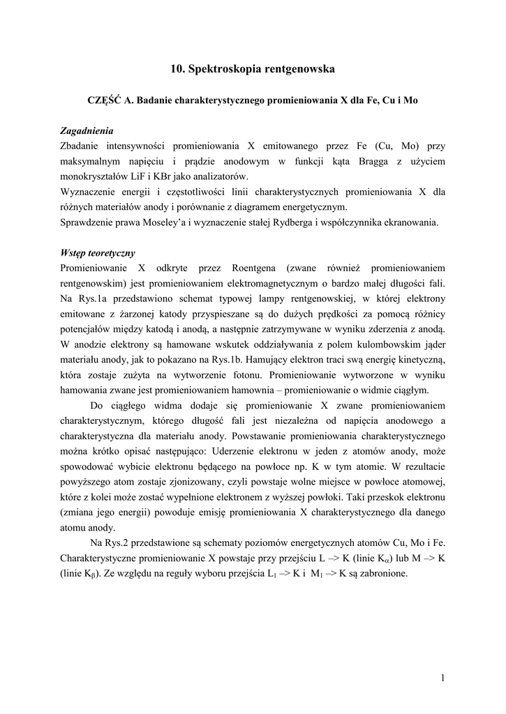 10. Spektroskopia rentgenowska CZĘŚĆ A. Badanie charakterystycznego promieniowania X dla Fe, Cu i Mo Zagadnienia Zbadanie intensywności promieniowania X emitowanego przez Fe (Cu, Mo) przy maksymalnym napięciu i prądzie anodowym w funkcji kąta Bragga z użyciem monokryształów LiF i KBr jako analizatorów. Wyznaczenie energii i częstotliwości linii charakterystycznych promieniowania X dla różnych materiałów anody i porównanie z diagramem energetycznym. Sprawdzenie prawa Moseley’a i wyznaczenie stałej Rydberga i współczynnika ekranowania. Wstęp teoretyczny Promieniowanie X odkryte przez Roentgena (zwane również promieniowaniem rentgenowskim) jest promieniowaniem elektromagnetycznym o bardzo małej długości fali. Na Rys.1a przedstawiono schemat typowej lampy rentgenowskiej, w której elektrony emitowane z żarzonej katody przyspieszane są do dużych prędkości za pomocą różnicy potencjałów między katodą i anodą, a następnie zatrzymywane w wyniku zderzenia z anodą. W anodzie elektrony są hamowane wskutek oddziaływania z polem kulombowskim jąder materiału anody, jak to pokazano na Rys.1b. Hamujący elektron traci swą energię kinetyczną, która zostaje zużyta na wytworzenie fotonu. Promieniowanie wytworzone w wyniku hamowania zwane jest promieniowaniem hamownia – promieniowanie o widmie ciągłym. Do ciągłego widma dodaje się promieniowanie X zwane promieniowaniem charakterystycznym, którego długość fali jest niezależna od napięcia anodowego a charakterystyczna dla materiału anody. Powstawanie promieniowania charakterystycznego można krótko opisać następująco: Uderzenie elektronu w jeden z atomów anody, może spowodować wybicie elektronu będącego na powłoce np. K w tym atomie. W rezultacie powyższego atom zostaje zjonizowany, czyli powstaje wolne miejsce w powłoce atomowej, które z kolei może zostać wypełnione elektronem z wyższej powłoki. Taki przeskok elektronu (zmiana jego energii) powoduje emisję promieniowania X charakterystycznego dla danego atomu anody. Na Rys.2 przedstawione są schematy poziomów energetycznych atomów Cu, Mo i Fe. Charakterystyczne promieniowanie X powstaje przy przejściu L –> K (linie K) lub M –> K (linie K). Ze względu na reguły wyboru przejścia L1 –> K i M1 –> K są zabronione. 1 Rys. 2 Poziomy energetyczne w miedzi (Cu, Z = 29) Poziomy energetyczne w molibdenie (Mo, Z = 42) Poziomy energetyczne w żelazie (Fe, Z = 26) 2 W przypadku lampy z anodą miedzianą oczekujemy, że linie promieniowania charakterystycznego będą miały energie: EKα* EK 0,5( EL2 EL3 ) 8,038 keV (1) EKβ EK EM2,3 8,905 keV K* oznacza wartość średnią linii K i K. Rys. 1. a) Schemat spektrometru krystalicznego Bragga. b) Promieniowanie hamowania wytwarzane przez elektron hamowany w polu kulombowskim atomu. Analiza polichromatycznego promieniowania X możliwa jest z zastosowaniem monokryształu. Gdy promieniowanie X o długości fali pada na monokryształ pod kątem (Rys.3), interferencja konstruktywna zachodzi, gdy różnica dróg promieni odbitych od różnych płaszczyzn atomowych kryształu jest wielokrotnością długości fali. Sytuację powyższą opisuje równanie Bragga: 2d sin nλ , (2) gdzie d jest odległością między płaszczyznami atomowymi, a n rzędem dyfrakcji. Znając d i eksperymentalnie wyznaczając możemy wyznaczyć energię charakterystycznych promieniowania X: hc , (3) Ehf linii lub korzystając z równania (2) E nhc . 2d sin (4) 3 Rys. 3. Rozpraszanie Bragga na płaszczyznach atomowych. Energia wiązania elektronu na powłoce atomowej z główną liczbą kwantową n wynosi: me e 4 1 (5) En 2 2 (Z ) 2 2 , 8 0 h n gdzie Z – liczba atomowa pierwiastka, – współczynnik ekranowania. Częstość wypromieniowanego fotonu wynosi więc 1 1 E me e 4 1 1 f 2 3 ( Z ) 2 2 2 f R ( Z ) 2 2 2 (6) h 8 0 h n1 n2 n1 n2 gdzie fR jest częstością Rydberga i f R R c (R – stała Rydberga). Gdy elektron przeskakuje z powłoki L (n = 2) na powłokę K (n = 1), to otrzymujemy promieniowanie K. Po podstawieniu n1 1 i n2 2 z powyższego równania dostajemy 1 (7) f 3 f R (Z ) . 2 Jeśli więc wykreślimy zależność f od liczby atomowej Z, dostaniemy linię prostą. Tę własność zaobserwował Moseley. Zadania do wykonania 1. Zmierzyć zależności intensywności I promieniowania X od kąta Bragga dla wszystkich lamp rentgenowskich (z anodami Cu, Mo i Fe) w zadanych przedziałach zmian kąta i dla obydwu monokryształów analizujących (LiF i KBr). 2. Odczytać z wykresów I() położenie linii K i K dla wszystkich rzędów dyfrakcji dla różnych lamp rentgenowskich i analizatorów. 3. Korzystając z równania (4) wyznaczyć energie i częstości dla linii K i K dla wszystkich przypadków. Wyznaczyć wartości średnie. Przeprowadzić rachunek niepewności. 4. Dla linii K i K (osobno) wykreślić zależności f od liczby atomowej Z atomów anody. Korzystając z równania (7) (metodą regresji liniowej) wyznaczyć stałą 4 Rydberga i współczynnik ekranowania osobno dla linii K i KObliczyć ich niepewności. 5. Porównać otrzymane wartości energii linii charakterystycznych i stałej Rydberga z wartościami tablicowymi. kryształ (analizator) moduł z anodą źródło promieni X goniometr przesłona blokada osłony przesuwanej tuba licznika włącznik oświetlenia Rys. 4. Zdjęcie urządzenia pomiarowego z zainstalowanymi komponentami do badania promieniowania charakterystycznego. Parametry pomiarów (patrz Rys.4): Tuba licznika powinna się znajdować w pozycji skrajnie oddalonej. Wspólne ustawienia programu MEASURE: czas zliczania (gate time) – 2s, krok (angle step) – 0,1o, napięcie anodowe (anode voltage) – 35 kV, prąd anodowy (anode current) – 1 mA. a) moduł z anodą Cu - zamocować przesłonę na wyjściu promieniowania X: o średnicy 1 mm dla kryształu LiF, o średnicy 2 mm dla kryształu KBr, - ustawić goniometr w pozycji pośredniej (wskaźnik na pozycji 4) - ustawien