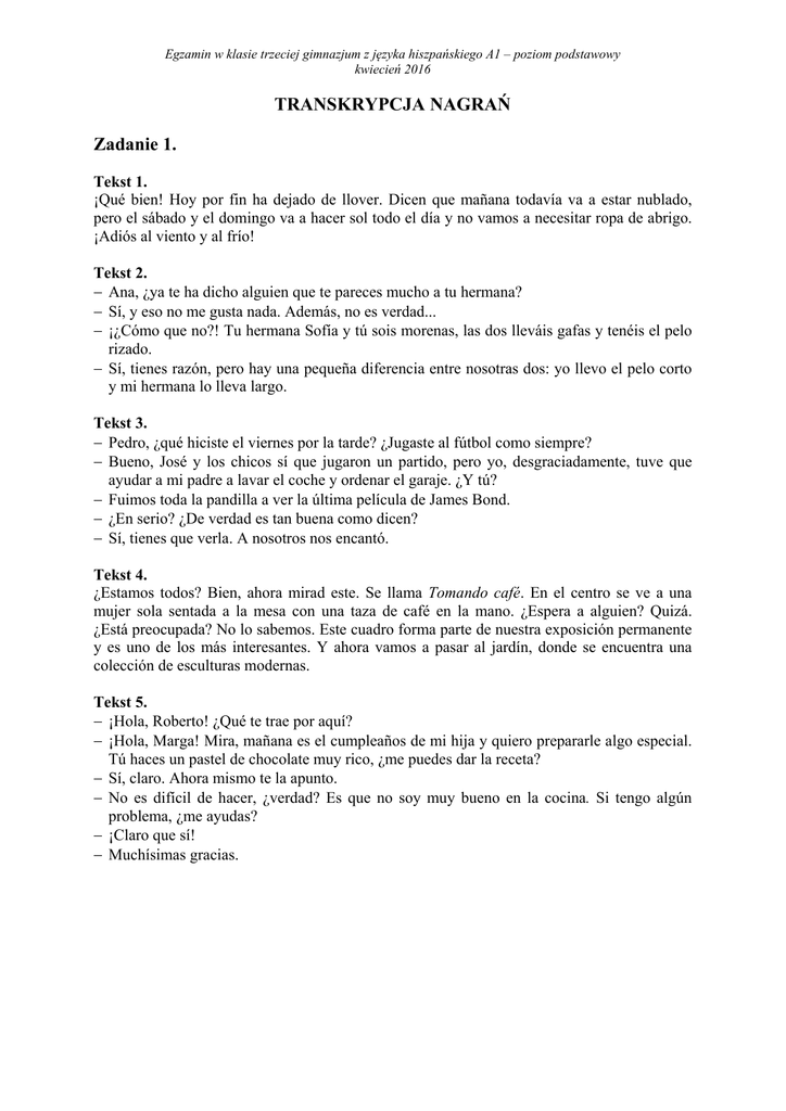 Egzamin w klasie trzeciej gimnazjum z języka hiszpańskiego A1 – poziom podstawowy kwiecień 2016 TRANSKRYPCJA NAGRAŃ Zadanie 1. Tekst 1. ¡Qué bien! Hoy por fin ha dejado de llover. Dicen que mañana todavía va a estar nublado, pero el sábado y el domingo va a hacer sol todo el día y no vamos a necesitar ropa de abrigo. ¡Adiós al viento y al frío! Tekst 2. Ana, ¿ya te ha dicho alguien que te pareces mucho a tu hermana? Sí, y eso no me gusta nada. Además, no es verdad... ¡¿Cómo que no?! Tu hermana Sofía y tú sois morenas, las dos lleváis gafas y tenéis el pelo rizado. Sí, tienes razón, pero hay una pequeña diferencia entre nosotras dos: yo llevo el pelo corto y mi hermana lo lleva largo. Tekst 3. Pedro, ¿qué hiciste el viernes por la tarde? ¿Jugaste al fútbol como siempre? Bueno, José y los chicos sí que jugaron un partido, pero yo, desgraciadamente, tuve que ayudar a mi padre a lavar el coche y ordenar el garaje. ¿Y tú? Fuimos toda la pandilla a ver la última película de James Bond. ¿En serio? ¿De verdad es tan buena como dicen? Sí, tienes que verla. A nosotros nos encantó. Tekst 4. ¿Estamos todos? Bien, ahora mirad este. Se llama Tomando café. En el centro se ve a una mujer sola sentada a la mesa con una taza de café en la mano. ¿Espera a alguien? Quizá. ¿Está preocupada? No lo sabemos. Este cuadro forma parte de nuestra exposición permanente y es uno de los más interesantes. Y ahora vamos a pasar al jardín, donde se encuentra una colección de esculturas modernas. Tekst 5. ¡Hola, Roberto! ¿Qué te trae por aquí? ¡Hola, Marga! Mira, mañana es el cumpleaños de mi hija y quiero prepararle algo especial. Tú haces un pastel de chocolate muy rico, ¿me puedes dar la receta? Sí, claro. Ahora mismo te la apunto. No es difícil de hacer, ¿verdad? Es que no soy muy bueno en la cocina. Si tengo algún problema, ¿me ayudas? ¡Claro que sí! Muchísimas gracias. Egzamin w klasie trzeciej gimnazjum z języka hiszpańskiego A1 – poziom podstawowy kwiecień 2016 Zadanie 2. ¡Hola, Paco! ¡Hola, Carmen! ¿Qué tal? ¿Este verano vas de vacaciones a Galicia como todos los años? Imposible. Mis padres han vendido la casa de verano que teníamos allí. Estaban hartos del mal tiempo, sobre todo de la lluvia. Este verano voy a la Costa del Sol, a Nerja. ¿Y por qué me lo preguntas? Porque pensaba ir a verte. Pero si ya no tenéis aquella casa, pues nada. ¿Y tú? ¿Vas a pasar las vacaciones con tu familia en los Pirineos? Mis padres sí que van a la montaña, pero yo me aburro un montón allí. Por eso me he apuntado a un campamento de windsurf en Lanzarote. ¡Genial! ¿Y tu hermano? ¿También va contigo? No, ni conmigo ni con mis padres. Se queda en casa. Es que en septiembre tiene tres exámenes de recuperación y tiene que estudiar. ¡Qué dices! ¡Las vacaciones en Madrid! ¡Qué horror! ¡Pobrecito! Bueno, eso tiene su lado positivo. ¿Ah, sí? ¿Cuál? Es que, como él se queda en casa, puedo usar su tabla de windsurf. ¡Qué malo eres! Zadanie 3. ¿Todavía no tienes planes para los próximos días? Ven a nuestro cine EL TORO FERNANDO. Este cine es ya una tradición en nuestra ciudad. Cada año, desde mayo hasta septiembre, los amantes del cine pueden ver sus películas favoritas en la antigua plaza de toros. No hay nada mejor que pasar la noche bajo las estrellas con una buena película. Te esperamos todos los días a las nueve de la noche. Los jueves, ¡dos entradas al precio de una! Ven con todos tus amigos. ¡No te lo pierdas! Zadanie 4. Wypowiedź 1. ¿Qué te has comprado esta mañana? Wypowiedź 2. ¿Me queda bien esta chaqueta? Wypowiedź 3. ¿Por qué nunca te pones faldas? Wypowiedź 4. ¿Cuál es el chico que ha ganado el concurso?