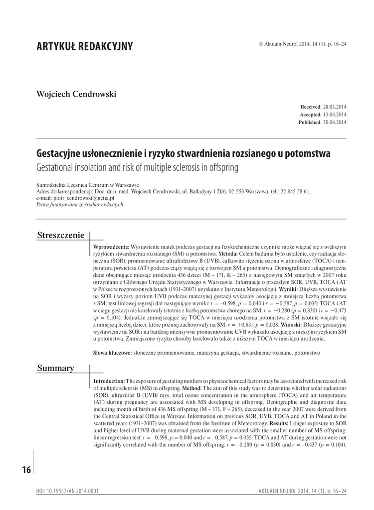 ARTYKUŁ REDAKCYJNY © Aktualn Neurol 2014, 14 (1), p. 16–24 Wojciech Cendrowski Received: 28.03.2014 Accepted: 15.04.2014 Published: 30.04.2014 Gestacyjne usłonecznienie i ryzyko stwardnienia rozsianego u potomstwa Gestational insolation and risk of multiple sclerosis in offspring Samodzielna Lecznica Centrum w Warszawie Adres do korespondencji: Doc. dr n. med. Wojciech Cendrowski, ul. Balladyny 1 D/6, 02-553 Warszawa, tel.: 22 845 28 61, e-mail: [email protected] Praca finansowana ze środków własnych Streszczenie Wprowadzenie: Wystawienie matek podczas gestacji na fizykochemiczne czynniki może wiązać się z większym ryzykiem stwardnienia rozsianego (SM) u potomstwa. Metoda: Celem badania było ustalenie, czy radiacja słoneczna (SOR), promieniowanie ultrafioletowe B (UVB), całkowite stężenie ozonu w atmosferze (TOCA) i temperatura powietrza (AT) podczas ciąży wiążą się z rozwojem SM u potomstwa. Demograficzne i diagnostyczne dane obejmujące miesiąc urodzenia 436 dzieci (M – 171, K – 265) z następowym SM zmarłych w 2007 roku otrzymano z Głównego Urzędu Statystycznego w Warszawie. Informacje o przeszłym SOR, UVB, TOCA i AT w Polsce w rozproszonych latach (1931–2007) uzyskano z Instytutu Meteorologii. Wyniki: Dłuższe wystawienie na SOR i wyższy poziom UVB podczas matczynej gestacji wykazały asocjację z mniejszą liczbą potomstwa z SM; test liniowej regresji dał następujące wyniki: r = –0,598, p = 0,040 i r = −0,587, p = 0,035; TOCA i AT w ciągu gestacji nie korelowały istotnie z liczbą potomstwa chorego na SM: r = −0,280 (p = 0,830) i r = −0,473 (p = 0,104). Jednakże zmniejszające się TOCA w miesiącu urodzenia potomstwa z SM istotnie wiązało się z mniejszą liczbą dzieci, które później zachorowały na SM: r = +0,631, p = 0,028. Wnioski: Dłuższe gestacyjne wystawienie na SOR i na bardziej intensywne promieniowanie UVB wykazało asocjację z niższym ryzykiem SM u potomstwa. Zmniejszone ryzyko choroby korelowało także z niższym TOCA w miesiącu urodzenia. Słowa kluczowe: słoneczne promieniowanie, matczyna gestacja, stwardnienie rozsiane, potomstwo Summary Introduction: The exposure of gestating mothers to physicochemical factors may be associated with increased risk of multiple sclerosis (MS) in offspring. Method: The aim of this study was to determine whether solar radiations (SOR), ultraviolet B (UVB) rays, total ozone concentration in the atmosphere (TOCA) and air temperature (AT) during pregnancy are associated with MS developing in offspring. Demographic and diagnostic data including month of birth of 436 MS offspring (M – 171, F – 265), deceased in the year 2007 were derived from the Central Statistical Office in Warsaw. Information on previous SOR, UVB, TOCA and AT in Poland in the scattered years (1931–2007) was obtained from the Institute of Meteorology. Results: Longer exposure to SOR and higher level of UVB during maternal gestation were associated with the smaller number of MS offspring; linear regression test: r = –0.598, p = 0.040 and r = –0.587, p = 0.035. TOCA and AT during gestation were not significantly correlated with the number of MS offspring: r = –0.280 (p = 0.830) and r = –0.437 (p = 0.104). 16 DOI: 10.15557/AN.2014.0001 AKTUALN NEUROL 2014, 14 (1), p. 16–24 A R T Y K U Ł R E DA KC YJ N Y However, decreased TOCA during birth month of offspring was significantly associated with the smaller number of children destined to develop MS: r = +0.631, p = 0.028. Conclusions: Longer gestational exposure to SOR and more intense UVB were associated with lower risk of MS in offspring. Reduced risk of the disease was also correlated to decreased TOCA during month of offspring birth. Key words: solar radiation, maternal gestation, multiple sclerosis, offspring WPROWADZENIE INTRODUCTION izykochemiczne, zakaźne i immunologiczne czynniki biorą udział w etiologii stwardnienia rozsianego (SM) (1–3). Wpływ czynników środowiskowych zaczyna się w życiu płodowym, zaś kończy w wieku dojrzałym(1,4). Miejsce i miesiąc urodzenia, płeć, rasa, poziom higieny oraz wiek zakażenia wirusowego wpływają na ryzyko SM(1,2,5–7). Słoneczne promieniowanie (SOR) i całkowite stężenie ozonu w atmosferze (TOCA) mogą wywrzeć wpływ na układ immunologiczny matki i płodu, kształtując ryzyko SM u potomstwa(4,8,9). Co więcej, ryzyko SM wzrasta, jeśli ciężarne biernie wdychają dym tytoniowy, nie piją wzbogaconego mleka, przyjmują estrogeny, są otyłe lub chorują na cukrzycę(7,10,11). Przeszły niski poziom promieniowania nadfioletowego B (UVB) podczas ciąży kończącej się wiosną powoduje niedostateczną syntezę 1,25-hydro ksywitaminy D [25(OH)D] oraz zmniejszoną produkcję i różnicowanie komórek T(8,12). Niski poziom promieniowania UVB w ciągu pierwszego trymestru ciąży wpływa na słabszą tolerancję autoantygenów i patogenów, jak również na ekspresję allelu HLA-DRB1*15(4,12). Wystawienie na niską temperaturę powietrza może także predysponować ciężarne matki do zakażenia i tym samym zwiększyć ryzyko SM u potomstwa(13). Przedmiotem obecnego badania jest stwierdzenie asocjacji między przeszłym usłonecznieniem, naświetleniem UVB, temperaturą powietrza (AT), TOCA podczas matczynej gestacji lub w miesiącu urodzenia a ryzykiem SM u potomstwa. Istotna korelacja może rzucić więcej światła na rolę wczesnych fizykochemicznych czynników w etiologii choroby. hysicochemical, infectious and immunologic factors take part in aetiology of multiple sclerosis (MS)(1–3). The effect of environmental factors starts in prenatal life and ends in adulthood(1,4). Location and month of birth, gender, race, level of hygiene and age at viral infection influence risk of MS(1,2,5–7). Solar radiation (SOR) and total ozone concentration in the atmosphere (TOCA) may exert influence on maternal and foetal immune system shaping risk of MS in offspring(4,8,9). Furthermore, risk o
