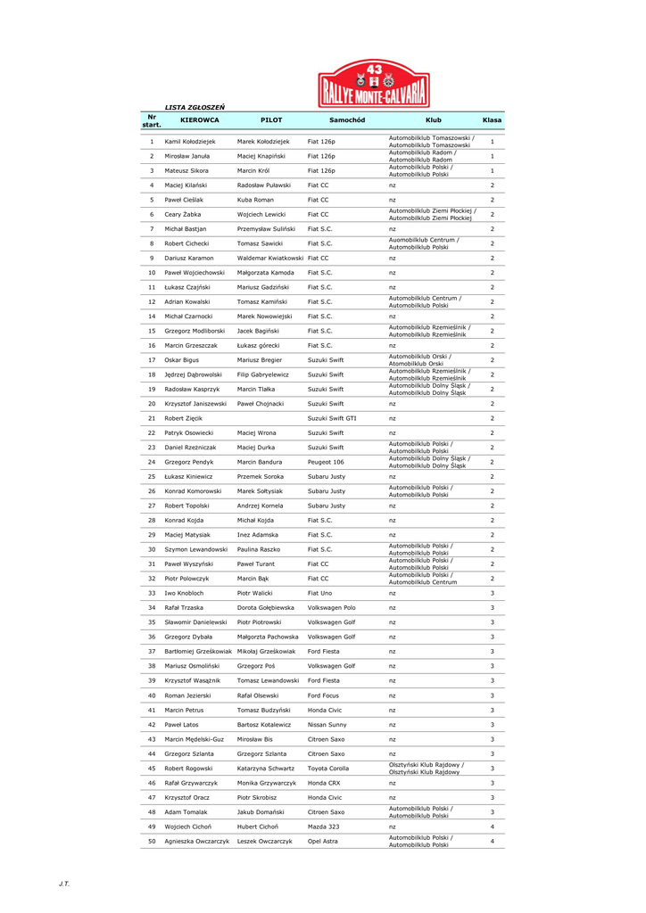 LISTA ZGŁOSZEŃ Nr start. J.T. KIEROWCA PILOT Samochód Klub Automobilklub Automobilklub Automobilklub Automobilklub Automobilklub Automobilklub Tomaszowski / Tomaszowski Radom / Radom Polski / Polski Klasa 1 1 Kamil Kołodziejek Marek Kołodziejek Fiat 126p 2 Mirosław Januła Maciej Knapiński Fiat 126p 3 Mateusz Sikora Marcin Król Fiat 126p 4 Maciej Kilański Radosław Puławski Fiat CC nz 2 5 Paweł Cieślak Kuba Roman Fiat CC nz 2 2 1 1 6 Ceary Żabka Wojciech Lewicki Fiat CC Automobilklub Ziemi Płockiej / Automobilklub Ziemi Płockiej 7 Michał Bastjan Przemysław Suliński Fiat S.C. nz 2 8 Robert Cichecki Tomasz Sawicki Fiat S.C. Auomobilklub Centrum / Automobilklub Polski 2 9 2 Dariusz Karamon Waldemar Kwiatkowski Fiat CC nz 10 Paweł Wojciechowski Małgorzata Kamoda Fiat S.C. nz 2 11 Łukasz Czajński Mariusz Gadziński Fiat S.C. nz 2 12 Adrian Kowalski Tomasz Kamiński Fiat S.C. Automobilklub Centrum / Automobilklub Polski 2 14 Michał Czarnocki Marek Nowowiejski Fiat S.C. nz 2 15 Grzegorz Modliborski Jacek Bagiński Fiat S.C. Automobilklub Rzemieślnik / Automobilklub Rzemieślnik 2 16 Marcin Grzeszczak Łukasz górecki Fiat S.C. 17 Oskar Bigus Mariusz Bregier Suzuki Swift 18 Jędrzej Dąbrowolski Filip Gabryelewicz Suzuki Swift nz 2 Automobilklub Orski / Atomobilklub Orski Automobilklub Rzemieślnik / Automobilklub Rzemieślnik Automobilklub Dolny Śląsk / Automobilklub Dolny Śląsk 19 Radosław Kasprzyk Marcin Tlałka Suzuki Swift 20 Krzysztof Janiszewski Paweł Chojnacki Suzuki Swift nz 2 2 2 2 21 Robert Zięcik Suzuki Swift GTI nz 2 22 Patryk Osowiecki Maciej Wrona Suzuki Swift nz 2 23 Daniel Rzeżniczak Maciej Durka Suzuki Swift Automobilklub Automobilklub Automobilklub Automobilklub Polski / Polski Dolny Śląsk / Dolny Śląsk 2 2 24 Grzegorz Pendyk Marcin Bandura Peugeot 106 25 Łukasz Kiniewicz Przemek Soroka Subaru Justy nz 2 26 Konrad Komorowski Marek Sołtysiak Subaru Justy Automobilklub Polski / Automobilklub Polski 2 27 Robert Topolski Andrzej Kornela Subaru Justy nz 2 28 Konrad Kojda Michał Kojda Fiat S.C. nz 2 29 Maciej Matysiak Inez Adamska Fiat S.C. 30 Szymon Lewandowski Paulina Raszko Fiat S.C. 31 Paweł Wyszyński Paweł Turant Fiat CC nz Automobilklub Automobilklub Automobilklub Automobilklub Automobilklub Automobilklub 2 Polski / Polski Polski / Polski Polski / Centrum 2 2 2 32 Piotr Polowczyk Marcin Bąk Fiat CC 33 Iwo Knobloch Piotr Walicki Fiat Uno nz 3 34 Rafał Trzaska Dorota Gołębiewska Volkswagen Polo nz 3 35 Sławomir Danielewski Piotr Piotrowski Volkswagen Golf nz 3 36 Grzegorz Dybała Małgorzta Pachowska Volkswagen Golf nz 3 37 Bartłomiej Grześkowiak Mikołaj Grześkowiak Ford Fiesta nz 3 38 Mariusz Osmoliński Grzegorz Poś Volkswagen Golf nz 3 39 Krzysztof Wasążnik Tomasz Lewandowski Ford Fiesta nz 3 40 Roman Jezierski Rafał Olsewski Ford Focus nz 3 41 Marcin Petrus Tomasz Budzyński Honda Civic nz 3 42 Paweł Latos Bartosz Kotalewicz Nissan Sunny nz 3 3 43 Marcin Mędelski-Guz Mirosław Bis Citroen Saxo nz 44 Grzegorz Szlanta Grzegorz Szlanta Citroen Saxo nz 3 45 Robert Rogowski Katarzyna Schwartz Toyota Corolla Olsztyński Klub Rajdowy / Olsztyński Klub Rajdowy 3 46 Rafał Grzywarczyk Monika Grzywarczyk Honda CRX nz 3 47 Krzysztof Oracz Piotr Skrobisz Honda Civic nz 3 48 Adam Tomalak Jakub Domański Citroen Saxo Automobilklub Polski / Automobilklub Polski 3 49 Wojciech Cichoń Hubert Cichoń Mazda 323 nz 4 50 Agnieszka Owczarczyk Leszek Owczarczyk Opel Astra Automobilklub Polski / Automobilklub Polski 4 J.T. 51 Tomasz Wikieł Łukasz Kamieniak Opel Astra nz 4 52 Juljiusz Sochoń Jarosław Omelanczuk Opel Astra nz 4 53 Jacek Węcławski Tomasz Kowalik Opel Astra Automobilklub Chełmski / Automobilklub Chełmski 4 54 Paweł Grzebieluch Anna Grzebieluch Opel Astra GSI nz 4 55 Tomasz Blinkiewicz Łukasz Hołubowicz Opel Astra GSI 56 Piotr Orzechowski Piotr Grzonka Opel Astra GSI 57 Krzysztof Sońta Piotr Sońta Opel Cadett GSI 58 Marek Kalitowicz Piotrek Kalitowicz Opel Cadett nz 4 59 Michał Sadowski Magdalena Sadowska Peugeot 205 nz 4 4 nz 4 Automobilklub Rzemieślnik / Automobilklub Rzemieślnik Autmobilklub Centrum / Automobilklub Centrum 4 4 60 Piotr Szczęśniak Piotr Debita Honda Civic Type R Automobilklub Dolny Śląsk / Automobilklub Dolny Śląsk 61 Omar Kasafier Grzegorz Rybak BMW 320 i nz 4 62 Wojciech Żochowski Łukasz Przesmycki BMW 316 nz 4 63 Paweł Roszek Rafał Rogulski BMW 318 is 64 Michał Dąbrowolski Artur Szczepankowski BMW 318 is 65 Piotr Staszczyk Paweł Winczaszek Opel Astra GSI nz Automobilklub Automobilklub Automobilklub Automobilklub Automobilklub Automobilklub 4 Rzemieślnik / Rzemieślnik Dolny Śląsk / Dolny Śląsk Rzemieślnik / Polski 4 4 66 Dariusz Milwicz Marcin Rogowski BMW 325e 67 Grzegorz Korczak Tomasz Szymański Ford Sierra Cosworth nz 5 68 Tadeusz Kulka Marta Wajda Audi Coupe Quattro Automobilklub Toruński / Automobilklub Toruński 5 69 Jan Dembski Łukasz Grzegorczyk Subaru Impreza GT nz 5 70 Gracjan Duda Aleksandra Madeksza Subaru Impreza GT nz 5 71 Paweł Żeromiński Jacek Skorzyński Subaru Legacy nz 5 5 72 Roman Urban Jerzy Szcząchor Subaru Legacy nz 5 73 Patrucjusz Kruślak Grzegorz Karpiarz Subaru Legacy nz 5 74 Piotr Broncher Jarosław Niemiro Subaru Legacy nz 5 75 Kuba Hanak Paweł Lenczowski Subaru Impreza nz 5 76 Maciej Szanter Paweł Tustanowski Subaru Impreza nz 5 77 Daniel Zawadzki Wojciech Dębowski Subaru Impreza nz 5 78 Paweł Plata Robert Dzióbek Subaru Impreza nz 5 79 Krzysztof Kłusek Agnieszka Kłusek Subaru Impreza nz 5 80 Jerzy Pyzel Artur Jabłuszewski Subaru Impreza nz 5 81 Krzysztof Szymański Jarosław Latosek Subaru Legacy nz 5 82 Paweł Tomaszek Adam Tomaszek Subaru Impreza nz 5 83 Wiktor Kozłowski Tomasz Piotrowski Subaru Impreza nz 5 84 Michał Żelazo Krzysztof Sawicki Mitsubishi Lancer Automobilklub Rzemieślnik / Automobilklub Rzemieślnik 5 85 Stefan Radzimiński Rafał Dudziński Mitsubishi Lancer nz 5 86 Marek Nowak Marcin Mackiewicz Mitsubishi 