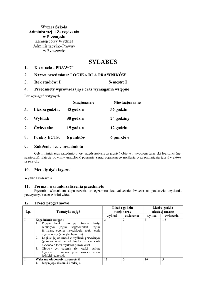 WyŜsza Szkoła Administracji i Zarządzania w Przemyślu Zamiejscowy Wydział Administracyjno-Prawny w Rzeszowie SYLABUS 1. Kierunek: „PRAWO” 2. Nazwa przedmiotu: LOGIKA DLA PRAWNIKÓW 3. Rok studiów: I 4. Przedmioty wprowadzające oraz wymagania wstępne Semestr: I Bez wymagań wstępnych Stacjonarne Niestacjonarne 5. Liczba godzin: 45 godzin 36 godzin 6. Wykład: 30 godzin 24 godziny 7. Ćwiczenia: 15 godzin 12 godzin 8. Punkty ECTS: 6 punktów 6 punktów 9. ZałoŜenia i cele przedmiotu Celem niniejszego przedmiotu jest przedstawienie zagadnień objętych wyborem tematyki logicznej (np. semiotyki). Zajęcia powinny umoŜliwić poznanie zasad poprawnego myślenia oraz rozumienia tekstów aktów prawnych. 10. Metody dydaktyczne Wykład i ćwiczenia 11. Forma i warunki zaliczenia przedmiotu Egzamin. Warunkiem dopuszczenia do egzaminu jest zaliczenie ćwiczeń na podstawie uzyskania pozytywnych ocen z kolokwiów. 12. Lp. I II Treści programowe Liczba godzin stacjonarne wykład ćwiczenia Tematyka zajęć Zagadnienia wstępne 1. Pojęcie logiki oraz jej główne działy: semiotyka (logika wypowiedzi), logika formalna, ogólna metodologia nauk, teoria argumentacji (retoryka logiczna). 2. Logika i jej obecność w myśleniu prawniczym (powszechność zasad logiki, a swoistość niektórych form myślenia prawników). 3. Główny cel uczenia się logiki: kultura logiczna rozumiana jako swoista cecha ludzkiej jednostki. Wybrane wiadomości z semiotyki 1. Język, jego składniki i rodzaje. Liczba godzin niestacjonarne wykład ćwiczenia 3 2 3 1,5 12 6 10 5 2. III IV Pojęcie wypowiedzi, jej rodzaje i składniki. a. Zdanie w sensie logicznym – wyróŜniona kategoria wypowiedzi; podziały zdań. b. Problem wypowiedzi zdaniowych oceniających i normatywnych: czy są one zdaniami w sensie logicznym? RóŜne stanowiska w tej sprawie; zdania oceniające i normatywne a zdania modalne. c. Główne kategorie składników wypowiedzi: α. nazwy, β. funktory, γ. definicja nazwy , jej funkcje znakowe, rodzaje nazw, stosunki zakresowe, zaleŜność między treścią a zakresem nazwy, suma nazw, iloczyn nazw i dopełnienie nazwy, δ. definicja funktora i kryteria jego podziałow. 3. Zagadnienie poprawności wypowiedzi. a. Główne kategorie błędów wypowiedzi: α. błędy znaczeniowe: wypowiedzi nieinformujące, w. obarczone wieloznacznością, w. mylące znaczenia, w. o chwiejnym znaczeniu. β. Błędy polegające na pogwałceniu reguły ekonomicznego wypowiadania myśli. b. Logiczne narzędzia zabezpieczające poprawność wypowiedzi: definicja oraz podział logiczny i klasyfikacja. α. Definicja realna a definicja nominalna, pędzały d. nominalnej równościowej, błędy d. równościowej, d. cząstkowe, d. perswazyjne, główne funkcje definicji, definicje w prawie i w naukach prawnych; β. Podział logiczny, warunki jego poprawności, rodzaje, główne funkcje (cele) podziału i klasyfikacji, podział logiczny i klasyfikacja w prawie i naukach prawnych. Wybrane wiadomości o uzasadnianiu myśli 1. Pojęcie i główne typy uzasadniania, pojecie rozumowania i klasyfikacja rozumowań. 2. Warunki zasadnego stawiania pytań: a. Warunki semantyczne i podstawy wyróŜnienia pytań z partykułą „czy”; b. Warunki pragmatyczne; stopień błędności odpowiedzi niewłaściwej. 3. Zasady rozumowań dedukcyjnych: a. Wybrane prawa i reguły dotyczące podstawowych stosunków logicznych: negacji, alternatywy, koniunkcji, dyzjunkcji, implikacji i równowaŜności. b. Tradycyjna logika nazw: zasady konwersji: stosunki kwadratu logicznego, nauka o sylogizmach; związek tradycyjnej logiki nazw ze strukturą dedukcyjnych rozumowań prawniczych. c. Podstawowe pojęcia logiki modalnej i logiki norm; rekomendacja systemu logiki norm w ujęciu J. Kalinowskiego jako przedmiotu późniejszych studiów. d. Logiczna ocena niektórych reguł rozumowań prawniczych, takich jak: a contrario, a maiori ad minus itd. e. Struktura uzasadnienia wyroku sądowego oraz zagadnienie uzasadniania jego przesanek. f. Główne kategorie błędów rozumowania: błąd formalny, błąd materialny, petitio principii, ignoratio elenchi. Logika a proces przekonywania i dyskusji 1. Pojęcie argumentu perswazyjnego i argumentacji oraz warunki ich poprawności. 2. Dyskusja, jej rodzaje i reguły dyskutowania. 12 5 9 4,5 3 2 2 1 13. Literatura podstawowa 1. T. Kwiatkowski, Wykłady i szkice z logiki ogólnej, UMCS 2002, cz. I i wybrane zagadnienia cz. II. 2. A. Malinowski (red.), Logika dla prawników, Warszawa 2005 3. A. Malinowski (red.), Logika dla prawników. Poradnik encyklopedyczny, Warszawa 2004 14. Literatura uzupełniająca 1. Z. Ziembiński, Logika praktyczna, (wydanie dowolne), cz. III, Logika w pracy myślowej prawnika. 2. J. Kalinowski, Logika norm, (tłumaczenie z języka francuskiego T. Kwiatkowski), Lublin, „Daimonion”, 1993 3. A. Malinowski (red.), Przewodnik do ćwiczeń z logiki dla prawników, Warszawa 20006 15. Nazwisko osoby prowadzącej zajęcia na studiach stacjonarnych - wykład: prof. dr hab. T. Kwiatkowski - ćwiczenia: dr M. Pycka 16. Nazwisko osoby prowadzącej zajęcia na studiach niestacjonarnych - wykład: prof. dr hab. T. Kwiatkowski - ćwiczenia: dr M. Pycka
