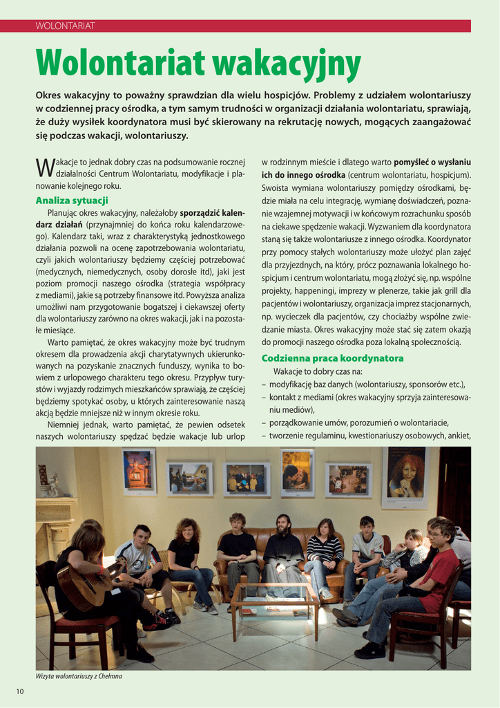 WOLONTARIAT Wolontariat wakacyjny Okres wakacyjny to poważny sprawdzian dla wielu hospicjów. Problemy z udziałem wolontariuszy w codziennej pracy ośrodka, a tym samym trudności w organizacji działania wolontariatu, sprawiają, że duży wysiłek koordynatora musi być skierowany na rekrutację nowych, mogących zaangażować się podczas wakacji, wolontariuszy. W akacje to jednak dobry czas na podsumowanie rocznej działalności Centrum Wolontariatu, modyfikacje i planowanie kolejnego roku. Analiza sytuacji Planując okres wakacyjny, należałoby sporządzić kalendarz działań (przynajmniej do końca roku kalendarzowego). Kalendarz taki, wraz z charakterystyką jednostkowego działania pozwoli na ocenę zapotrzebowania wolontariatu, czyli jakich wolontariuszy będziemy częściej potrzebować (medycznych, niemedycznych, osoby dorosłe itd), jaki jest poziom promocji naszego ośrodka (strategia współpracy z mediami), jakie są potrzeby finansowe itd. Powyższa analiza umożliwi nam przygotowanie bogatszej i ciekawszej oferty dla wolontariuszy zarówno na okres wakacji, jak i na pozostałe miesiące. Warto pamiętać, że okres wakacyjny może być trudnym okresem dla prowadzenia akcji charytatywnych ukierunkowanych na pozyskanie znacznych funduszy, wynika to bowiem z urlopowego charakteru tego okresu. Przypływ turystów i wyjazdy rodzimych mieszkańców sprawiają, że częściej będziemy spotykać osoby, u których zainteresowanie naszą akcją będzie mniejsze niż w innym okresie roku. Niemniej jednak, warto pamiętać, że pewien odsetek naszych wolontariuszy spędzać będzie wakacje lub urlop Wizyta wolontariuszy z Chełmna 10 w rodzinnym mieście i dlatego warto pomyśleć o wysłaniu ich do innego ośrodka (centrum wolontariatu, hospicjum). Swoista wymiana wolontariuszy pomiędzy ośrodkami, będzie miała na celu integrację, wymianę doświadczeń, poznanie wzajemnej motywacji i w końcowym rozrachunku sposób na ciekawe spędzenie wakacji. Wyzwaniem dla koordynatora staną się także wolontariusze z innego ośrodka. Koordynator przy pomocy stałych wolontariuszy może ułożyć plan zajęć dla przyjezdnych, na który, prócz poznawania lokalnego hospicjum i centrum wolontariatu, mogą złożyć się, np. wspólne projekty, happeningi, imprezy w plenerze, takie jak grill dla pacjentów i wolontariuszy, organizacja imprez stacjonarnych, np. wycieczek dla pacjentów, czy chociażby wspólne zwiedzanie miasta. Okres wakacyjny może stać się zatem okazją do promocji naszego ośrodka poza lokalną społecznością. Codzienna praca koordynatora – – – – Wakacje to dobry czas na: modyfikację baz danych (wolontariuszy, sponsorów etc.), kontakt z mediami (okres wakacyjny sprzyja zainteresowaniu mediów), porządkowanie umów, porozumień o wolontariacie, tworzenie regulaminu, kwestionariuszy osobowych, ankiet, WOLONTARIAT – porządkowanie i tworzenie nowych materiałów promocyjnych o hospicjum, – przygotowanie prelekcji na zbliżający się rok szkolny; współtworzenie broszur, skryptów informacyjnych dla wolontariuszy. Należy pamiętać, że prócz stałych zajęć koordynatora, spoczywa na nim odpowiedzialność za tworzenie atmosfery wolontariatu. Kółka zainteresowań, wspólne spotkania mogą przyciągnąć wolontariuszy, rozbudzić ich kreatywność i w ten sposób pomóc hospicjum. Poniżej znajduje się kilka przykładów: – kółko dziennikarskie – młodzież wyszukuje ciekawe sylwetki osób pomagających innym (w najbliższym otoczeniu rówieśników, rodziców, pracowników hospicjum, sąsiadów, nauczycieli), o których chciałoby napisać – najciekawsze historie mogą trafić na stronę hospicyjną lub do gazetki hospicyjnej; – kółko teatralne lub muzyczne – przygotowywanie przedstawień/koncertów dla pacjentów, na msze hospicyjne przy jednoczesnej integracji samych wolontariuszy; nawiązanie współpracy z lokalnymi grupami teatralnymi, lokalnymi artystami w celu przygotowania przedstawienia dla pacjentów; – sekcja plastyczna – przygotowywanie kartek okolicznościowych; wspólna aranżacja wnętrza wolontariatu/holu, świetlicy hospicjum/oddziału; prace ręczne (haft, druty, etc.) – jako prezenty dla pacjentów oraz jako asortyment na akcje – np. Jarmark, aukcje; sekcja plastyczna może być przeznaczona także dla pacjentów – wspólne zajęcia wolontariuszy z pacjentami; – kółko fotograficzne – zorganizowanie konkursu fotograficznego dla wolontariuszy i urządzenie wystawy zdjęć młodych fotografików na terenie hospicjum (np. najciekawsze zdjęcia z wakacji); wybranie zdjęć wolontariuszy do kalendarza na nowy rok; – kółko filmowe – wybór filmów przez koordynatora i wolontariuszy, pokazy dla pacjentów; – kółko kulinarne – organizacja kawiarenki/baru hospicyjnego; – kółko internetowe – uaktywnienie forum dla wolontariuszy poprzez zainicjowanie tematów „Lubię pomagać”, „Śpieszmy się kochać ludzi…”, „Wolontariat – dlaczego warto”, „Wolontariat na czasie”, „Wolontariat wakacyjny”, pomoc wolontariuszy w obróbce zdjęć, tworzeniu strony www przeznaczonej dla nich; – integracja wolontariuszy poprzez cotygodniowe spotkania w CW – plany, wspomnienia, ankiety, edukacja. – możliwość przekazania informacji na temat działalności hospicjum i promocja wolontariatu (poprzez prelekcje), – zaproponowanie konkretnej czynności wykonywanej przez uczestników półkolonii np. środa jest dniem zbierania i robienia bukietów dla pacjentów hospicjum lub kartek, które będziemy sprzedawać. Rekrutację można także przeprowadzić w parafiach, świetlicach oraz na festynach organizowanych przez miasto czy inne organizacje. Integracja Okres wakacyjny to także korzystna pora do integracji z wolontariuszami. Wakacje, sprzyjająca aura (pogoda i czas wolny od nauki) mogą nam stworzyć nowe pole do działania. Warto wówczas zadbać nie tylko o wolontariuszy, al