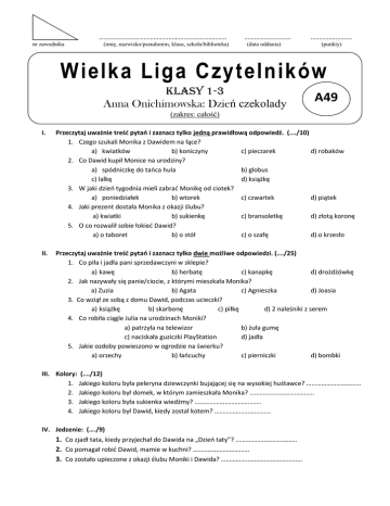 ………………………………………………………………….. nr zawodnika (imię, nazwisko/pseudonim, klasa, szkoła/biblioteka) ………………………. (data oddania) ……………………. (punkty) Wielka Liga Czytelników KLASY 1-3 Anna Onichimowska: Dzień czekolady A49 (zakres: całość) I. Przeczytaj uważnie treść pytań i zaznacz tylko jedną prawidłową odpowiedź. (…./10) 1. Czego szukali Monika z Dawidem na łące? a) kwiatków b) koniczyny c) pieczarek d) robaków 2. Co Dawid kupił Monice na urodziny? a) spódniczkę do tańca hula b) globus c) lalkę d) książkę 3. W jaki dzień tygodnia mieli zabrać Monikę od ciotek? a) poniedziałek b) wtorek c) czwartek d) piątek 4. Jaki prezent dostała Monika z okazji ślubu? a) kwiatki b) sukienkę c) bransoletkę d) złotą koronę 5. O co rozwalił sobie łokieć Dawid? a) o taboret b) o stół c) o szafę d) o krzesło II. Przeczytaj uważnie treść pytań i zaznacz tylko dwie możliwe odpowiedzi. (…./25) 1. Co piła i jadła pani sprzedawczyni w sklepie? a) kawę b) herbatę c) kanapkę d) drożdżówkę 2. Jak nazywały się panie/ciocie, z którymi mieszkała Monika? a) Zuzia b) Agata c) Agnieszka d) Joasia 3. Co wziął ze sobą z domu Dawid, podczas ucieczki? a) książkę b) skarbonę c) piłkę d) 2 naleśniki z serem 4. Co robiła ciągle Julia na urodzinach Moniki? a) patrzyła na telewizor b) żuła gumę c) naciskała guziczki PlayStation d) jadła 5. Jakie ozdoby powieszono w ogrodzie na świerku? a) orzechy b) łańcuchy c) pierniczki d) bombki III. Kolory: (…./12) 1. Jakiego koloru była peleryna dziewczynki bujającej się na wysokiej huśtawce? …………………………… 2. Jakiego koloru był domek, w którym zamieszkała Monika? ………………………………… 3. Jakiego koloru była sukienka wiedźmy? …………………………………. 4. Jakiego koloru był Dawid, kiedy został kotem? ……………………………. IV. Jedzenie: (…./9) 1. Co zjadł tata, kiedy przyjechał do Dawida na „Dzień taty”? ………………………………. 2. Co pomagał robić Dawid, mamie w kuchni? ……………………………. 3. Co zostało upieczone z okazji ślubu Moniki i Dawida? …………………………………………. V. Rozwiąż krzyżówkę (…./14) 1. Co Monika podała Dawidowi do powieszenia na choince? 2. Gdzie Monika trzymała swoją spódniczkę do tańca hula? 3. Jakie buty kupiła pani Agnieszka, Dawidowi i Monice? 4 4. Czym dojechał Dawid do miasteczka? . 5. Co pomógł Monice i jej cioci, lepić w kuchni Dawid? 6. Jaka chciała być Monika? 1 2 3 . . . 5 .6 . Hasło: ………………………………………………….. VI. Korzystając ze słowników, leksykonów lub encyklopedii w wersji papierowej przetłumacz na język angielski oraz napisz tytuł książki, z której korzystałeś (źródło): (…/6) 1. huśtawka - ………………………………………………………………………… 2. czekolada - ………………………………………………………………………… Źródło: …………………………………………………………………………………………………….. VII. Korzystając ze słownika ortograficznego w wersji papierowej uzupełnij brakujące „u” lub „ó”, „ż” lub „rz”, „ch” lub „h” oraz napisz tytuł książki, z której korzystałeś (źródło)(…./10) 1. śl _b ogr_d 2. podr _ _ _ oinka Źródło:…………………………………………………………………………………………………………….. VIII. Rozwiąż zadanie matematyczne: (…./6) Monika chciała kupić 4 czekolady. W sklepie dowiedziała się, że 1 czekolada kosztuje 2,59. Ile pieniędzy wyda Monika kupując 4 czekolady? Działanie: ……………………………………………………………………………………………………………………………………………….. Odpowiedź: ……………………………………………………………………………………………………………………………………………. IX. Zadanie przyrodnicze: (…./6) Różne organizacje felinologiczne stosują swoje kategoryzacje ras. W Polsce najczęściej spotykaną jest kod EMS stosowany przez FIFe i WCF. Podaj 4 kategorie ras kotów według FIFe:. Kategoria I – ………………………………………………………………………… Kategoria II – …………………………………………………… Kategoria III – …………………………………………………………………………………. Kategoria IV – …………………………………………………………………………………. X. Jeśli mógłbyś/mogłabyś wyruszyć w podróż, to gdzie byś pojechał/pojechała. Odpowiedz pełnym zdaniem. (…./2) ………………………………………………………………………………………………………………………………………………………………… ………………………………………………………………………………………………………………………………………………………………… ………………………………………………………………………………………………………………………………………………………………… ZIARENKO MĄDROŚCI: "Czytanie książek to najpiękniejsza zabawa, jaką sobie ludzkość wymyśliła." Wisława Szymborska WIELKA LIGA CZYTELNIKÓW— KL1-3 www.Wielka-Liga.pl FORMULARZ NR A49 – wersja: 1.0, autor: Aleksandra Kubis-Szlachta Data oprac. wrzesień 2016r.