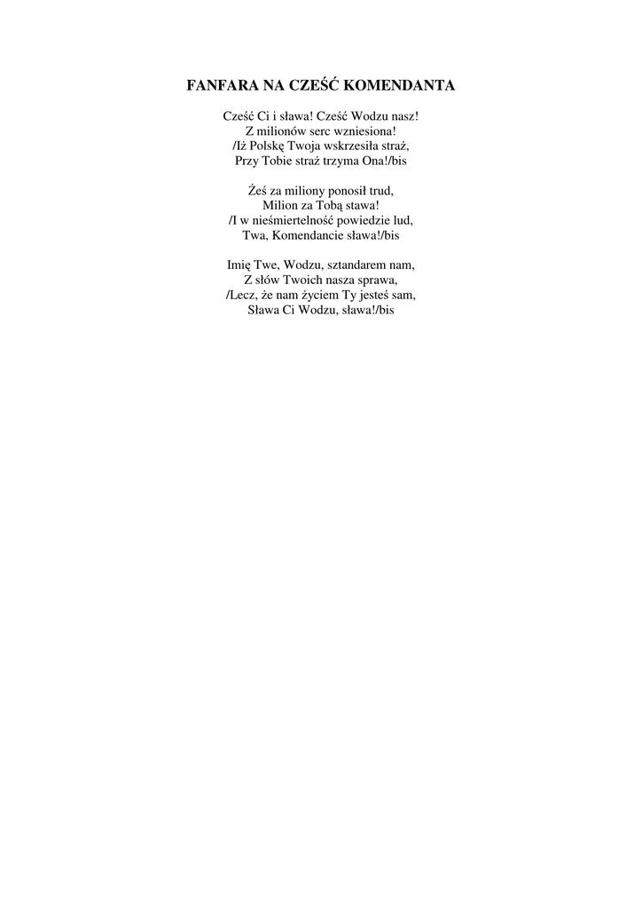 FANFARA NA CZEŚĆ KOMENDANTA Cześć Ci i sława! Cześć Wodzu nasz! Z milionów serc wzniesiona! /Iż Polskę Twoja wskrzesiła straż, Przy Tobie straż trzyma Ona!/bis Żeś za miliony ponosił trud, Milion za Tobą stawa! /I w nieśmiertelność powiedzie lud, Twa, Komendancie sława!/bis Imię Twe, Wodzu, sztandarem nam, Z słów Twoich nasza sprawa, /Lecz, że nam życiem Ty jesteś sam, Sława Ci Wodzu, sława!/bis