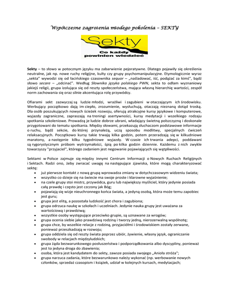 Współczesne zagrożenia młodego pokolenia – SEKTY Sekty – to słowo w potocznym języku ma zabarwienie pejoratywne. Dlatego pojawiły się określenia neutralne, jak np. nowe ruchy religijne, kulty czy grupy psychomanipulacyjne. Etymologicznie wyraz „sekta” wywodzi się od łacińskiego czasownika sequor – „naśladować, iść, podążać za kimś”, bądź słowo secare – „odcinać”. Według Słownika języka polskiego PWN, sekta to odłam wyznaniowy jakiejś religii, grupa izolująca się od reszty społeczeństwa, mająca własną hierarchię wartości, zespół norm zachowania się oraz silnie akcentująca rolę przywódcy. Ofiarami sekt zazwyczaj są ludzie młodzi, wrażliwi i zagubieni w otaczającym ich środowisku. Werbujący początkowo dają im ciepło, zrozumienie, wysłuchują, otaczają nieznaną dotąd troską. Dla osób poszukujących nowych ścieżek rozwoju, oferują atrakcyjne kursy językowe i komputerowe, wyjazdy zagraniczne, zapraszają na treningi asertywności, kursy medytacji i wszelkiego rodzaju spotkania szkoleniowe. Prowadzą je ludzie dobrze ubrani, władający świetną polszczyzną i doskonale przygotowani do tematu spotkania. Między słowami, przekazują słuchaczom podstawowe informacje o ruchu, bądź sekcie, do której przynależą, uczą sposobu modlitwy, specjalnych ćwiczeń relaksacyjnych. Początkowo kursy takie trwają kilka godzin, potem przeradzają się w kilkudniowe maratony, a następnie kilku tygodniowe wyjazdy. W czasie ich trwania adepci, poddawani są rygorystycznym próbom wytrzymałości, śpią po kilka godzin dziennie. Każdemu z nich zwykle towarzyszy "przyjaciel", którego zadaniem jest negowanie pojawiających się wątpliwości. Sektami w Polsce zajmuje się między innymi Centrum Informacji o Nowych Ruchach Religijnych i Sektach. Radzi ono, żeby zwracać uwagę na następujące zjawiska, które mogą charakteryzować sektę: już pierwsze kontakt z nową grupą wprowadza zmiany w dotychczasowym widzeniu świata; wszystko co dzieje się na świecie ma swoje proste i klarowne wyjaśnienie; na czele grupy stoi mistrz, przywódca, guru lub największy myśliciel, który jedynie posiada całą prawdę i często jest czczony jak Bóg; pojawiają się wizje nieuchronnego końca świata, a jedyną osobą, która może temu zapobiec jest guru; grupa jest elitą, a pozostała ludzkość jest chora i zagubiona; grupa odrzuca naukę w szkołach i uczelniach. Jedynie nauka grupy jest uważana za wartościową i prawdziwą; wszystkie osoby występujące przeciwko grupie, są uznawane za wrogów; grupa ocenia siebie jako prawdziwą rodziną i tworzy jedną, nierozerwalną wspólnotę; grupa chce, by wszelkie relacje z rodziną, przyjaciółmi i środowiskiem zostały zerwane, ponieważ przeszkadzają w rozwoju; grupa oddziela się od reszty świata poprzez ubiór, żywienie, własny język, ograniczanie swobody w relacjach międzyludzkich; grupa żąda bezwarunkowego posłuszeństwa i podporządkowania albo dyscypliny, ponieważ jest to jedyna droga do zbawienia; osoba, która jest kandydatem do sekty, zawsze posiada swojego „Anioła stróża"; grupa narzuca zadania, które bezwarunkowo należy wykonać (np. werbowanie nowych członków, sprzedaż czasopism i książek, udział w kolejnych kursach, medytacjach; jeżeli dana osoba nie odniesie wymaganego przez grupę sukcesu lub uzdrowienia, wówczas uważa się ją za winną przegranej; członkiem grupy ma prawo zostać każda osoba, podejmując natychmiastową decyzje; w grupie panuje zasada, że pewnych rzeczy nie da się po prostu wyjaśnić. Do najpopularniejszych sekt na świecie, należą obecnie: Kościół Nauki o Wiedzy (Scientolodzy), Kościół Zjednoczenia (Sun Myung Moon), Sataniści, Wspólnota Niezależnych Zgromadzeń Misyjnych "Rodzina", Chrystianie. O przynależności do sekty, mogą świadczyć następujące sygnały: ▪ dziecko jest milczące i zamknięte w sobie; ▪ nie reaguje na bodźce dochodzące ze świata zewnętrznego, sprawia wrażenie nieobecnego, lub będącego w transie; ▪ w jego słownictwie pojawiają się nieznane dotąd i niewytłumaczalne zwroty; ▪ spędza dużo czasu z nowymi przyjaciółmi; ▪ odnosi się do wszystkiego krytycznie; ▪ głosi nowe poglądy i zmienia sposób formułowania swoich myśli; ▪ traci własną osobowość; ▪ nie potrafi myśleć abstrakcyjnie; ▪ porzuca dotychczasowe nawyki żywieniowe; ▪ przynosi do domu nową literaturę o charakterze pseudofilozoficznym ▪ odnosi się z dystansem i chłodem do rodziców, zrywa kontakty z dotychczasowymi przyjaciółmi; ▪ jest przemęczone i senne, szybko traci dotychczasową wagę. Jak zapobiegać? Celem zachowań prewencyjnych powinno być: ▪ wyposażenie młodzieży w wiedzę i umiejętności z zakresu rozpoznawania i przeciwdziałania technikom manipulacji wykorzystywanym przez sekty; ▪ kształtowanie takich cech osobowości i postaw, które w sposób neutralny podwyższają odporność młodego człowieka na manipulację ze strony sekt, np. umiejętność radzenia sobie ze stresem, budowanie pozytywnego i realnego obrazu siebie, satysfakcjonujących relacji interpersonalnych, wyrażania własnych uczuć, autonomii myślenia, asertywności itp. Wart przeczytać: Cialdini, R., 1996, Wywieranie wpływu na ludzi, teoria i praktyka, Gdańskie Wydawnictwo Psychologiczne, Gdańsk. Hassan, S., 1997, Psychomanipulacja w sektach, Wyd. Ravi. Łódź. Kuncewicz, D., Opolska, T., Wasiak, M., 2000, Sekty. Przedmiot fascynacji i zagrożeń, Centrum Metodyczne pomocy Psychologiczno-Pedagogicznej, Warszawa. Mancewicz, M., 2010, Rozważania terminologiczne nad pojęciem sekta, [w:] Grzesiak-Witek D. Witek P (red.)., Sekty jako zagrożenie i wyzwanie XXI wieku, Sandomierz. Prokop, J., 1994, Uwaga rodzice! – Sekty, Co każdy powinien wiedzieć, Oficyna Wydawnicza SPAR, Warszawa. Purzycka, M., 1998, Nowe Ruchy Religijne w Polsce., [w:] Rowiński G. Purzycka M., 