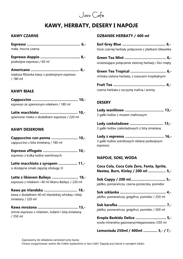 Jazz Cafe KAWY, HERBATY, DESERY I NAPOJE KAWY CZARNE DZBANEK HERBATY / 400 ml Espresso …………………………..………….… 6,- Earl Grey Blue ……………………………...… 6,- mała, mocna czarna liście czarnej herbaty połączone z płatkami bławatka Espresso doppio ………………………...…... 8,- Green Tea Mint ………………………….…… 6,- podwójne espresso / 60 ml Americano ……………………………….....… 8,większa filiżanka kawy z podwójnym espresso / 180 ml orzeźwiające połączenie zielonej herbaty i liści mięty Green Tea Tropical ………………………..… 6,chińska zielona herbata, z owocami tropikalnymi Fruit Tea ……………………….…………….… 6,- KAWY BIAŁE Cappuccino ………………………………..… 10,espresso ze spienionym mlekiem / 180 ml Latte macchiato ………………………….… 10,spienione mleko z dodatkiem espresso / 220 ml czarna herbata z soczystą maliną i aronią DESERY Lody waniliowe ………………………….…. 13,3 gałki lodów z musem malinowym Lody czekoladowe ………………………… 13,- KAWY DESEROWE 3 gałki lodów czekoladowych z bitą śmietaną Cappuccino con panna ……..………….… 10,- Lody z espresso …….………………………. 16,- cappuccino z bita śmietaną / 180 ml 3 gałki lodów waniliowych oblane podwójnym espresso Espresso affogato ……………………….… 10,espresso z kulką lodów waniliowych Latte macchiato z syropem …………….. 11,o dostępne smaki zapytaj obsługę Latte z likierem Baileys ………………...… 18,espresso z mlekiem i 40 ml likieru Baileys / 220 ml Kawa po irlandzku ……………………...… 18,kawa z dodatkiem 40 ml irlandzkiej whiskey i bitej śmietany / 220 ml Kawa mrożona …………………….……….. 13,zimne espresso z mlekiem, lodami i bitą śmietaną / 350 ml NAPOJE, SOKI, WODA Coca Cola, Coca Cola Zero, Fanta, Sprite, Nestea, Burn, Kinley / 200 ml ...……….… 5,Sok Cappy / 200 ml.………..……………..... 5,jabłko, pomarańcza, czarna porzeczka, pomidor Sok szklanka ………………………………..… 4,jabłko, pomarańcza, grejpfrut, pomidor / 250 ml Sok karafka …………………………..……..… 7,jabłko, pomarańcza, grejpfrut, pomidor / 500 ml Kropla Beskidu Delice .……………...……... 5,woda mineralna gazowana/niegazowana /350 ml Lemoniada 250ml / 400ml …..…..… 5,- / 7,Zapraszamy do składania zamówień przy barze. Chcesz zorganizować ważne dla Ciebie wydarzenie w Jazz Cafe? Zapytaj przy barze o wynajem lokalu. Jazz Cafe ALKOHOLE, NAPOJE I PRZEKĄSKI PIWO NA ROZGRZEWKĘ Carlsberg z nalewaka ……………...… 4,- / 6,- Grzaniec galicyjski ………………………… 10,- 300 ml / 500 ml Okocim z nalewaka …………………... 4,- / 6,300 ml / 500 ml Piwo butelkowe ……………………..……… 7,dostępne piwa widoczne za barem Piwo Pomorskie Miodowe / 500 ml ..….. 9,- wino grzane z pomarańczą, goździkami i cynamonem / 200 ml Piwo grzane ……………………………….… 10,piwo z pomarańczą, goździkami, cynamonem i syropem malinowym lub imbirowym / 500 ml Herbata z rumem ………………………….. 12,herbata z rumem Golden Rum / 300 ml Cydr Miłosławski ……………....……………. 9,- Lemoniada malinowa (bez alkoholu) ..... 7,- półsłodki/półwytrawny / 500 ml na ciepło / 400 ml WINO BIAŁE/CZERWONE DRINKI Kieliszek wina 100 ml …………………….… 7,- Wódka z colą …………………………..…… 10,- Karafka wina 250 ml …………..............… 15,Karafka wina 500 ml ………...…………… 25,Karafka wina 1000 ml ………………….… 45,- / 200 ml Whiskey z colą ……………………………… 15,/ 200 ml Cuba libre ……………………………….…… 15,rum z colą i limonka / 200 ml WÓDKA Wódka czysta i gatunkowa …………….… 6,dostępne wódki widoczne za barem / 40 ml Wódka czysta Amundsen …………………. 9,- Mohito …………………………………..…… 15,rum, limonka, mięta / 200 ml Gin z tonikiem ……………………………… 15,/ 200 ml Campari Orange…………..………………... 15,- / 40 ml Sznaps …………………………………………. 5,gruszka/jabłko / 40 ml Campari, sok pomarańczowy / 200 ml PRZEKĄSKI WHISKEY Orzeszki, paluszki, chipsy ……………….… 5,- Whiskey ………………………………………. 10,- Nachosy ……………………………………...… 8,- dostępna whiskey widoczna za barem / 40 ml Whiskey …………………………………….… 12,Jack Daniels/Johnny Walker Black Label / 40 ml Zapraszamy do składania zamówień przy barze. Chcesz zorganizować ważne dla Ciebie wydarzenie w Jazz Cafe? Zapytaj przy barze o wynajem lokalu.
