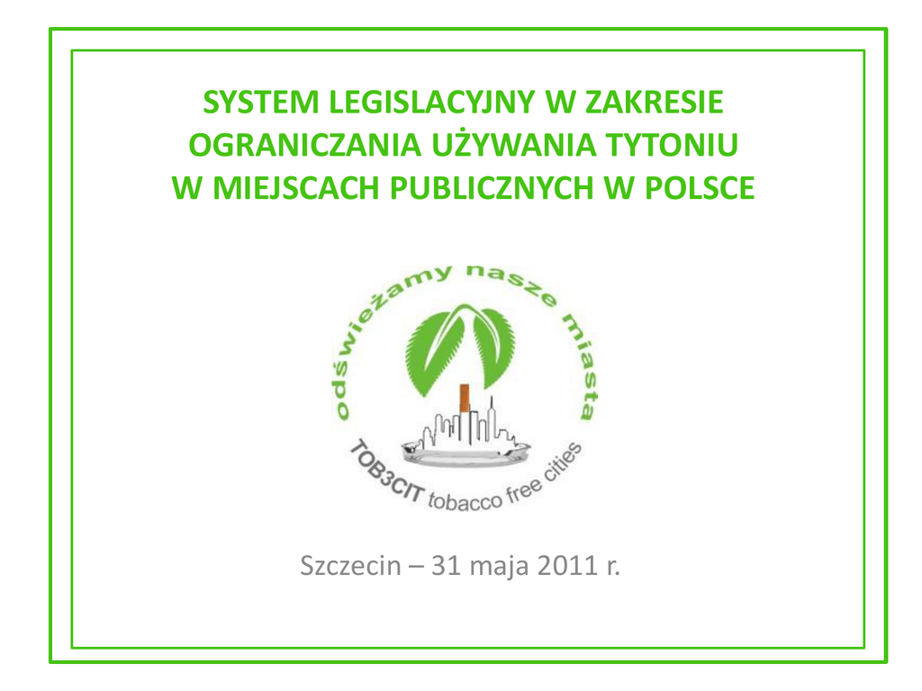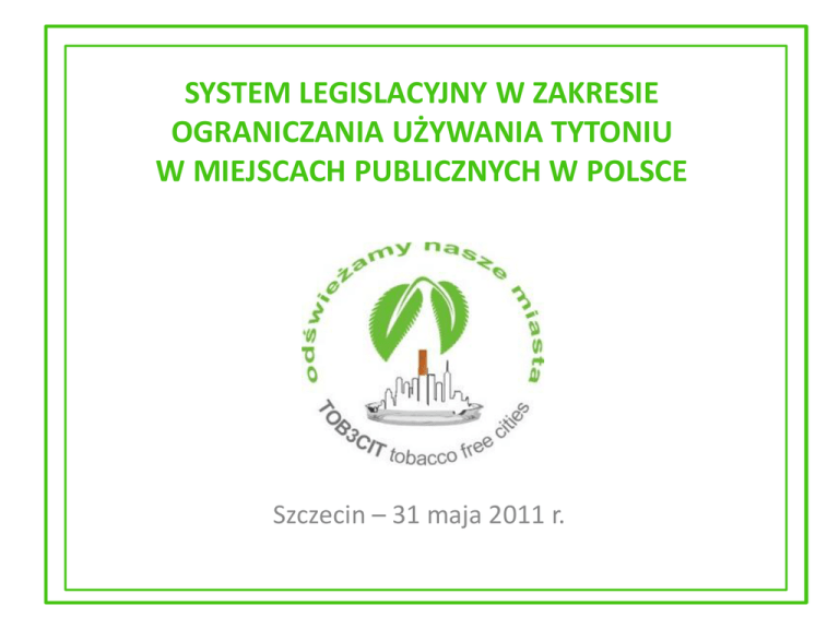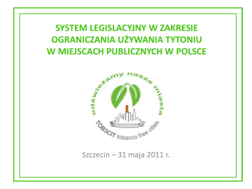 SYSTEM LEGISLACYJNY W ZAKRESIE OGRANICZANIA UŻYWANIA TYTONIU W MIEJSCACH PUBLICZNYCH W POLSCE Szczecin – 31 maja 2011 r. Ustawa z 9 listopada 1995 r. o ochronie zdrowia przed następstwami używania tytoniu i wyrobów tytoniowych Gdzie obowiązuje zakaz palenia? http://www.sxc.hu Zakaz palenia obowiązuje: • na terenie zakładów opieki zdrowotnej, jednostek organizacyjnych systemu oświaty oraz pomocy społecznej • na terenie uczelni • w pomieszczeniach zakładów pracy • w pomieszczeniach obiektów kultury i wypoczynku do użytku publicznego • w lokalach gastronomiczno-rozrywkowych • w środkach pasażerskiego transportu publicznego oraz obiektach służące obsłudze podróżnych • na przystankach komunikacji publicznej • w pomieszczeniach obiektów sportowych • w ogólnodostępnych miejscach przeznaczonych do wypoczynku i zabawy dzieci Wszystkie te miejsca mogą stać się miejscami wolnymi od dymu tytoniowego … …w 100%! http://www.sxc.hu Obowiązki właściciela lub zarządzającego obiektem… Umieszczenie w widocznym miejscu informacji o zakazie palenia tytoniu na danym terenie: Oznaczenie słowne i graficzne: źr: Ian Gray - CIEH źr: Ian Gray - CIEH Żr: http://www.panoramadiario.com/typo3temp/pics/6f3595f1d3.jpg http://www.clarin.com/diario/2006/10/01/thumb/t060dh02.jpg Co grozi za nieprzestrzeganie przepisów ustawy?… Kara grzywny do 2 000 pln za nieumieszczenie znaku zakazu palenia tytoniu – odpowiada właściciel lub zarządzający do 500 pln za palenie w miejscach objętych zakazem – odpowiada osoba paląca Kto egzekwuje zakaz?… Podmioty uprawnione: Straż Miejska Policja Państwowa Inspekcja Sanitarna http://www.sxc.hu/ Zakład pracy… http://www.sxc.hu Konstytucja RP i Kodeks Pracy Konstytucja RP: Każdy ma prawo do bezpiecznych i higienicznych warunków pracy. Sposób realizacji tego prawa oraz obowiązki pracodawcy określa ustawa (art. 66 ust.1) Kodeks Pracy: Pracodawca jest obowiązany chronić zdrowie i życie pracowników przez zapewnienie bezpiecznych i higienicznych warunków pracy (…) (art. 207 § 2) Pracodawca może ponosić odpowiedzialność: • odszkodowawczą - gdyby pracownik niepalący miał problemy zdrowotne po przebywaniu w palącym towarzystwie (Kodeks cywilny) [sprawa Hanny Niewiadomskiej przeciwko firmie Skanska S.A.] • za nieprzestrzeganie przepisów bhp (art. 283 § 1 Kodeksu pracy) Pracownikowi może grozić: kara upomnienia, nagany, kara pieniężna w ramach odpowiedzialności służbowej za nieprzestrzeganie przepisów i zasad bhp (art. 108 Kodeksu pracy) [może mieć np. obniżone wynagrodzenie za to, że pali poza czasem przerw wyznaczonych przez kodeks pracy/ regulamin pracy] Jakie są korzyści wprowadzenia zakazu palenia dla pracowników i pracodawcy? http://www.sxc.hu Korzyści ekonomiczne polityki ochrony przed dymem tytoniowym w zakładzie pracy większa wydajność pracowników – zarówno tych, którzy rzucili palenie, jak i pracowników niepalących, nienarażonych już na działanie dymu tytoniowego palący pracownicy tracą około 50% dni roboczych więcej niż niepalący, u byłych palaczy liczba ta zmniejsza się o około 30% w porównaniu z niepalącymi* palący pracownik spędza rocznie około 22 dni na przerwach na papierosa *Environmental Protection Agency. The costs and benefits of smoking restrictions: an assessment of the Smoke Free Environment Act of 1993 – 1994 r. Korzyści ekonomiczne polityki ochrony przed dymem tytoniowym w zakładzie pracy niższe koszty zatrudnienia spowodowane mniejszą potrzebą uzupełniania personelu utraconego wskutek zachorowalności i umieralności związanych z paleniem tytoniu oraz niższymi kosztami ubezpieczenia pracowników oszczędności pracodawców szkockich: 437 – 652 mln € przed wprowadzeniem przepadały m.in. z powodu mniejszej wydajności (strata w wysokości 380 – 595 mln €) oraz częstszych nieobecności w pracy (ok. 52 mln €)* *Costs of employee smoking in the workplace in Scotland – Parrott, Godfrey, Raw, 2000r. Korzyści ekonomiczne polityki ochrony przed dymem tytoniowym w zakładzie pracy niższe koszty utrzymania pomieszczeń zakładu pracy nie ponosi się kosztów tworzenia i utrzymania oddzielnie wietrzonej palarni, maleją koszty sprzątania pomieszczeń i konserwacji wyposażenia oraz koszty ubezpieczenia od ognia (maleje liczba pożarów) Korzyści zdrowotne polityki ochrony przed dymem tytoniowym w zakładzie pracy miejsce pracy wolne od dymu tytoniowego wpływa na polepszenie zdrowia pracowników w USA, ilość zawałów serca zmniejszyłaby się o ok. 6250, udarów mózgu o ok. 1270 przypadków rocznie, a bezpośrednie koszty medyczne zaoszczędzone na leczeniu tych 2 chorób wyniosłyby 224 miliony $ rocznie (analiza efektów zdrowotnych i ekonomicznych wprowadzenia na rok ochrony przed dymem tytoniowym we wszystkich miejscach pracy )* *Cardiovascular Health and Economic Effects of Smoke free Workplaces – Ong, Stanton, Glantz, 2004 r. ? Źr: http://www.larioja.com/prensa/noticias/200912/15/fotos/2034177.jpg http://www.sxc.hu/ Dziękuję za uwagę Małgorzata Kuncewicz Facilitator Projektu TOB3CIT Główny Inspektorat Sanitarny [email protected] + 48 22 536 13 79