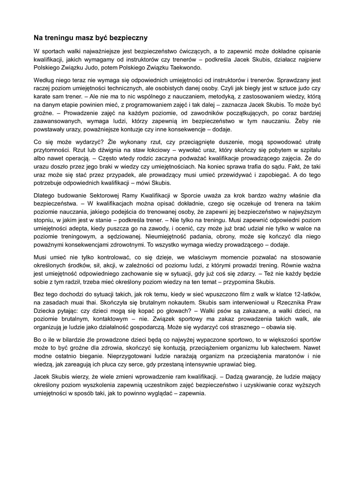 Na treningu masz być bezpieczny W sportach walki najważniejsze jest bezpieczeństwo ćwiczących, a to zapewnić może dokładne opisanie kwalifikacji, jakich wymagamy od instruktorów czy trenerów – podkreśla Jacek Skubis, działacz najpierw Polskiego Związku Judo, potem Polskiego Związku Taekwondo. Według niego teraz nie wymaga się odpowiednich umiejętności od instruktorów i trenerów. Sprawdzany jest raczej poziom umiejętności technicznych, ale osobistych danej osoby. Czyli jak biegły jest w sztuce judo czy karate sam trener. – Ale nie ma to nic wspólnego z nauczaniem, metodyką, z zastosowaniem wiedzy, którą na danym etapie powinien mieć, z programowaniem zajęć i tak dalej – zaznacza Jacek Skubis. To może być groźne. – Prowadzenie zajęć na każdym poziomie, od zawodników początkujących, po coraz bardziej zaawansowanych, wymaga ludzi, którzy zapewnią im bezpieczeństwo w tym nauczaniu. Żeby nie powstawały urazy, poważniejsze kontuzje czy inne konsekwencje – dodaje. Co się może wydarzyć? Źle wykonany rzut, czy przeciągnięte duszenie, mogą spowodować utratę przytomności. Rzut lub dźwignia na staw łokciowy – wywołać uraz, który skończy się pobytem w szpitalu albo nawet operacją. – Często wtedy rodzic zaczyna podważać kwalifikacje prowadzącego zajęcia. Że do urazu doszło przez jego braki w wiedzy czy umiejętnościach. Na koniec sprawa trafia do sądu. Fakt, że taki uraz może się stać przez przypadek, ale prowadzący musi umieć przewidywać i zapobiegać. A do tego potrzebuje odpowiednich kwalifikacji – mówi Skubis. Dlatego budowanie Sektorowej Ramy Kwalifikacji w Sporcie uważa za krok bardzo ważny właśnie dla bezpieczeństwa. – W kwalifikacjach można opisać dokładnie, czego się oczekuje od trenera na takim poziomie nauczania, jakiego podejścia do trenowanej osoby, że zapewni jej bezpieczeństwo w najwyższym stopniu, w jakim jest w stanie – podkreśla trener. – Nie tylko na treningu. Musi zapewnić odpowiedni poziom umiejętności adepta, kiedy puszcza go na zawody, i ocenić, czy może już brać udział nie tylko w walce na poziomie treningowym, a sędziowanej. Nieumiejętność padania, obrony, może się kończyć dla niego poważnymi konsekwencjami zdrowotnymi. To wszystko wymaga wiedzy prowadzącego – dodaje. Musi umieć nie tylko kontrolować, co się dzieje, we właściwym momencie pozwalać na stosowanie określonych środków, sił, akcji, w zależności od poziomu ludzi, z którymi prowadzi trening. Równie ważna jest umiejętność odpowiedniego zachowanie się w sytuacji, gdy już coś się zdarzy. – Też nie każdy będzie sobie z tym radził, trzeba mieć określony poziom wiedzy na ten temat – przypomina Skubis. Bez tego dochodzi do sytuacji takich, jak rok temu, kiedy w sieć wpuszczono film z walk w klatce 12-latków, na zasadach muai thai. Skończyła się brutalnym nokautem. Skubis sam interweniował u Rzecznika Praw Dziecka pytając: czy dzieci mogą się kopać po głowach? – Walki psów są zakazane, a walki dzieci, na poziomie brutalnym, kontaktowym – nie. Związek sportowy ma zakaz prowadzenia takich walk, ale organizują je ludzie jako działalność gospodarczą. Może się wydarzyć coś strasznego – obawia się. Bo o ile w bilardzie źle prowadzone dzieci będą co najwyżej wypaczone sportowo, to w większości sportów może to być groźne dla zdrowia, skończyć się kontuzją, przeciążeniem organizmu lub kalectwem. Nawet modne ostatnio bieganie. Nieprzygotowani ludzie narażają organizm na przeciążenia maratonów i nie wiedzą, jak zareagują ich płuca czy serce, gdy przestaną intensywnie uprawiać bieg. Jacek Skubis wierzy, że wiele zmieni wprowadzenie ram kwalifikacji. – Dadzą gwarancję, że ludzie mający określony poziom wyszkolenia zapewnią uczestnikom zajęć bezpieczeństwo i uzyskiwanie coraz wyższych umiejętności w sposób taki, jak to powinno wyglądać – zapewnia.