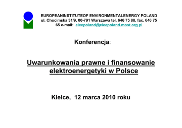 EUROPEANINSTITUTEOF ENVIRONMENTALENERGY POLAND ul. Chocimska 31/9, 00-791 Warszawa tel. 646 75 88, fax. 646 75 65 e-mail: [email protected] Konferencja: Uwarunkowania prawne i finansowanie elektroenergetyki w Polsce Kielce, 12 marca 2010 roku EUROPEANINSTITUTEOF ENVIRONMENTALENERGY POLAND ul. Chocimska 31/9, 00-791 Warszawa tel. 646 75 88, fax. 646 75 65 e-mail: [email protected] European Institute of Environmental Energy Poland rozpoczął swoją działalność na terenie Polski w maju 1994 roku. Powstał z inicjatywy: European Institute of Environmental Energy Fundacji Rozwoju Ciepłownictwa „Unia Ciepłownictwa” Krajowej Agencji Poszanowania Energii S.A. The Investment Fund for Central and Eastern Europe EUROPEANINSTITUTEOF ENVIRONMENTALENERGY POLAND ul. Chocimska 31/9, 00-791 Warszawa tel. 646 75 88, fax. 646 75 65 e-mail: [email protected] Zarządem Instytutu od dnia powstania kieruje Lilla LESIAK. Instytut opracowuje studia finansowania projektów proekologicznych w oparciu o środki krajowe i zagraniczne w tym środki funduszy ekologicznych, środki pomocowe oraz pochodzące z ekokonwersji polskiego zadłużenia. Instytut prowadzi doradztwo w zakresie prowadzenia inwestycji termomodernizacyjnych, energooszczędnych oraz odnawialnych źródeł energii. EUROPEANINSTITUTEOF ENVIRONMENTALENERGY POLAND ul. Chocimska 31/9, 00-791 Warszawa tel. 646 75 88, fax. 646 75 65 e-mail: [email protected] Instytut przygotował dokumentację techniczną i montaż finansowy dla kilkudziesięciu projektów w zakresie odnawialnych źródeł energii, w tym: baterii słonecznych, pomp ciepła, kotłowni na biomasę, ferm wiatrowych, biogazowni oraz systemów kogeneracyjnych. Instytut od momentu swego powstania jest organizacją non profit. Wynagrodzenie z tytułu realizacji montażu finansowego jest realizowane wyłącznie na zasadzie „success fee”, tj. jakakolwiek płatność z tego tytułu uiszczania jest przez Inwestorów wyłącznie po przyznaniu preferencyjnego finansowania. EUROPEANINSTITUTEOF ENVIRONMENTALENERGY POLAND ul. Chocimska 31/9, 00-791 Warszawa tel. 646 75 88, fax. 646 75 65 e-mail: [email protected] Ścieżki rozwoju agroenergetyki w Polsce: • baterie słoneczne, * fotovoltaika, • biogazownie, • biopaliwa, • geotermia, • elektrownie wiatrowe, • pompy ciepła. EUROPEANINSTITUTEOF ENVIRONMENTALENERGY POLAND ul. Chocimska 31/9, 00-791 Warszawa tel. 646 75 88, fax. 646 75 65 e-mail: [email protected] Uwarunkowania prawne rozwoju agroenergetyki w Polsce: • Dyrektywa 2009/28/WE, (2010 - 7,5%, 2020 – 15%), • ustawa „Prawo energetyczne” wraz z aktami wykonawczymi, obowiązek zakupu energii pochodzącej ze źródeł odnawialnych lub kogeneracji, • certyfikaty, • stabilność ceny, • dramatyczne kłopoty z przyłączeniem do sieci. EUROPEANINSTITUTEOF ENVIRONMENTALENERGY POLAND ul. Chocimska 31/9, 00-791 Warszawa tel. 646 75 88, fax. 646 75 65 e-mail: [email protected] Podstawowe bariery w finansowaniu inwestycji w agroenergetyce to: • wysokość pomocy publicznej: mikro przedsiębiorstwa, • konieczność zbilansowania finansowania inwestycji w 100 %, • płynność finansowa, • zabezpieczenia uzyskanego preferencyjnego finansowania. EUROPEANINSTITUTEOF ENVIRONMENTALENERGY POLAND ul. Chocimska 31/9, 00-791 Warszawa tel. 646 75 88, fax. 646 75 65 e-mail: [email protected] Formy finansowania: • Narodowy i Wojewódzkie Fundusze Ochrony Środowiska i Gospodarki Wodnej: preferencyjnie oprocentowana (6%), umarzalna do wysokości 50%, pożyczka do wysokości 75% wartości inwestycji, subfundusz URE, • Green Investment Scheme (GIS), • Fundusze unijne: Programy Operacyjne: Infrastruktura i Środowisko oraz Innowacyjna Gospodarka, Regionalne Programy Operacyjne, EUROPEANINSTITUTEOF ENVIRONMENTALENERGY POLAND ul. Chocimska 31/9, 00-791 Warszawa tel. 646 75 88, fax. 646 75 65 e-mail: [email protected] Formy finansowania cd.: • • • • Program Rozwoju Obszarów Wiejskich, Krajowy Program Restrukturyzacji, finansowanie w stronie trzeciej, preferencyjnie oprocentowane kredyty: kredyty producenckie. EUROPEANINSTITUTEOF ENVIRONMENTALENERGY POLAND ul. Chocimska 31/9, 00-791 Warszawa tel. 646 75 88, fax. 646 75 65 e-mail: [email protected] Ocena poszczególnych form finansowania, zasady współdziałania z bankami i instytucjami finansowymi: • • • • • biznes plan, studium wykonalności, uwarunkowania organizacyjne, sytuacja finansowa Inwestora, aspekty prawne organizacji inwestycji. EUROPEANINSTITUTEOF ENVIRONMENTALENERGY POLAND ul. Chocimska 31/9, 00-791 Warszawa tel. 646 75 88, fax. 646 75 65 e-mail: [email protected] Zasady współdziałania w ramach programów preferencyjnego finansowania: • • • • brak możliwości łączenia niektórych systemów finansowania, możliwość zaliczkowania zadań w trakcie realizacji, różne terminy naboru do poszczególnych systemów finansowania, różnorodne uwarunkowania ubiegania się o preferencyjne dofinansowanie z poszczególnych źródeł – dokumentacja, • możliwość połączenia preferencyjnego finansowania z kapitałem komercyjnym. EUROPEANINSTITUTEOF ENVIRONMENTALENERGY POLAND ul. Chocimska 31/9, 00-791 Warszawa tel. 646 75 88, fax. 646 75 65 e-mail: [email protected] Dziękuję za uwagę LILLA LESIAK