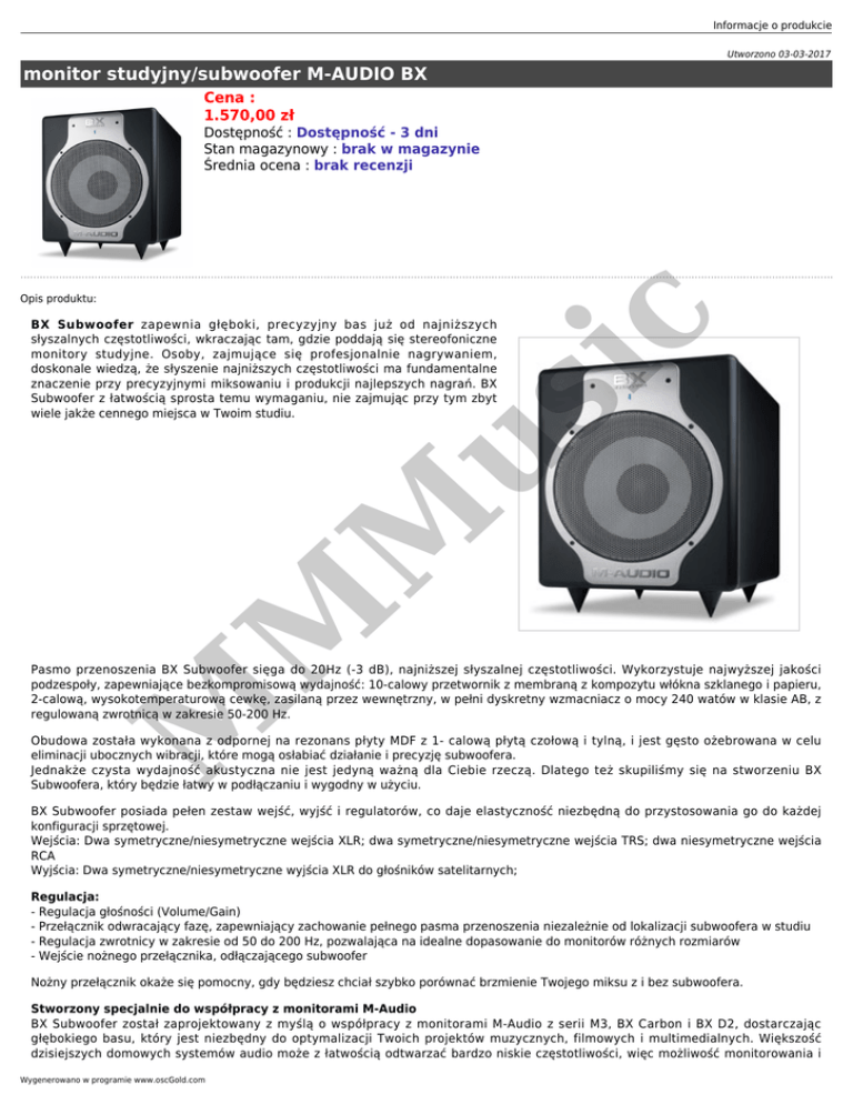 Informacje o produkcie Utworzono 03-03-2017 monitor studyjny/subwoofer M-AUDIO BX Cena : 1.570,00 zł Dostępność : Dostępność - 3 dni Stan magazynowy : brak w magazynie Średnia ocena : brak recenzji ic Opis produktu: M M us BX Subwoofer zapewnia głęboki, precyzyjny bas już od najniższych słyszalnych częstotliwości, wkraczając tam, gdzie poddają się stereofoniczne monitory studyjne. Osoby, zajmujące się profesjonalnie nagrywaniem, doskonale wiedzą, że słyszenie najniższych częstotliwości ma fundamentalne znaczenie przy precyzyjnymi miksowaniu i produkcji najlepszych nagrań. BX Subwoofer z łatwością sprosta temu wymaganiu, nie zajmując przy tym zbyt wiele jakże cennego miejsca w Twoim studiu. M Pasmo przenoszenia BX Subwoofer sięga do 20Hz (-3 dB), najniższej słyszalnej częstotliwości. Wykorzystuje najwyższej jakości podzespoły, zapewniające bezkompromisową wydajność: 10-calowy przetwornik z membraną z kompozytu włókna szklanego i papieru, 2-calową, wysokotemperaturową cewkę, zasilaną przez wewnętrzny, w pełni dyskretny wzmacniacz o mocy 240 watów w klasie AB, z regulowaną zwrotnicą w zakresie 50-200 Hz. Obudowa została wykonana z odpornej na rezonans płyty MDF z 1- calową płytą czołową i tylną, i jest gęsto ożebrowana w celu eliminacji ubocznych wibracji, które mogą osłabiać działanie i precyzję subwoofera. Jednakże czysta wydajność akustyczna nie jest jedyną ważną dla Ciebie rzeczą. Dlatego też skupiliśmy się na stworzeniu BX Subwoofera, który będzie łatwy w podłączaniu i wygodny w użyciu. BX Subwoofer posiada pełen zestaw wejść, wyjść i regulatorów, co daje elastyczność niezbędną do przystosowania go do każdej konfiguracji sprzętowej. Wejścia: Dwa symetryczne/niesymetryczne wejścia XLR; dwa symetryczne/niesymetryczne wejścia TRS; dwa niesymetryczne wejścia RCA Wyjścia: Dwa symetryczne/niesymetryczne wyjścia XLR do głośników satelitarnych; Regulacja: - Regulacja głośności (Volume/Gain) - Przełącznik odwracający fazę, zapewniający zachowanie pełnego pasma przenoszenia niezależnie od lokalizacji subwoofera w studiu - Regulacja zwrotnicy w zakresie od 50 do 200 Hz, pozwalająca na idealne dopasowanie do monitorów różnych rozmiarów - Wejście nożnego przełącznika, odłączającego subwoofer Nożny przełącznik okaże się pomocny, gdy będziesz chciał szybko porównać brzmienie Twojego miksu z i bez subwoofera. Stworzony specjalnie do współpracy z monitorami M-Audio BX Subwoofer został zaprojektowany z myślą o współpracy z monitorami M-Audio z serii M3, BX Carbon i BX D2, dostarczając głębokiego basu, który jest niezbędny do optymalizacji Twoich projektów muzycznych, filmowych i multimedialnych. Większość dzisiejszych domowych systemów audio może z łatwością odtwarzać bardzo niskie częstotliwości, więc możliwość monitorowania i Wygenerowano w programie www.oscGold.com regulowania tych częstotliwości podczas miksowania będzie decydującym czynnikiem dla Twojego środowiska produkcyjnego. us ic BX Subwoofer daje Ci tę możliwość. W połączeniu z monitorami studyjnymi M-Audio, BX Subwoofer stanie się niezbędnym elementem wysokowydajnego systemu monitorowania, dostarczającego dokładne brzmienie w pełnym zakresie częstotliwości od 20 Hz do 20 kHz. Wprawdzie BX Subwoofer został zaprojektowany z myślą o naszych znakomitych monitorach M-Audio, jednak będzie on wzmacniał dolne pasmo wysokiej jakości monitorów dowolnej marki. M M Nie męcz głośników ani uszu Monitory studyjne takie jak BX5 Carbon zostały stworzone do pracy również jako monitory szerokopasmowe. Jeśli jednak przy dużej głośności muszą odtworzyć materiał z wyjątkowo mocnym basem, może to być trudne dla głośników i męczące dla słuchacza. Ale gdy używa się ich w połączeniu z BX Subwooferem, to system bez wysiłku odtwarza sygnały szerokopasmowe przy znacznie wyżej głośności, bez żadnego słyszalnego obciążenia. Dzieje się tak dlatego, że aktywna zwrotnica HP/LP w BX Subwooferze zachowuje się jak policjant „drogówki”, kierując niskie częstotliwości do subwoofera i przepuszczając do monitorów satelitarnych tylko częstotliwości powyżej punktu wybranego przez użytkownika. Kiedy satelity zostaną uwolnione od prób odtworzenia głębokiego basu przy pomocy ich skromnych 5-calowych wooferów, będą mogły zabrzmieć znacznie głośniej z wyraźnie mniejszym wysiłkiem i mniejszymi zniekształceniami. Cały zestaw zagra czyściej, głośniej i bardziej szczegółowo, co oznacza, że otrzymujesz wyraźniejsze informacje o dźwięku i podejmujesz trafniejsze decyzje przy miksowaniu. M Aktywna zwrotnica BX Subwoofer przyjmuje 2-kanałowy sygnał stereo z miksera, interfejsu lub karty dźwiękowej. Podłącz prawy i lewy monitor do wyjść subwoofera. Jak wspomniano powyżej, wewnętrzna zwrotnica w BX Subwooferze dzieli sygnał przy wybranej przez użytkownika częstotliwości (od 50 do 200 Hz) i przesyła wszystko poniżej do subwoofera, a wszystko powyżej częstotliwości zwrotnicy do głównych głośników. Bardzo strome filtry górnoprzepustowe i dolnoprzepustowe czwartego rzędu (24 dB/oktawę) znacznie poprawiają dokładność całego systemu, ponieważ ograniczają „nakładanie się” częstotliwości subwoofera i głośników satelitarnych, minimalizując tym samym fazowe znoszenie się częstotliwości i inne anomalie związane z działaniem zwrotnicy. Dzięki temu składnik zestawu ma za zadanie dostarczyć tylko te częstotliwości, do których wytwarzania jest najlepiej przystosowany: głęboki bas w przypadku BX Subwoofera oraz średni zakres niskich częstotliwości, środkowe i górne pasmo w przypadku monitorów bliskiego pola. Regulacja zwrotnicy umożliwia także dostosowanie basu do pomieszczenia, w którym miksujesz, aby osiągnąć jak najdokładniejszą reakcję akustyczną - zarówno w przypadku