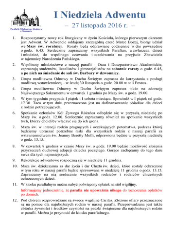 Ogłoszenia parafialne na niedzielę 27 listopada 2016 r.