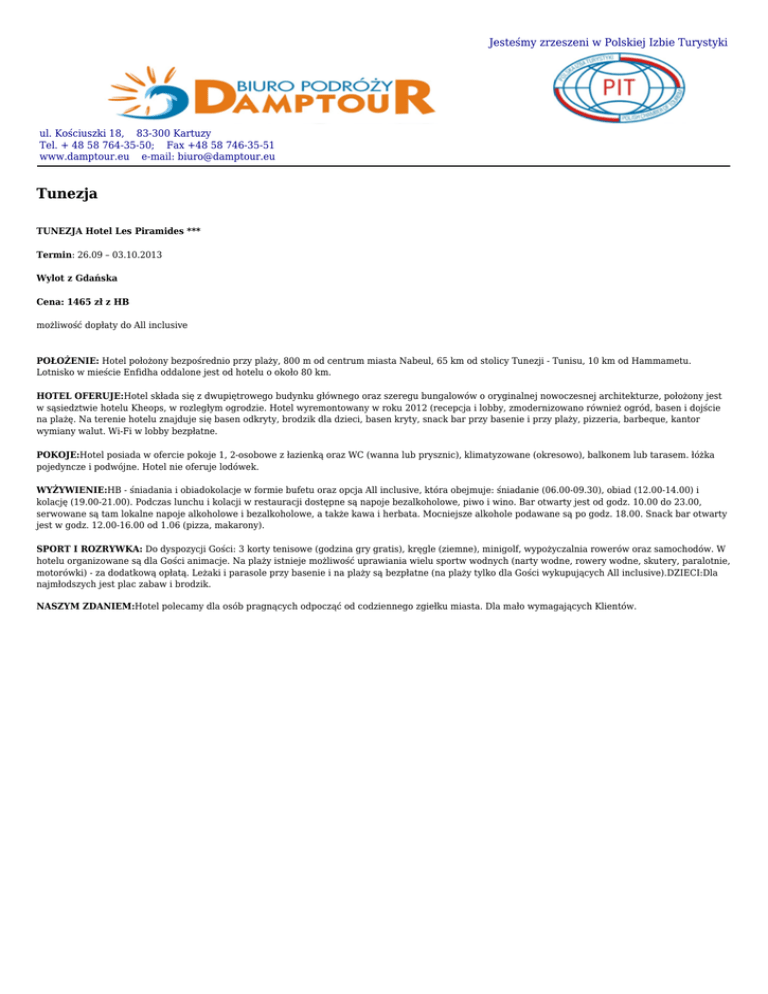 Jesteśmy zrzeszeni w Polskiej Izbie Turystyki ul. Kościuszki 18, 83-300 Kartuzy Tel. + 48 58 764-35-50; Fax +48 58 746-35-51 www.damptour.eu e-mail: [email protected] Tunezja TUNEZJA Hotel Les Piramides *** Termin: 26.09 – 03.10.2013 Wylot z Gdańska Cena: 1465 zł z HB możliwość dopłaty do All inclusive POŁOŻENIE: Hotel położony bezpośrednio przy plaży, 800 m od centrum miasta Nabeul, 65 km od stolicy Tunezji - Tunisu, 10 km od Hammametu. Lotnisko w mieście Enfidha oddalone jest od hotelu o około 80 km. HOTEL OFERUJE:Hotel składa się z dwupiętrowego budynku głównego oraz szeregu bungalowów o oryginalnej nowoczesnej architekturze, położony jest w sąsiedztwie hotelu Kheops, w rozległym ogrodzie. Hotel wyremontowany w roku 2012 (recepcja i lobby, zmodernizowano również ogród, basen i dojście na plażę. Na terenie hotelu znajduje się basen odkryty, brodzik dla dzieci, basen kryty, snack bar przy basenie i przy plaży, pizzeria, barbeque, kantor wymiany walut. Wi-Fi w lobby bezpłatne. POKOJE:Hotel posiada w ofercie pokoje 1, 2-osobowe z łazienką oraz WC (wanna lub prysznic), klimatyzowane (okresowo), balkonem lub tarasem. łóżka pojedyncze i podwójne. Hotel nie oferuje lodówek. WYŻYWIENIE:HB - śniadania i obiadokolacje w formie bufetu oraz opcja All inclusive, która obejmuje: śniadanie (06.00-09.30), obiad (12.00-14.00) i kolację (19.00-21.00). Podczas lunchu i kolacji w restauracji dostępne są napoje bezalkoholowe, piwo i wino. Bar otwarty jest od godz. 10.00 do 23.00, serwowane są tam lokalne napoje alkoholowe i bezalkoholowe, a także kawa i herbata. Mocniejsze alkohole podawane są po godz. 18.00. Snack bar otwarty jest w godz. 12.00-16.00 od 1.06 (pizza, makarony). SPORT I ROZRYWKA: Do dyspozycji Gości: 3 korty tenisowe (godzina gry gratis), kręgle (ziemne), minigolf, wypożyczalnia rowerów oraz samochodów. W hotelu organizowane są dla Gości animacje. Na plaży istnieje możliwość uprawiania wielu sportw wodnych (narty wodne, rowery wodne, skutery, paralotnie, motorówki) - za dodatkową opłatą. Leżaki i parasole przy basenie i na plaży są bezpłatne (na plaży tylko dla Gości wykupujących All inclusive).DZIECI:Dla najmłodszych jest plac zabaw i brodzik. NASZYM ZDANIEM:Hotel polecamy dla osób pragnących odpocząć od codziennego zgiełku miasta. Dla mało wymagających Klientów.