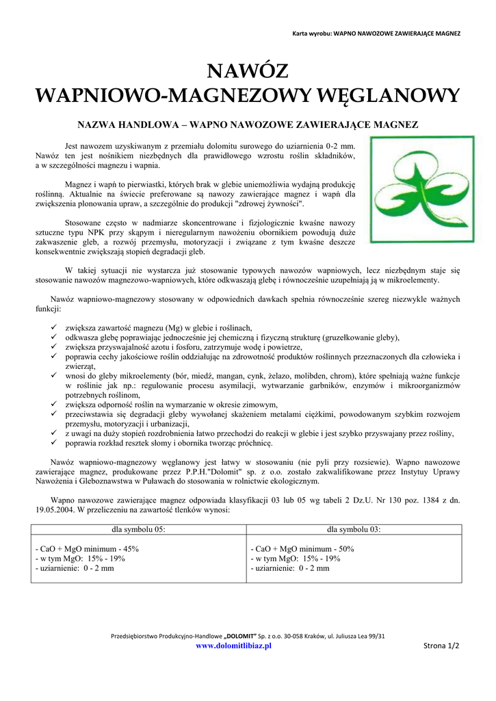 Karta wyrobu: WAPNO NAWOZOWE ZAWIERAJĄCE MAGNEZ NAWÓZ WAPNIOWO-MAGNEZOWY WĘGLANOWY NAZWA HANDLOWA – WAPNO NAWOZOWE ZAWIERAJĄCE MAGNEZ Jest nawozem uzyskiwanym z przemiału dolomitu surowego do uziarnienia 0-2 mm. Nawóz ten jest nośnikiem niezbędnych dla prawidłowego wzrostu roślin składników, a w szczególności magnezu i wapnia. Magnez i wapń to pierwiastki, których brak w glebie uniemożliwia wydajną produkcję roślinną. Aktualnie na świecie preferowane są nawozy zawierające magnez i wapń dla zwiększenia plonowania upraw, a szczególnie do produkcji "zdrowej żywności". Stosowane często w nadmiarze skoncentrowane i fizjologicznie kwaśne nawozy sztuczne typu NPK przy skąpym i nieregularnym nawożeniu obornikiem powodują duże zakwaszenie gleb, a rozwój przemysłu, motoryzacji i związane z tym kwaśne deszcze konsekwentnie zwiększają stopień degradacji gleb. W takiej sytuacji nie wystarcza już stosowanie typowych nawozów wapniowych, lecz niezbędnym staje się stosowanie nawozów magnezowo-wapniowych, które odkwaszają glebę i równocześnie uzupełniają ją w mikroelementy. Nawóz wapniowo-magnezowy stosowany w odpowiednich dawkach spełnia równocześnie szereg niezwykle ważnych funkcji: zwiększa zawartość magnezu (Mg) w glebie i roślinach, odkwasza glebę poprawiając jednocześnie jej chemiczną i fizyczną strukturę (gruzełkowanie gleby), zwiększa przyswajalność azotu i fosforu, zatrzymuje wodę i powietrze, poprawia cechy jakościowe roślin oddziałując na zdrowotność produktów roślinnych przeznaczonych dla człowieka i zwierząt, wnosi do gleby mikroelementy (bór, miedź, mangan, cynk, żelazo, molibden, chrom), które spełniają ważne funkcje w roślinie jak np.: regulowanie procesu asymilacji, wytwarzanie garbników, enzymów i mikroorganizmów potrzebnych roślinom, zwiększa odporność roślin na wymarzanie w okresie zimowym, przeciwstawia się degradacji gleby wywołanej skażeniem metalami ciężkimi, powodowanym szybkim rozwojem przemysłu, motoryzacji i urbanizacji, z uwagi na duży stopień rozdrobnienia łatwo przechodzi do reakcji w glebie i jest szybko przyswajany przez rośliny, poprawia rozkład resztek słomy i obornika tworząc próchnicę. Nawóz wapniowo-magnezowy węglanowy jest łatwy w stosowaniu (nie pyli przy rozsiewie). Wapno nawozowe zawierające magnez, produkowane przez P.P.H."Dolomit" sp. z o.o. zostało zakwalifikowane przez Instytuy Uprawy Nawożenia i Gleboznawstwa w Puławach do stosowania w rolnictwie ekologicznym. Wapno nawozowe zawierające magnez odpowiada klasyfikacji 03 lub 05 wg tabeli 2 Dz.U. Nr 130 poz. 1384 z dn. 19.05.2004. W przeliczeniu na zawartość tlenków wynosi: dla symbolu 05: - CaO + MgO minimum - 45% - w tym MgO: 15% - 19% - uziarnienie: 0 - 2 mm dla symbolu 03: - CaO + MgO minimum - 50% - w tym MgO: 15% - 19% - uziarnienie: 0 - 2 mm Przedsiębiorstwo Produkcyjno-Handlowe „DOLOMIT” Sp. z o.o. 30-058 Kraków, ul. Juliusza Lea 99/31 www.dolomitlibiaz.pl Strona 1/2 Karta wyrobu: WAPNO NAWOZOWE ZAWIERAJĄCE MAGNEZ Zastosowanie: Nawóz wapniowo-magnezowy stosować należy na wszystkich rodzajach gleb i pod wszystkie uprawy, w a szczególności na glebach lekkich i kwaśnych, oraz pod uprawy wymagające zwiększonej ilości magnezu. Najlepsze efekty uzyskuje się gdy nawóz rozsiewany na ściernisko i jest przyorany. Można stosować także przed siewem i sadzeniem roślin. Nawóz powinien być wymieszany z glebą na głębokość co najmniej 20 cm. Dla utrzymania właściwego odczynu gleby stosowanie nawozu należy powtarzać w okresach 2-5 letnich. Nawóz wapniowo-magnezowy powinien być stosowany w dawkach zależnych od odczynu pH i rodzaju gleby. Zalecane ilości: - gleby lekkie - gleby średnie - gleby ciężkie - 2-3 tony/ha 3-4 tony/ha 4-5 ton/ha Dawki zalecane mogą nie w pełni regulować odczyn gleby na których wapnowanie jest konieczne, dlatego w razie utrzymania się kwaśnego odczynu gleby należy po kilku miesiącach powtórzyć nawożenie. Stosowanie nawozu daje wysokie zwyżki plonów zbóż, roślin okopowych i warzyw. Terminy stosowania: - termin optymalny - termin dopuszczalny - lato, jesień przed orką - zima na zamarzniętą glebę, wiosna pod uprawy przedsiewne Sposób wysiewania: - rozrzutnikiem do nawozów lub ręcznie Przechowywanie: - na polach krótkoterminowo - przed wysiewem (w pryzmach) - w składowiskach zadaszonych Dłuższe przechowywanie nie wpływa na obniżenie właściwości nawozu. Nawóz nie powoduje ograniczenia rodzajów upraw po jego wysiewie co np. ma miejsce przy stosowaniu nawozów tlenkowych prażonych. DOPUSZCZENIE DO OBROTU DYSTRYBUCJA Ministerstwo Rolnictwa i Gospodarki Żywnościowej Departament Produkcji Roślinnej Nr PR.ne-4071-2(V93 z dnia 1993-05-04 oraz Nr PR.ne-407 1-39/94 z dnia 1994-03-18. Nawozy wysyłane są transportem samochodowym na koszt producenta pod wskazany adres lub odbierane mogą być własnymi środkami transportu po uprzednim uzgodnieniu. Producent: Przedsiębiorstwo Produkcyjno-Handlowe „DOLOMIT” Sp. z o.o. 30-058 Kraków, ul. Juliusza Lea 99/31 Kopalnia Dolomitu „LIBIĄŻ” 32-590 Libiąż, ul. Kamienna 9 tel.: tel.: 32 627 72 81, tel./fax: 32 627 72 73 Przedsiębiorstwo Produkcyjno-Handlowe „DOLOMIT” Sp. z o.o. 30-058 Kraków, ul. Juliusza Lea 99/31 www.dolomitlibiaz.pl Strona 2/2