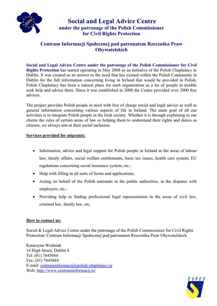 Social and Legal Advice Centre under the patronage of the Polish Commissioner for Civil Rights Protection Centrum Informacji Społecznej pod patronatem Rzecznika Praw Obywatelskich Social and Legal Advice Centre under the patronage of the Polish Commissioner for Civil Rights Protection has started operating in May 2008 as an initiative of the Polish Chaplaincy in Dublin. It was created as an answer to the need that has existed within the Polish Community in Dublin for the full information concerning living in Ireland that would be provided in Polish. Polish Chaplaincy has been a natural place for such organization as a lot of people in trouble seek help and advice there. Since it was established in 2008 the Centre provided over 2000 free advices. The project provides Polish people in need with free of charge social and legal advice as well as general information concerning various aspects of life in Ireland. The main goal of all our activities is to integrate Polish people in the Irish society. Whether it is through explaining to our clients the rules of certain areas of law or helping them to understand their rights and duties as citizens, we always aim at their social inclusion. Services provided for migrants: • Information, advice and legal support for Polish people in Ireland in the areas of labour law, family affairs, social welfare entitlements, basic tax issues, health care system, EU regulations concerning social insurance system, etc.; • Help with filling in all sorts of forms and applications; • Acting on behalf of the Polish nationals in the public authorities, in the disputes with employers, etc.; • Providing help in finding professional legal representation in the areas of civil law, criminal law, family law, etc. How to contact us: Social & Legal Advice Centre under the patronage of the Polish Commissioner for Civil Rights Protection/ Centrum Informacji Społecznej pod patronatem Rzecznika Praw Obywatelskich Katarzyna Wodniak 14 High Street, Dublin 8 Tel: (01) 7645684 Fax: (01) 7645684 E-mail: [email protected] Web: http://www.centruminformacji.ie/