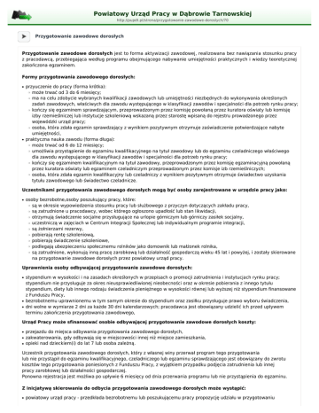 Powiatowy Urząd Pracy w Dąbrowie Tarnowskiej http://pupdt.pl/strona/przygotowanie-zawodowe-doroslych/70 Przygotowanie zawodowe dorosłych Przygotowanie zawodowe dorosłych jest to forma aktywizacji zawodowej, realizowana bez nawiązania stosunku pracy z pracodawcą, przebiegająca według programu obejmującego nabywanie umiejętności praktycznych i wiedzy teoretycznej zakończona egzaminem. Formy przygotowania zawodowego dorosłych: ● przyuczenie do pracy (forma krótka): może trwać od 3 do 6 miesięcy; ma na celu zdobycie wybranych kwalifikacji zawodowych lub umiejętności niezbędnych do wykonywania określonych zadań zawodowych, właściwych dla zawodu występującego w klasyfikacji zawodów i specjalności dla potrzeb rynku pracy; kończy się egzaminem sprawdzającym, przeprowadzonym przez komisję powołaną przez kuratora oświaty lub komisję izby rzemieślniczej lub instytucje szkoleniową wskazaną przez starostę wpisaną do rejestru prowadzonego przez wojewódzki urząd pracy; osoba, która zdała egzamin sprawdzający z wynikiem pozytywnym otrzymuje zaświadczenie potwierdzające nabyte umiejętności, praktyczna nauka zawodu (forma długa): może trwać od 6 do 12 miesięcy; umożliwia przystąpienie do egzaminu kwalifikacyjnego na tytuł zawodowy lub do egzaminu czeladniczego właściwego dla zawodu występującego w klasyfikacji zawodów i specjalności dla potrzeb rynku pracy; kończy się egzaminem kwalifikacyjnym na tytuł zawodowy, przeprowadzonym przez komisję egzaminacyjną powołaną przez kuratora oświaty lub egzaminem czeladniczym przeprowadzonym przez komisje izb rzemieślniczych; osoba, która zdała egzamin kwalifikacyjny lub czeladniczy z wynikiem pozytywnym otrzymuje świadectwo uzyskania tytułu zawodowego lub świadectwo czeladnicze. ❍ ❍ ❍ ❍ ● ❍ ❍ ❍ ❍ Uczestnikami przygotowania zawodowego dorosłych mogą być osoby zarejestrowane w urzędzie pracy jako: ● osoby bezrobotne,osoby poszukujący pracy, które: są w okresie wypowiedzenia stosunku pracy lub służbowego z przyczyn dotyczących zakładu pracy, są zatrudnione u pracodawcy, wobec którego ogłoszono upadłość lub stan likwidacji, otrzymują świadczenie socjalne przysługujące na urlopie górniczym lub górniczy zasiłek socjalny, uczestniczą w zajęciach w Centrum Integracji Społecznej lub indywidualnym programie integracji, są żołnierzami rezerwy, pobierają rentę szkoleniową, pobierają świadczenie szkoleniowe, podlegają ubezpieczeniu społecznemu rolników jako domownik lub małżonek rolnika, są zatrudnione, wykonują inną pracę zarobkową lub działalność gospodarczą wieku 45 lat i powyżej, i zostały skierowane na przygotowanie zawodowe dorosłych przez powiatowy urząd pracy. ❍ ❍ ❍ ❍ ❍ ❍ ❍ ❍ ❍ Uprawnienia osoby odbywającej przygotowanie zawodowe dorosłych: ● ● ● stypendium w wysokości i na zasadach określonych w przepisach o promocji zatrudnienia i instytucjach rynku pracy; stypendium nie przysługuje za okres nieusprawiedliwionej nieobecności oraz w okresie pobierania z innego tytułu stypendium, diety lub innego rodzaju świadczenia pieniężnego w wysokości równej lub wyższej niż stypendium finansowane z Funduszu Pracy, bezrobotnemu uprawnionemu w tym samym okresie do stypendium oraz zasiłku przysługuje prawo wyboru świadczenia, dni wolne w wymiarze 2 dni za każde 30 dni kalendarzowych; pracodawca jest obowiązany udzielić ich przed upływem terminu zakończenia przygotowania zawodowego, Urząd Pracy może sfinansować osobie odbywającej przygotowanie zawodowe dorosłych koszty: ● ● ● przejazdu do miejsca odbywania przygotowania zawodowego dorosłych, zakwaterowania, gdy odbywają się w miejscowości innej niż miejsce zamieszkania, opieki nad dzieckiem(i) do lat 7 lub osoba zależną. Uczestnik przygotowania zawodowego dorosłych, który z własnej winy przerwał program tego przygotowania lub nie przystąpił do egzaminu kwalifikacyjnego, czeladniczego lub egzaminu sprawdzającego jest obowiązany do zwrotu kosztów tego przygotowania poniesionych z Funduszu Pracy, z wyjątkiem przypadku podjęcia zatrudnienia lub innej pracy zarobkowej lub działalności gospodarczej. Ponowna rejestracja jest możliwa po upływie 6 miesięcy od dnia przerwania programu lub nie przystąpienia do egzaminu. Z inicjatywą skierowania do odbycia przygotowania zawodowego dorosłych może wystąpić: ● powiatowy urząd pracy - przedkłada bezrobotnemu lub poszukującemu pracy propozycję udziału w przygotowaniu ● ● zawodowym dorosłych; pracodawca - może złożyć w powiatowym urzędzie pracy wniosek gotowości utworzenia miejsc przygotowania zawodowego dorosłych, we wniosku pracodawca może wskazać osobę, którą chciałby przyjąć; osoba zainteresowana - może złożyć w powiatowym urzędzie pracy wniosek o skierowanie do odbycia przygotowania zawodowego dorosłych; we wniosku kandydat powinien wskazać zadania, które chciałby wykonywać, kwalifikacje lub umiejętności, które chciałby uzyskać. Przygotowanie zawodowe dorosłych jest realizowane na podstawie umowy w sprawie realizacji przygotowania zawodowego dorosłych zawieranej pomiędzy urzędem pracy a pracodawcą lub pomiędzy urzędem pracy, pracodawcą i instytucją szkoleniową, wpisaną do rejestru prowadzonego przez wojewódzki urząd pracy. W programie przygotowania zawodowego dorosłych na naukę umiejętności praktycznych przeznacza sie co najmniej 80 % czasu, natomiast 20% czasu to nauka teorii, która może odbywać się u pracodawcy lub w instytucji szkoleniowej. Pracodawcy, z którym urząd pracy zawarł umowę w sprawie realizacji przygotowania zawodowego dorosłych przysługuje: ● ● refundacja wydatków poniesionych na uczestnika przygotowania zawodowego dorosłych, w szczególności na materiały i surowce, eksploatację maszyn i urządzeń, odzież roboczą, posiłki regeneracyjne i inne środki niezbędne do realiz