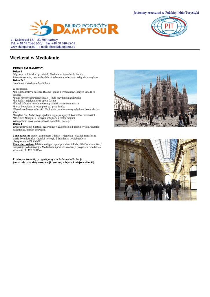 Jesteśmy zrzeszeni w Polskiej Izbie Turystyki ul. Kościuszki 18, 83-300 Kartuzy Tel. + 48 58 764-35-50; Fax +48 58 746-35-51 www.damptour.eu e-mail: [email protected] Weekend w Mediolanie PROGRAM RAMOWY: Dzień 1 Odprawa na lotnisku i przelot do Mediolanu, transfer do hotelu. Zakwaterowanie, czas wolny lub zwiedzanie w zależności od godzin przylotu. Dzień 2- 3 Śniadanie, zwiedzanie Mediolanu. W programie: *Plac Katedralny i Katedra Duomo - jedna z trzech największych katedr na świecie *Pałac Królewski (Palazzo Reale) - była rezydencja królewska *La Scala - najsłynniejsza opera świata *Zamek Sforzów - średniowieczny zamek w centrum miasta *Parco Sempione - uroczy park tuż przy Zamku *Narodowe Muzeum Nauki i Techniki - poświęcone wynalazkom Leonarda da Vinci *Bazylika Św. Ambrożego - jeden z najpiękniejszych kościołów romańskich *Dzielnica Navigli - z licznymi kafejkami i restauracjami Wieczorami - czas wolny, powrót do hotelu, nocleg. Dzień 4 Wykwaterowanie z hotelu, czas wolny w zależności od godzin wylotu, transfer na lotnisko, przelot do Polski. Cena zawiera: przelot samolotem Gdańsk – Mediolan - Gdańsk transfer na trasie hotel lotnisko – hotel,3 noclegi , 3 śniadania, , opiekę pilota, ubezpieczenie KL i NNW Cena nie zawiera: biletów wstępu i opłat przodownickich , biletów komunikacji miejskiej i podmiejskiej w Mediolanie i podczas realizacji programu zwiedzania w kwocie ok. 120 EUR/ os Prosimy o konatkt, przygotujemy dla Państwa kalkulacje (cena zależy od daty rezerwacji,terminu, miejsca i miejsca zbiórki)