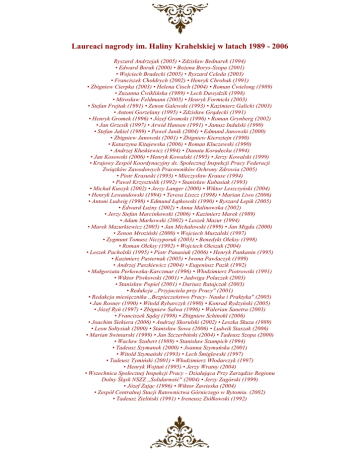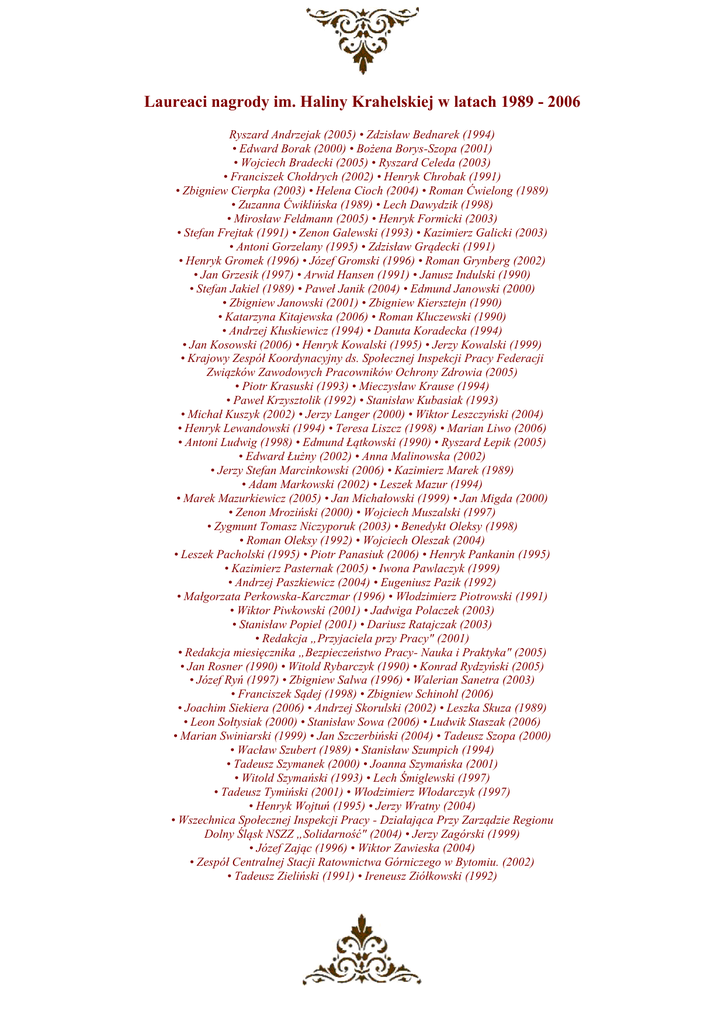 Laureaci nagrody im. Haliny Krahelskiej w latach 1989 - 2006 Ryszard Andrzejak (2005) • Zdzisław Bednarek (1994) • Edward Borak (2000) • Bożena Borys-Szopa (2001) • Wojciech Bradecki (2005) • Ryszard Celeda (2003) • Franciszek Chołdrych (2002) • Henryk Chrobak (1991) • Zbigniew Cierpka (2003) • Helena Cioch (2004) • Roman Ćwielong (1989) • Zuzanna Ćwiklińska (1989) • Lech Dawydzik (1998) • Mirosław Feldmann (2005) • Henryk Formicki (2003) • Stefan Frejtak (1991) • Zenon Galewski (1993) • Kazimierz Galicki (2003) • Antoni Gorzelany (1995) • Zdzisław Grądecki (1991) • Henryk Gromek (1996) • Józef Gromski (1996) • Roman Grynberg (2002) • Jan Grzesik (1997) • Arwid Hansen (1991) • Janusz Indulski (1990) • Stefan Jakiel (1989) • Paweł Janik (2004) • Edmund Janowski (2000) • Zbigniew Janowski (2001) • Zbigniew Kiersztejn (1990) • Katarzyna Kitajewska (2006) • Roman Kluczewski (1990) • Andrzej Kłuskiewicz (1994) • Danuta Koradecka (1994) • Jan Kosowski (2006) • Henryk Kowalski (1995) • Jerzy Kowalski (1999) • Krajowy Zespół Koordynacyjny ds. Społecznej Inspekcji Pracy Federacji Związków Zawodowych Pracowników Ochrony Zdrowia (2005) • Piotr Krasuski (1993) • Mieczysław Krause (1994) • Paweł Krzysztolik (1992) • Stanisław Kubasiak (1993) • Michał Kuszyk (2002) • Jerzy Langer (2000) • Wiktor Leszczyński (2004) • Henryk Lewandowski (1994) • Teresa Liszcz (1998) • Marian Liwo (2006) • Antoni Ludwig (1998) • Edmund Łątkowski (1990) • Ryszard Łepik (2005) • Edward Łużny (2002) • Anna Malinowska (2002) • Jerzy Stefan Marcinkowski (2006) • Kazimierz Marek (1989) • Adam Markowski (2002) • Leszek Mazur (1994) • Marek Mazurkiewicz (2005) • Jan Michałowski (1999) • Jan Migda (2000) • Zenon Mroziński (2000) • Wojciech Muszalski (1997) • Zygmunt Tomasz Niczyporuk (2003) • Benedykt Oleksy (1998) • Roman Oleksy (1992) • Wojciech Oleszak (2004) • Leszek Pacholski (1995) • Piotr Panasiuk (2006) • Henryk Pankanin (1995) • Kazimierz Pasternak (2005) • Iwona Pawlaczyk (1999) • Andrzej Paszkiewicz (2004) • Eugeniusz Pazik (1992) • Małgorzata Perkowska-Karczmar (1996) • Włodzimierz Piotrowski (1991) • Wiktor Piwkowski (2001) • Jadwiga Polaczek (2003) • Stanisław Popiel (2001) • Dariusz Ratajczak (2003) • Redakcja „Przyjaciela przy Pracy" (2001) • Redakcja miesięcznika „Bezpieczeństwo Pracy- Nauka i Praktyka" (2005) • Jan Rosner (1990) • Witold Rybarczyk (1990) • Konrad Rydzyński (2005) • Józef Ryń (1997) • Zbigniew Salwa (1996) • Walerian Sanetra (2003) • Franciszek Sądej (1998) • Zbigniew Schinohl (2006) • Joachim Siekiera (2006) • Andrzej Skorulski (2002) • Leszka Skuza (1989) • Leon Sołtysiak (2000) • Stanisław Sowa (2006) • Ludwik Staszak (2006) • Marian Swiniarski (1999) • Jan Szczerbiński (2004) • Tadeusz Szopa (2000) • Wacław Szubert (1989) • Stanisław Szumpich (1994) • Tadeusz Szymanek (2000) • Joanna Szymańska (2001) • Witold Szymański (1993) • Lech Śmiglewski (1997) • Tadeusz Tymiński (2001) • Włodzimierz Włodarczyk (1997) • Henryk Wojtuń (1995) • Jerzy Wratny (2004) • Wszechnica Społecznej Inspekcji Pracy - Działająca Przy Zarządzie Regionu Dolny Śląsk NSZZ „Solidarność" (2004) • Jerzy Zagórski (1999) • Józef Zając (1996) • Wiktor Zawieska (2004) • Zespół Centralnej Stacji Ratownictwa Górniczego w Bytomiu. (2002) • Tadeusz Zieliński (1991) • Ireneusz Ziółkowski (1992)