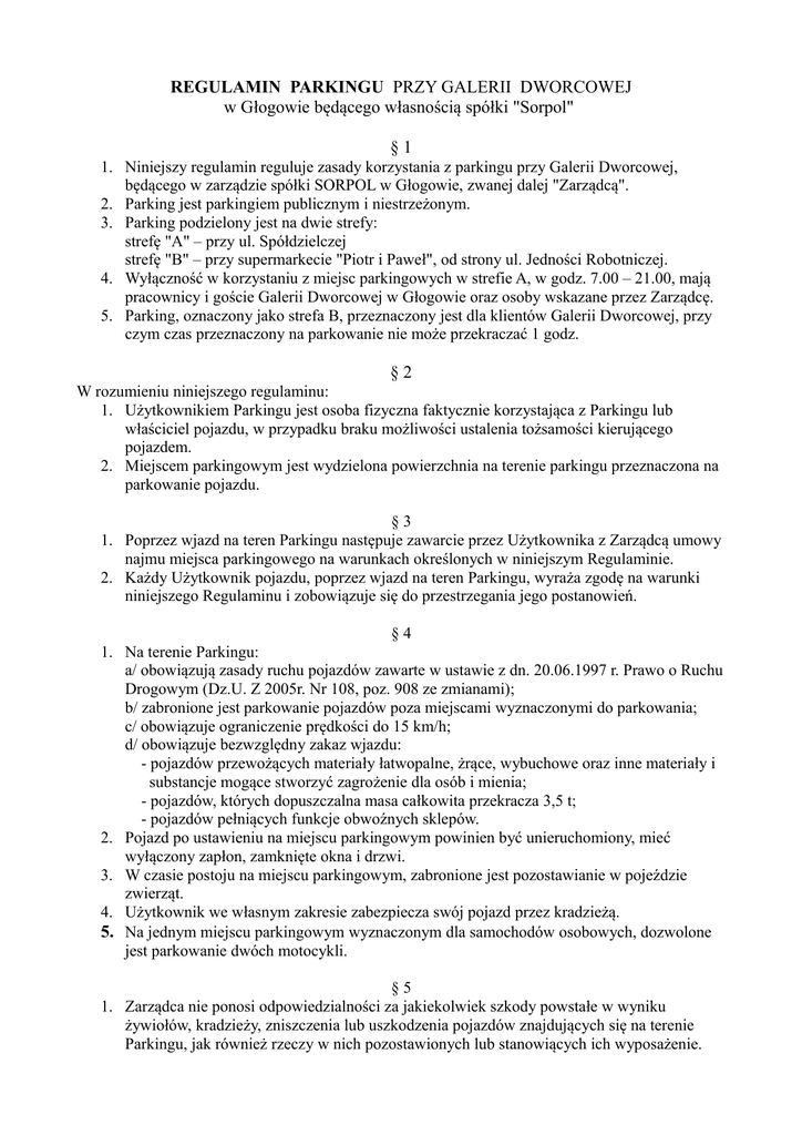 REGULAMIN PARKINGU PRZY GALERII DWORCOWEJ w Głogowie będącego własnością spółki "Sorpol" §1 1. Niniejszy regulamin reguluje zasady korzystania z parkingu przy Galerii Dworcowej, będącego w zarządzie spółki SORPOL w Głogowie, zwanej dalej "Zarządcą". 2. Parking jest parkingiem publicznym i niestrzeżonym. 3. Parking podzielony jest na dwie strefy: strefę "A" – przy ul. Spółdzielczej strefę "B" – przy supermarkecie "Piotr i Paweł", od strony ul. Jedności Robotniczej. 4. Wyłączność w korzystaniu z miejsc parkingowych w strefie A, w godz. 7.00 – 21.00, mają pracownicy i goście Galerii Dworcowej w Głogowie oraz osoby wskazane przez Zarządcę. 5. Parking, oznaczony jako strefa B, przeznaczony jest dla klientów Galerii Dworcowej, przy czym czas przeznaczony na parkowanie nie może przekraczać 1 godz. §2 W rozumieniu niniejszego regulaminu: 1. Użytkownikiem Parkingu jest osoba fizyczna faktycznie korzystająca z Parkingu lub właściciel pojazdu, w przypadku braku możliwości ustalenia tożsamości kierującego pojazdem. 2. Miejscem parkingowym jest wydzielona powierzchnia na terenie parkingu przeznaczona na parkowanie pojazdu. §3 1. Poprzez wjazd na teren Parkingu następuje zawarcie przez Użytkownika z Zarządcą umowy najmu miejsca parkingowego na warunkach określonych w niniejszym Regulaminie. 2. Każdy Użytkownik pojazdu, poprzez wjazd na teren Parkingu, wyraża zgodę na warunki niniejszego Regulaminu i zobowiązuje się do przestrzegania jego postanowień. §4 1. Na terenie Parkingu: a/ obowiązują zasady ruchu pojazdów zawarte w ustawie z dn. 20.06.1997 r. Prawo o Ruchu Drogowym (Dz.U. Z 2005r. Nr 108, poz. 908 ze zmianami); b/ zabronione jest parkowanie pojazdów poza miejscami wyznaczonymi do parkowania; c/ obowiązuje ograniczenie prędkości do 15 km/h; d/ obowiązuje bezwzględny zakaz wjazdu: - pojazdów przewożących materiały łatwopalne, żrące, wybuchowe oraz inne materiały i substancje mogące stworzyć zagrożenie dla osób i mienia; - pojazdów, których dopuszczalna masa całkowita przekracza 3,5 t; - pojazdów pełniących funkcje obwoźnych sklepów. 2. Pojazd po ustawieniu na miejscu parkingowym powinien być unieruchomiony, mieć wyłączony zapłon, zamknięte okna i drzwi. 3. W czasie postoju na miejscu parkingowym, zabronione jest pozostawianie w pojeździe zwierząt. 4. Użytkownik we własnym zakresie zabezpiecza swój pojazd przez kradzieżą. 5. Na jednym miejscu parkingowym wyznaczonym dla samochodów osobowych, dozwolone jest parkowanie dwóch motocykli. §5 1. Zarządca nie ponosi odpowiedzialności za jakiekolwiek szkody powstałe w wyniku żywiołów, kradzieży, zniszczenia lub uszkodzenia pojazdów znajdujących się na terenie Parkingu, jak również rzeczy w nich pozostawionych lub stanowiących ich wyposażenie. 2. Wyłącza się odpowiedzialność Zarządcy z tytułu szkód komunikacyjnych i parkingowych dotyczących pojazdów i osób korzystających z Parkingu. §6 1. W przypadku naruszenia przez Użytkownika postanowień niniejszego Regulaminu, Zarządca może zastosować środki niezbędne dla przywrócenia stanu zgodnego z Regulaminem, jak również usunąć pojazd z Parkingu lub zastosować blokadę mechaniczną pojazdu. 2. W przypadkach określonych w ust.1, Użytkownik zobowiązany jest do pokrycia kosztów związanych z usunięciem pojazdu z Parkingu oraz jego zabezpieczeniem i przechowywaniem do czasu odbioru pojazdu. 3. Użytkownik ponosi odpowiedzialność za wszelkie szkody spowodowane przez pojazd lub powstałe w związku z korzystaniem z miejsca parkingowego, w szczególności z tytułu zanieczyszczenia powierzchni parkingu na skutek wycieku płynów z pojazdu (wyciek oleju, płynu hamulcowego, itp.). §7 Zakazane jest parkowanie pojazdów samochodowych na miejscach parkingowych przeznaczonych dla osób niepełnosprawnych innym osobom niż użytkownikom pojazdów posiadających ważną kartę parkingową, októrej mowa w art. 8 Ustawy "Prawo o ruchu drogowym", umieszczonym każdorazowo w widocznym miejscu za przednią szybą pojazdu. § 8 1. Kontrola spełnienia warunków umowy najmu miejsca parkingowego przeprowadzana jest na terenie całego parkingu przez osoby upowaznione przez Zarządcę. 2. Użytkownicy mają obowiązek stosowania się do poleceń wydawanych przez osoby, o których mowa w ust.1. §9 Na terenie Parkingu zabronione jest: 1. palenie tytoniu i spożywanie alkoholu; 2. zaśmiecanie; 3. naprawa i mycie pojazdów; 4. tankowanie pojazdów; 5. wymiana lub uzupełnianie płynów w pojazdach – cieczy chłodzącej, oleju, itp. 6. używanie otwartego ognia; 7. działanie niezgodne z przepisami bhp i p.poż.; 8. zachowanie sprzeczne z zasadami współżycia społecznego lub zakłócające korzystanie z Parkingu. § 10 1. Wszelkie skargi i wnioski związane z korzystaniem z Parkingu należy przesyłać na adres "Sorpol", ul. Jedności Robotniczej 2, 67-200 Głogów. 2. Ewentualne spory między Użytkownikiem a Zarządcą rozstrzygał będzie miejscowo właściwy sąd powszechny.
