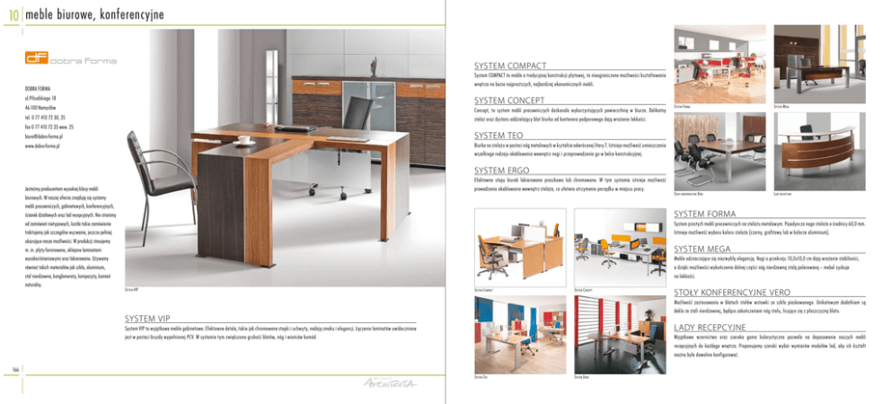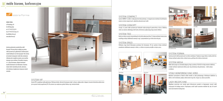 10 meble biurowe, konferencyjne System COMPACT System COMPACT to meble o tradycyjnej konstrukcji płytowej, to nieograniczone możliwości kształtowania wnętrza na bazie najprostszych, najbardziej ekonomicznych mebli. Dobra Forma ul.Piłsudskiego 18 System CONCEPT 46-100 Namysłów Concept, to system mebli pracowniczych doskonale wykorzystujących powierzchnię w biurze. Delikatny stelaż oraz dystans oddzielający blat biurka od kontenera podporowego dają wrażenie lekkości. tel. 0 77 410 72 30, 35 fax 0 77 410 72 35 wew. 25 [email protected] System TEO www.dobra-forma.pl Biurka na stelażu w postaci nóg metalowych w kształcie odwróconej litery T. Istnieje możliwość umieszczania wszelkiego rodzaju okablowania wewnątrz nogi i przeprowadzenia go w belce konstrukcyjnej. System Forma System Mega Stoły konferencyjne Vero L ady recepcyjne System ERGO Jesteśmy producentem wysokiej klasy mebli biurowych. W naszej ofercie znajdują się systemy mebli pracowniczych, gabinetowych, konferencyjnych, ścianek działowych oraz lad recepcyjnych. Nie stronimy od zamówień nietypowych, każde takie zamówienie traktujemy jak szczególne wyzwanie, jeszcze pełniej ukazujące nasze możliwości. W produkcji stosujemy m. in. płyty fornirowane, oklejone laminatami wysokociśnieniowymi oraz lakierowane. Używamy również takich materiałów jak szkło, aluminium, stal nierdzewna, konglomeraty, kompozyty, kamień naturalny. Efektowne stopy biurek lakierowane proszkowo lub chromowane. W tym systemie istnieje możliwość prowadzenia okablowania wewnątrz stelaża, co ułatwia utrzymanie porządku w miejscu pracy. System FORMA System prostych mebli pracowniczych na stelażu metalowym. Pojedyncza noga stelaża o średnicy 60,0 mm. Istnieje możliwość wyboru koloru stelaża (czarny, grafitowy lub w kolorze aluminium). System MEGA Meble odznaczające się niezwykłą elegancją. Nogi o przekroju 10,0x10,0 cm dają wrażenie stabilności, a dzięki możliwości wykończenia dolnej części nóg nierdzewną stalą polerowaną – mebel zyskuje na lekkości. System VIP System Compact System Concept Stoły konferencyjnE VERO Możliwość zastosowania w blatach stołów wstawki ze szkła piaskowanego. Unikatowym dodatkiem są dekle ze stali nierdzewnej, będące zakończeniem nóg stołu, licujące się z płaszczyzną blatu. System VIP Lady recepcyjne System VIP to wyjątkowe meble gabinetowe. Efektowne detale, takie jak chromowane stopki i uchwyty, nadają smaku i elegancji. Łączenie laminatów uwidocznione jest w postaci bruzdy wypełnionej PCV. W systemie tym zwiększono grubość blatów, nóg i wieńców komód. Wyjątkowe wzornictwo oraz szeroka gama kolorystyczna pozwala na dopasowanie naszych mebli recepcyjnych do każdego wnętrza. Proponujemy szeroki wybór wymiarów modułów lad, aby ich kształt można było dowolnie konfigurować. 166 System Teo System Ergo