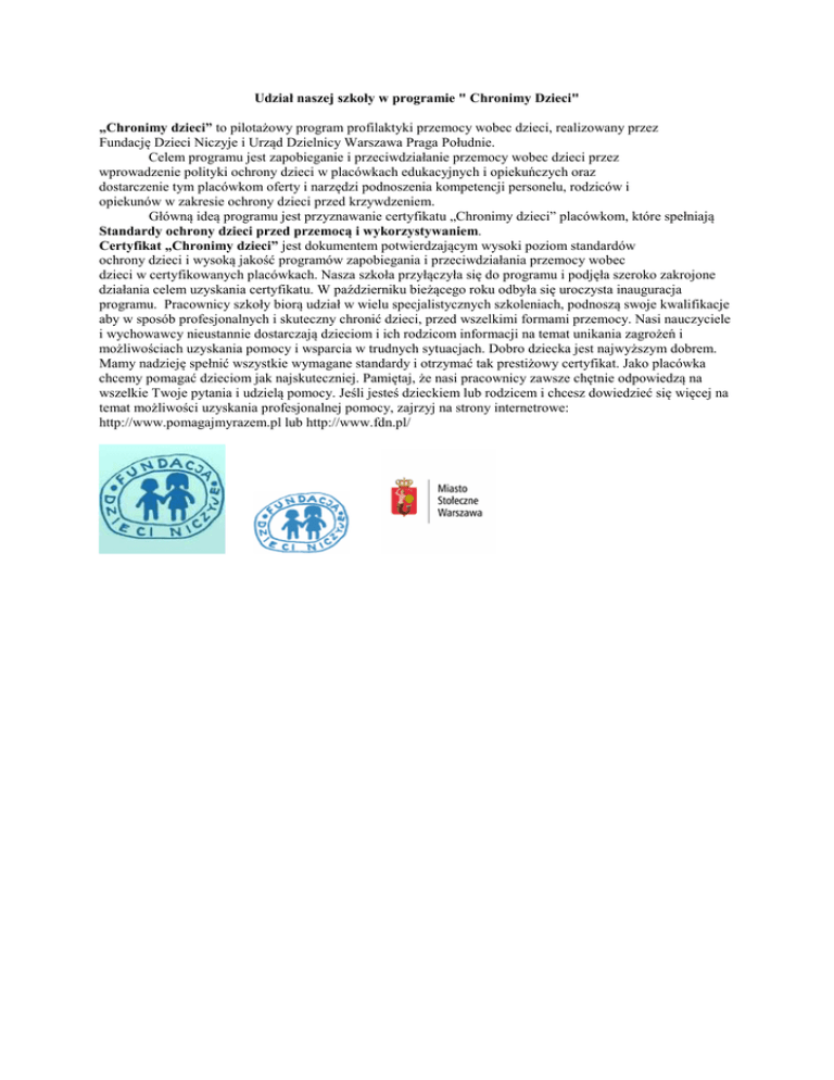 Udział naszej szkoły w programie " Chronimy Dzieci" „Chronimy dzieci” to pilotażowy program profilaktyki przemocy wobec dzieci, realizowany przez Fundację Dzieci Niczyje i Urząd Dzielnicy Warszawa Praga Południe. Celem programu jest zapobieganie i przeciwdziałanie przemocy wobec dzieci przez wprowadzenie polityki ochrony dzieci w placówkach edukacyjnych i opiekuńczych oraz dostarczenie tym placówkom oferty i narzędzi podnoszenia kompetencji personelu, rodziców i opiekunów w zakresie ochrony dzieci przed krzywdzeniem. Główną ideą programu jest przyznawanie certyfikatu „Chronimy dzieci” placówkom, które spełniają Standardy ochrony dzieci przed przemocą i wykorzystywaniem. Certyfikat „Chronimy dzieci” jest dokumentem potwierdzającym wysoki poziom standardów ochrony dzieci i wysoką jakość programów zapobiegania i przeciwdziałania przemocy wobec dzieci w certyfikowanych placówkach. Nasza szkoła przyłączyła się do programu i podjęła szeroko zakrojone działania celem uzyskania certyfikatu. W październiku bieżącego roku odbyła się uroczysta inauguracja programu. Pracownicy szkoły biorą udział w wielu specjalistycznych szkoleniach, podnoszą swoje kwalifikacje aby w sposób profesjonalnych i skuteczny chronić dzieci, przed wszelkimi formami przemocy. Nasi nauczyciele i wychowawcy nieustannie dostarczają dzieciom i ich rodzicom informacji na temat unikania zagrożeń i możliwościach uzyskania pomocy i wsparcia w trudnych sytuacjach. Dobro dziecka jest najwyższym dobrem. Mamy nadzieję spełnić wszystkie wymagane standardy i otrzymać tak prestiżowy certyfikat. Jako placówka chcemy pomagać dzieciom jak najskuteczniej. Pamiętaj, że nasi pracownicy zawsze chętnie odpowiedzą na wszelkie Twoje pytania i udzielą pomocy. Jeśli jesteś dzieckiem lub rodzicem i chcesz dowiedzieć się więcej na temat możliwości uzyskania profesjonalnej pomocy, zajrzyj na strony internetrowe: http://www.pomagajmyrazem.pl lub http://www.fdn.pl/