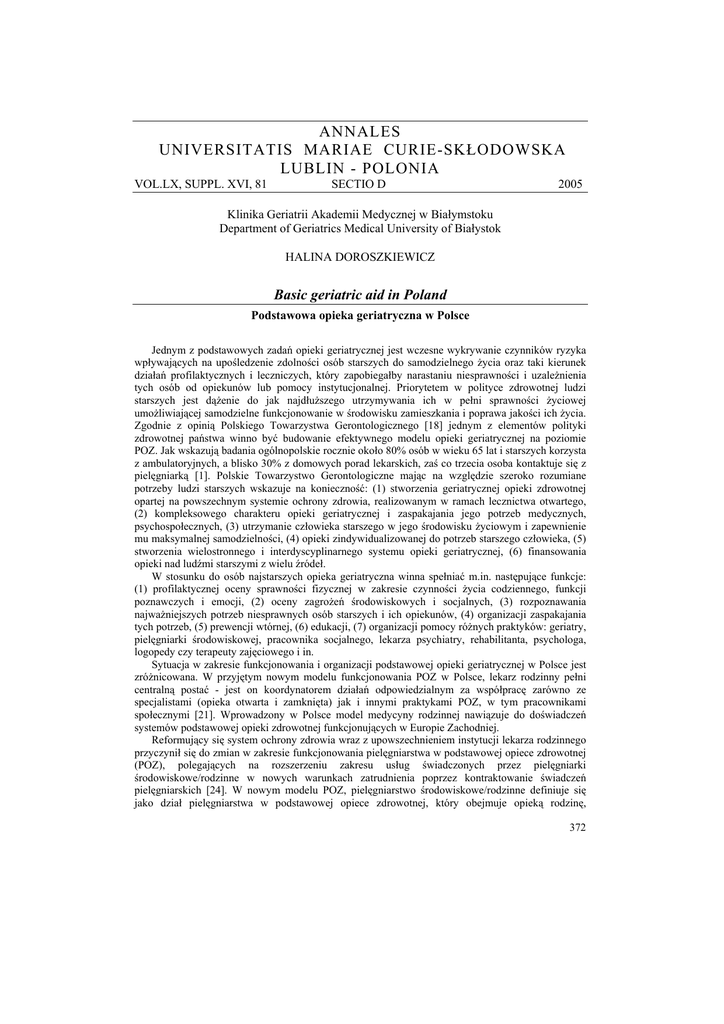 ANNALES UNIVERSITATIS MARIAE CURIE-SKŁODOWSKA LUBLIN - POLONIA VOL.LX, SUPPL. XVI, 81 SECTIO D 2005 Klinika Geriatrii Akademii Medycznej w Białymstoku Department of Geriatrics Medical University of Białystok HALINA DOROSZKIEWICZ Basic geriatric aid in Poland Podstawowa opieka geriatryczna w Polsce Jednym z podstawowych zadań opieki geriatrycznej jest wczesne wykrywanie czynników ryzyka wpływających na upośledzenie zdolności osób starszych do samodzielnego życia oraz taki kierunek działań profilaktycznych i leczniczych, który zapobiegałby narastaniu niesprawności i uzależnienia tych osób od opiekunów lub pomocy instytucjonalnej. Priorytetem w polityce zdrowotnej ludzi starszych jest dążenie do jak najdłuższego utrzymywania ich w pełni sprawności życiowej umożliwiającej samodzielne funkcjonowanie w środowisku zamieszkania i poprawa jakości ich życia. Zgodnie z opinią Polskiego Towarzystwa Gerontologicznego [18] jednym z elementów polityki zdrowotnej państwa winno być budowanie efektywnego modelu opieki geriatrycznej na poziomie POZ. Jak wskazują badania ogólnopolskie rocznie około 80% osób w wieku 65 lat i starszych korzysta z ambulatoryjnych, a blisko 30% z domowych porad lekarskich, zaś co trzecia osoba kontaktuje się z pielęgniarką [1]. Polskie Towarzystwo Gerontologiczne mając na względzie szeroko rozumiane potrzeby ludzi starszych wskazuje na konieczność: (1) stworzenia geriatrycznej opieki zdrowotnej opartej na powszechnym systemie ochrony zdrowia, realizowanym w ramach lecznictwa otwartego, (2) kompleksowego charakteru opieki geriatrycznej i zaspakajania jego potrzeb medycznych, psychospołecznych, (3) utrzymanie człowieka starszego w jego środowisku życiowym i zapewnienie mu maksymalnej samodzielności, (4) opieki zindywidualizowanej do potrzeb starszego człowieka, (5) stworzenia wielostronnego i interdyscyplinarnego systemu opieki geriatrycznej, (6) finansowania opieki nad ludźmi starszymi z wielu źródeł. W stosunku do osób najstarszych opieka geriatryczna winna spełniać m.in. następujące funkcje: (1) profilaktycznej oceny sprawności fizycznej w zakresie czynności życia codziennego, funkcji poznawczych i emocji, (2) oceny zagrożeń środowiskowych i socjalnych, (3) rozpoznawania najważniejszych potrzeb niesprawnych osób starszych i ich opiekunów, (4) organizacji zaspakajania tych potrzeb, (5) prewencji wtórnej, (6) edukacji, (7) organizacji pomocy różnych praktyków: geriatry, pielęgniarki środowiskowej, pracownika socjalnego, lekarza psychiatry, rehabilitanta, psychologa, logopedy czy terapeuty zajęciowego i in. Sytuacja w zakresie funkcjonowania i organizacji podstawowej opieki geriatrycznej w Polsce jest zróżnicowana. W przyjętym nowym modelu funkcjonowania POZ w Polsce, lekarz rodzinny pełni centralną postać - jest on koordynatorem działań odpowiedzialnym za współpracę zarówno ze specjalistami (opieka otwarta i zamknięta) jak i innymi praktykami POZ, w tym pracownikami społecznymi [21]. Wprowadzony w Polsce model medycyny rodzinnej nawiązuje do doświadczeń systemów podstawowej opieki zdrowotnej funkcjonujących w Europie Zachodniej. Reformujący się system ochrony zdrowia wraz z upowszechnieniem instytucji lekarza rodzinnego przyczynił się do zmian w zakresie funkcjonowania pielęgniarstwa w podstawowej opiece zdrowotnej (POZ), polegających na rozszerzeniu zakresu usług świadczonych przez pielęgniarki środowiskowe/rodzinne w nowych warunkach zatrudnienia poprzez kontraktowanie świadczeń pielęgniarskich [24]. W nowym modelu POZ, pielęgniarstwo środowiskowe/rodzinne definiuje się jako dział pielęgniarstwa w podstawowej opiece zdrowotnej, który obejmuje opieką rodzinę, 372 poszczególnych jej członków oraz osoby samotne w środowisku ich życia i zamieszkania. Pielęgniarka środowiskowa/rodzinna to pielęgniarka pracująca w podstawowej opiece zdrowotnej, wypełniająca funkcje pielęgniarskie wobec rodziny i jej członków, społeczności lokalnej, w środowisku ich zamieszkania, w sytuacji zdrowia, choroby i niepełnosprawności. Kryterium oceny jej pracy jest uzyskanie korzystnej zmiany stanu oraz zwiększenie potencjału zdrowia poszczególnych członków rodziny [13]. W świetle nowych kompetencji [25], zadania pielęgniarki środowiskowej/rodzinnej obejmują: rozpoznawanie i ocenę potrzeb zdrowotnych podopiecznych, świadczenie usług w zakresie promocji zdrowia, edukacji zdrowotnej i działań zapobiegawczych, samodzielną realizację świadczeń pielęgnacyjnych, współudział w realizacji świadczeń diagnostycznych, leczniczych, rehabilitacyjnych, współpracę z samorządem lokalnym, stowarzyszeniami, opieką społeczną, zakładami opieki zdrowotnej, w zakresie niezbędnym do realizacji świadczeń. Zgodnie ze specyfiką miejsca świadczenia usług, pielęgniarka środowiskowa/rodzinna podejmuje działania z zakresu: promocji zdrowia, profilaktyki chorób, świadczeń pielęgnacyjnych, świadczeń leczniczych, świadczeń diagnostycznych, świadczeń rehabilitacyjnych. Pielęgniarka środowiskowa/rodzinna realizuje kompleksową opieką nad jednostką, rodziną i społecznością lokalną. Działania pielęgniarki są adresowane szczególnie do osób: zdrowych i chorych niezależnie od płci i wieku, dzieci od 6 tygodnia życia - zdrowych i chorych, osób niepełnosprawnych, osób w stanie terminalnym. Pielęgniarka środowiskowa/rodzinna współpracuje z następującymi osobami z: lekarzem rodzinnym, pediatrą, lekarzami poradni specjalistycznych stosownie do potrzeb podopiecznych, pielęgniarką środowiska nauczania i wychowania, położną, pracownikiem socjalnym, lekarzami i pielęgniarkami zgodnie z potrzebami podopiecznych, innymi profesjonalistami oraz przedstawicielami organizacji i instytucji działających na rzecz zdrowia rodziny, a także z przedstawicielami samorządu terytorialnego. Pielęgniarka środowiskowa/rodzinna realizuje następując