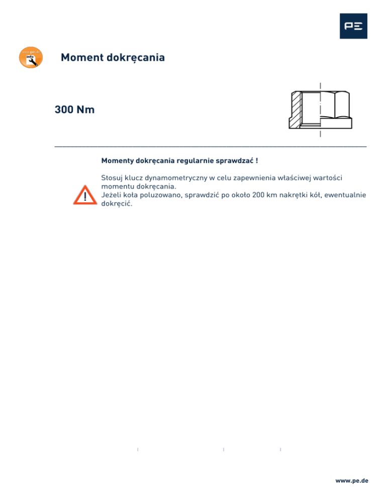 Moment dokręcania 300 Nm _______________________________________________________________________________ _ Momenty dokręcania regularnie sprawdzać ! Stosuj klucz dynamometryczny w celu zapewnienia właściwej wartości momentu dokręcania. Jeżeli koła poluzowano, sprawdzić po około 200 km nakrętki kół, ewentualnie dokręcić. www.pe.de