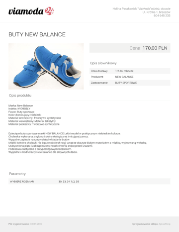 Halina Paszkaniak "ViaModa"odzież, obuwie Ul. Krótka 1, brzozów 604 645 233 BUTY NEW BALANCE Cena: 170,00 PLN Opis słownikowy Czas dostawy 1-2 dni robocze Producent NEW BALANCE Zastosowanie BUTY SPORTOWE Opis produktu Marka: New Balance Indeks: KV396BLY Fason: Buty sportowe Kolor dominujący: Niebieski Materiał zewnętrzny: Tworzywo syntetyczne Materiał wewnętrzny: Materiał tekstylny Materiał podeszwy: Tworzywo syntetyczne Dziecięce buty sportowe marki NEW BALANCE.Lekki model w praktycznym niebieskim kolorze. Cholewka wykonana z nylonu i skóry ekologicznej imitującej zamsz. Wygodne zapięcie na rzepy ułatwi wkładanie butów. Miękki kołnierz cholewki nie będzie obcierał nogi, wnętrze obszyte białym materiałem z miękką, wyjmowaną wkładką. Usztywniona pięta i zabezpieczony nosek chronią stopę przed urazami. Podeszwa elastyczna z antypoślizgowym bieżnikiem. Wygodne i modne buty New Balance dla aktywnych dzieci. Parametry WYBIERZ ROZMIAR Plik wygenerowano: 03-03-2017 30, 33, 34 1/2, 35 Oprogramowanie sklepu: AptusShop Halina Paszkaniak "ViaModa"odzież, obuwie Ul. Krótka 1, brzozów 604 645 233 Galeria Plik wygenerowano: 03-03-2017 Powered by TCPDF (www.tcpdf.org) Oprogramowanie sklepu: AptusShop