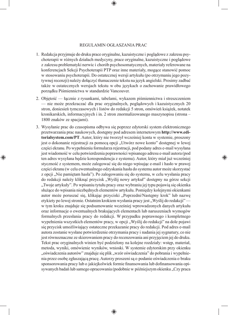 Regulamin ogłaszania prac 1. Redakcja przyjmuje do druku prace oryginalne, kazuistyczne i poglądowe z zakresu psychoterapii w różnych działach medycyny, prace oryginalne, kazuistyczne i poglądowe z zakresu problematyki nerwic i chorób psychosomatycznych, materiały referowane na konferencjach Sekcji Psychoterapii PTP oraz inne materiały, mogące stanowić pomoc w stosowaniu psychoterapii. Do ostatecznej wersji artykułu (po otrzymaniu jego pozytywnej recenzji) należy dołączyć tłumaczenie tekstu na język angielski. Prosimy zadbać także w ostatecznych wersjach tekstu w obu językach o zachowanie prawidłowego porządku Piśmiennictwa w standardzie Vancouver. 2. Objętość — łącznie z rysunkami, tabelami, wykazem piśmiennictwa i streszczeniem — nie może przekraczać dla prac oryginalnych, poglądowych i kazuistycznych 20 stron, doniesień tymczasowych i listów do redakcji 5 stron, omówień książek, notatek kronikarskich, informacyjnych i in. 2 stron znormalizowanego maszynopisu (strona – 1800 znaków ze spacjami). 3. Wysyłanie prac do czasopisma odbywa się poprzez edytorski system elektronicznego przetwarzania prac naukowych, dostępny pod adresem internetowym http://www.editorialsystem.com/PT. Autor, który nie tworzył wcześniej konta w systemie, proszony jest o dokonanie rejestracji za pomocą opcji „Utwórz nowe konto” dostępnej w lewej części ekranu. Po wypełnieniu formularza rejestracji, pod podany adres e-mail wysyłana jest wiadomość w celu potwierdzenia poprawności wpisanego adresu e-mail autora (pod ten adres wysyłana będzie korespondencja z systemu). Autor, który miał już wcześniej styczność z systemem, może zalogować się do niego wpisując e-mail i hasło w prawej części ekranu (w celu ewentualnego odzyskania hasła do systemu autor może skorzystać z opcji „Nie pamiętam hasła”). Po zalogowaniu się do systemu, w celu wysłania pracy do redakcji należy kliknąć przycisk „Wyślij nowy artykuł” dostępny na górze sekcji „Twoje artykuły”. Po wpisaniu tytułu pracy oraz wybraniu jej typu pojawią się okienka służące do wpisania niezbędnych elementów artykułu. Pomiędzy kolejnymi okienkami autor może poruszać się, klikając przyciski „Poprzedni/Następny krok” lub nazwę etykiety po lewej stronie. Ostatnim krokiem wysłania pracy jest „Wyślij do redakcji” — w tym kroku znajduje się podsumowanie wcześniej wprowadzonych danych artykułu oraz informacje o ewentualnych brakujących elementach lub naruszeniach wymogów formalnych przesłania pracy do redakcji. W przypadku poprawnego i kompletnego wypełnienia wszystkich elementów pracy, w opcji „Wyślij do redakcji” na dole pojawi się przycisk umożliwiający ostateczne przekazanie pracy do redakcji. Pod adres e-mail autora zostanie wysłane potwierdzenie otrzymania pracy i nadania jej sygnatury, co nie jest równoznaczne ze skierowaniem pracy do recenzowania ani przyjęciem jej do druku. Tekst prac oryginalnych winien być podzielony na kolejne rozdziały: wstęp, materiał, metoda, wyniki, omówienie wyników, wnioski. W systemie edytorskim przy okienku „oświadczenia autorów” znajduje się plik „wzór oświadczenia” do pobrania i wypełnienia przez osobę zgłaszającą pracę. Autorzy proszeni są o podanie oświadczenia o braku sponsorowania pracy lub o jakiejkolwiek formie finansowania lub dofinansowania opisywanych badań lub samego opracowania (podobnie w późniejszym okienku „Czy praca 102 Regulamin ogłaszania prac uzyskała zewnętrzne źródło finansowania?”). Autor zgłaszający pracę sponsorowaną jest zobowiązany do oświadczenia, że autorzy publikacji nie byli poddani żadnym wpływom ze strony sponsorów w toku badań i ich opracowywania. Kolejne oświadczenie dotyczy faktu, że zgłaszana praca nie została skierowana do druku w innym czasopiśmie. Główną odpowiedzialność za prawidłowe podanie tych danych, pozwalających uniknąć nierzetelności naukowej, ponosi autor zgłaszający manuskrypt. W przypadku wykrycia sytuacji, gdy ktoś wniósł istotny wkład w powstanie publikacji, a jego udział nie został ujawniony jako jednego z autorów lub w podziękowaniach (ghost-writing) — i przeciwnie, jeśli udział danej osoby jest znikomy lub w ogóle nie miał miejsca, a pomimo to jest ona wymieniona jako autor/współautor publikacji (guest-authorship), redakcja jest zobowiązana do powiadomienia o tym fakcie odpowiednich podmiotów. Do wszystkich prac oryginalnych, kazuistycznych i poglądowych należy dołączyć streszczenie w języku polskim i angielskim o objętości min. 150, maks. 250 słów. W przypadku prac oryginalnych, kazuistycznych oraz doniesień tymczasowych powinno to być streszczenie ustrukturowane. Należy w nim wyróżnić w odrębnych akapitach: 1. cel badań, 2. metodę, 3. wyniki, 4. wnioski. Poniżej należy wpisać słowa klucze (nie więcej niż trzy). Prace należy przygotować w formie elektronicznej (Word dla Windows). Na jednej stronie powinno być 1800 znaków. W liczbach miejsca dziesiętne należy oddzielać przecinkami (nie kropkami). Tekst powinien być zapisany w kolorze jednolitym czarnym. Należy usunąć z niego wszystkie kolorowe zaznaczenia używane podczas redagowania tekstu w edytorze.Tabele należy wykonać w programie Word dla Windows, a wykresy w programie Word lub Excel. Szerokość tabel i rysunków nie może przekraczać 12,5 cm (szerokość łamu czasopisma). W tabelach i opisach rysunków należy używać pisma Arial Narrow CE wielkości 10 punktów. Ilustracje półtonowe należy zapisać w formacie TIF lub EPS (odcienie szarości, rozdzielczość 300 dpi), w proporcjach, w jakich mają być drukowane. W wypełnieniach wykresów nie należy używać kolorów, tylko odcieni szarości lub czarno-białych wypełnień. W wykresach liniowych należy używać czarno-białych znaczników linii przewidzianych przez programy. Ilość tabel, wykresów