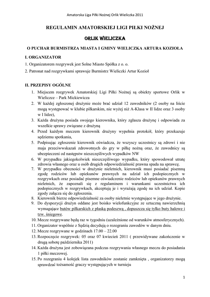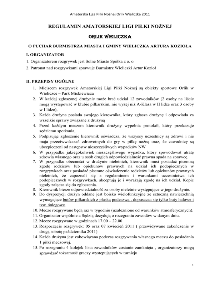 Amatorska Liga Piłki Nożnej Orlik Wieliczka 2011 REGULAMIN AMATORSKIEJ LIGI PIŁKI NOŻNEJ ORLIK WIELICZKA O PUCHAR BURMISTRZA MIASTA I GMINY WIELICZKA ARTURA KOZIOŁA I. ORGANIZATOR 1. Organizatorem rozgrywek jest Solne Miasto Spółka z o. o. 2. Patronat nad rozgrywkami sprawuje Burmistrz Wieliczki Artur Kozioł II. PRZEPISY OGÓLNE 1. Miejscem rozgrywek Amatorskiej Ligi Piłki Nożnej są obiekty sportowe Orlik w Wieliczce – Park Mickiewicza 2. W każdej zgłoszonej drużynie może brać udział 12 zawodników (2 osoby na liście mogą występować w klubie piłkarskim, nie wyżej niż A-Klasa w II lidze oraz 3 osoby w I lidze), 3. Każda drużyna posiada swojego kierownika, który zgłasza drużynę i odpowiada za wszelkie sprawy związane z drużyną 4. Przed każdym meczem kierownik drużyny wypełnia protokół, który przekazuje sędziemu spotkania, 5. Podpisując zgłoszenie kierownik oświadcza, że wszyscy uczestnicy są zdrowi i nie maja przeciwwskazań zdrowotnych do gry w piłkę nożną oraz, że zawodnicy są ubezpieczeni od następstw nieszczęśliwych wypadków NW 6. W przypadku jakiegokolwiek nieszczęśliwego wypadku, który spowodował utratę zdrowia własnego oraz u osób drugich odpowiedzialność prawna spada na sprawcę. 7. W przypadku obecności w drużynie nieletnich, kierownik musi posiadać pisemną zgodę rodziców lub opiekunów prawnych na udział ich podopiecznych w rozgrywkach oraz posiadać pisemne oświadczenie rodziców lub opiekunów prawnych nieletnich, że zapoznali się z regulaminem i warunkami uczestnictwa ich podopiecznych w rozgrywkach, akceptują je i wyrażają zgodę na ich udział. Kopie zgody załącza się do zgłoszenia. 8. Kierownik bierze odpowiedzialność za osoby nieletnie występujące w jego drużynie. 9. Do dyspozycji drużyn oddane jest boisko wielofunkcyjne ze sztuczną nawierzchnią wymagające butów piłkarskich z płaską podeszwą , dopuszcza się tylko buty halowe i tzw. śniegowe. 10. Mecze rozgrywane będą raz w tygodniu (uzależnione od warunków atmosferycznych). 11. Organizator wspólnie z Sędzią decydują o rozegraniu zawodów w danym dniu. 12. Mecze rozgrywane w godzinach 17.00 – 22.00 13. Rozpoczęcie rozgrywek: 05 oraz 07 kwiecień 2011 ( przewidywane zakończenie w drugą sobotę października 2011) 14. Każda drużyna jest zobowiązana podczas rozgrywania własnego meczu do posiadania 1 piłki meczowej. 15. Po rozegraniu 4 kolejek lista zawodników zostanie zamknięta , organizatorzy mogą sprawdzać tożsamość graczy występujących w turnieju 1 Amatorska Liga Piłki Nożnej Orlik Wieliczka 2011 16. Organizatorzy mogą przyznać walkowera lub wykluczyć drużynę za nie zastosowanie się do regulaminu 17. Organizator zapewnia wyłącznie doraźną pomoc przy urazach, powstałych w czasie gry(opatrzenie otarć, dezynfekcja ran, zabezpieczenie ran - plaster, bandaż ), natomiast nie ponosi odpowiedzialności prawnej za udział w rozgrywkach osób chorych i wynikające z tego powodu wypadki, oraz skutki wypadków w czasie gry każdego z zawodników. 18. Ze względu na bezpieczeństwo osób (np. przeciwnika) zawodnicy nie mogą grać w okularach, łańcuszkach itp. 19. Za udział w rozgrywkach drużyny zobowiązane są do wpłacenia wpisowego w wysokości po 450 zł. za każdą rundę płatne na konto lub w kasie Organizatora w terminie do 18 kwietnia 2011 za I rundę i do 10 sierpnia 2011 za II rundę. (środki te przeznaczone są na organizację zawodów, sędziowanie, sprzęt sportowy, nagrody i wyróżnienia oraz uroczyste zakończenie sezonu – boisko Orlik udostępniane jest bezpłatnie). 20. Wszystkie drużyny otrzymają puchary za udział w lidze. Najlepsze drużyny zostaną nagrodzone. Przewiduje się ponadto nagrodę dla najlepszego zawodnika, najlepszego bramkarza oraz nagrodę fair-play. 21. Prowadzona będzie klasyfikacja najlepszego strzelca rozgrywek, który na zakończenie również zostanie nagrodzony. 22. Wyniki meczy i klasyfikacja drużyn będzie umieszczana na stronie www.solnemiasto.eu oraz www.orlikwieliczka.futbolowo.pl III. SYSTEM I ZASADY ROZGRYWEK 1. System rozgrywek: a) Uczestniczące drużyny zostaną rozstawione do I oraz II ligi, mecze rozgrywane będą systemem II rundowym każdy z każdym . b) Drużyny w I lidze które zajmą w końcowej klasyfikacji 11 oraz 12 miejsce spadną do II ligi, zespoły z miejsc 9 oraz 10 zagrają baraż o utrzymanie w następujący sposób: dziewiąta z I ligi z czwartą z II ligi oraz dziesiąta z I ligi z trzecią z II ligi. c) Drużyny, które w II lidze które zajmą w końcowej klasyfikacji 1 oraz 2 miejsce awansują do I ligi, zespoły z miejsc 3 oraz 4 zagrają baraż o awans w następujący sposób: dziewiąta z I ligi z czwartą z II ligi oraz dziesiąta z I ligi z trzecią z II ligi. 2. O kolejności miejsc w lidze decyduje: a) większa ilość zdobytych punktów b) wynik bezpośredniego spotkania przy dwóch zespołach z jednakową ilością punktów c) mała tabela przy 3-ch zespołach z jednakową ilością punktów d) lepsza różnica zdobytych bramek e) większa ilość zdobytych bramek 3. O utrzymanie w I lidze (mecze barażowe), będzie rozgrywany jeden mecz. W przypadku remisu rozgrywana będzie dogrywka 1 razy 10 minut, w przypadku remisu po dogrywce rozegrane zostaną rzuty karne. 4. Za zwycięstwo w meczu przyznaje się 3 punkty za remis jeden, porażka zero punktów. 5. W przypadku nie stawienia się drużyny na mecz sędzia przyznaje walkower 5-0 IV. PRZEPISY GRY 1. Mecz składa się z dwóch równych części po 20 minut każda 2 Amatorska Liga Piłki Nożnej Orlik Wieliczka 2011 2. Drużyny grają po 6 zawodników, w tym jeden bramkarz w stroju odróżniającym się od pozostałych zawodników drużyny. 3. Aby mecz mógł się rozpocząć na boisku musi znajdować się minimum 4 zawodników każdej z drużyn. 4. Walkower orzeka sędzia po upływie 10 minut od przewidzianego czasu rozpoczęcia rozgrywek. 5. Zmiany s
