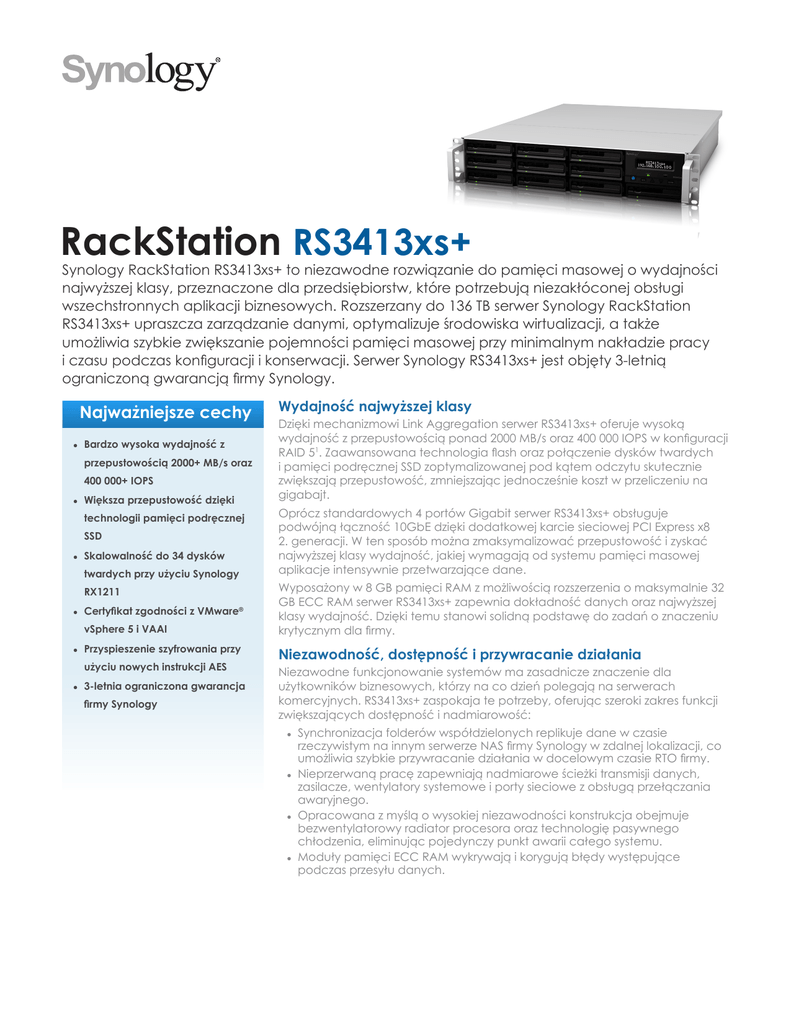 RackStation RS3413xs+ Synology RackStation RS3413xs+ to niezawodne rozwiązanie do pamięci masowej o wydajności najwyższej klasy, przeznaczone dla przedsiębiorstw, które potrzebują niezakłóconej obsługi wszechstronnych aplikacji biznesowych. Rozszerzany do 136 TB serwer Synology RackStation RS3413xs+ upraszcza zarządzanie danymi, optymalizuje środowiska wirtualizacji, a także umożliwia szybkie zwiększanie pojemności pamięci masowej przy minimalnym nakładzie pracy i czasu podczas konfiguracji i konserwacji. Serwer Synology RS3413xs+ jest objęty 3-letnią ograniczoną gwarancją firmy Synology. Najważniejsze cechy ●● Bardzo wysoka wydajność z przepustowością 2000+ MB/s oraz 400 000+ IOPS ●● Większa przepustowość dzięki technologii pamięci podręcznej SSD ●● Skalowalność do 34 dysków twardych przy użyciu Synology RX1211 ●● Certyfikat zgodności z VMware® vSphere 5 i VAAI ●● Przyspieszenie szyfrowania przy użyciu nowych instrukcji AES ●● 3-letnia ograniczona gwarancja firmy Synology Wydajność najwyższej klasy Dzięki mechanizmowi Link Aggregation serwer RS3413xs+ oferuje wysoką wydajność z przepustowością ponad 2000 MB/s oraz 400 000 IOPS w konfiguracji RAID 51. Zaawansowana technologia flash oraz połączenie dysków twardych i pamięci podręcznej SSD zoptymalizowanej pod kątem odczytu skutecznie zwiększają przepustowość, zmniejszając jednocześnie koszt w przeliczeniu na gigabajt. Oprócz standardowych 4 portów Gigabit serwer RS3413xs+ obsługuje podwójną łączność 10GbE dzięki dodatkowej karcie sieciowej PCI Express x8 2. generacji. W ten sposób można zmaksymalizować przepustowość i zyskać najwyższej klasy wydajność, jakiej wymagają od systemu pamięci masowej aplikacje intensywnie przetwarzające dane. Wyposażony w 8 GB pamięci RAM z możliwością rozszerzenia o maksymalnie 32 GB ECC RAM serwer RS3413xs+ zapewnia dokładność danych oraz najwyższej klasy wydajność. Dzięki temu stanowi solidną podstawę do zadań o znaczeniu krytycznym dla firmy. Niezawodność, dostępność i przywracanie działania Niezawodne funkcjonowanie systemów ma zasadnicze znaczenie dla użytkowników biznesowych, którzy na co dzień polegają na serwerach komercyjnych. RS3413xs+ zaspokaja te potrzeby, oferując szeroki zakres funkcji zwiększających dostępność i nadmiarowość: ●● ●● ●● ●● Synchronizacja folderów współdzielonych replikuje dane w czasie rzeczywistym na innym serwerze NAS firmy Synology w zdalnej lokalizacji, co umożliwia szybkie przywracanie działania w docelowym czasie RTO firmy. Nieprzerwaną pracę zapewniają nadmiarowe ścieżki transmisji danych, zasilacze, wentylatory systemowe i porty sieciowe z obsługą przełączania awaryjnego. Opracowana z myślą o wysokiej niezawodności konstrukcja obejmuje bezwentylatorowy radiator procesora oraz technologię pasywnego chłodzenia, eliminując pojedynczy punkt awarii całego systemu. Moduły pamięci ECC RAM wykrywają i korygują błędy występujące podczas przesyłu danych. Solidność i skalowalność Dzięki łącznej pojemności pamięci masowej do 136 TB2 serwer RS3413xs+ rozwija się wraz z firmą i umożliwia płynne rozszerzanie pojedynczych wolumenów na bieżąco nawet do 108 TB. Rysunek 1) Pamięć podręczna SSD Technologia pamięci podręcznej SSD firmy Synology skutecznie zwiększa przepustowość, minimalizując jednocześnie koszt w przeliczeniu na gigabajt. RS3413xs+ obsługuje do 34 dysków SATA lub SSD, zapewniając elastyczną pojemność i zrównoważoną wydajność zaspokajającą potrzeby różnych aplikacji i procesów. Kiedy pojemność pamięci masowej serwera RS3413xs+ zacznie się wyczerpywać, można ją łatwo rozszerzyć przy użyciu jednostki Synology RX1211, za pośrednictwem kabla InfiniBand®. Umożliwia to przesyłanie sygnału SATA z przepustowością 12 Gb/s i maksymalizację transmisji danych pomiędzy serwerem głównym a jednostkami rozszerzającymi. Zarządzanie dużą pojemnością pamięci serwera RS3413xs+ jest proste i elastyczne. Funkcja Wiele wolumenów w macierzy RAID umożliwia użytkownikom tworzenie więcej niż jednego wolumenu w strukturze RAID, zapewniając elastyczny i skuteczny sposób zarządzania pamięcią na wszystkich dyskach twardych. Pojemność wolumenu można w razie potrzeby w prosty sposób powiększyć, bez przerw w pracy. Ujednolicony system pamięci masowej Integrując pamięć masową na poziomie plików (NAS) i bloków (SAN) w jeden, ujednolicony system pamięci masowej, RS3413xs+ umożliwia firmom ekonomiczne zarządzanie danymi przy użyciu wielu protokołów i zmniejszenie łącznego kosztu posiadania: ●● ●● ●● Obsługa wielu protokołów sieciowych (CIFS/SMB, AFP i NFS) gwarantuje bezproblemowe udostępnianie plików między platformami Windows®, Mac® i Linux®. Przystępny cenowo i ekonomiczny interfejs iSCSI umożliwia użytkownikom z dużych firm konsolidowanie pamięci masowej w macierzach pamięci masowej w centrach danych. Dla jednostek iSCSI LUN na poziomie plików dostępna jest funkcja Thin Provisioning, która maksymalizuje wykorzystanie pamięci masowej, umożliwiając administratorom bezpieczną nadsubskrypcję, a następnie zwiększanie pamięci zależnie od potrzeb. Gotowy do wirtualizacji RS3413xs+ zapewnia bezproblemowe rozwiązanie do środowisk wirtualizacji, takich jak VMware, Citrix® i Hyper-V®. Certyfikowany pod kątem zgodności z VMware vSphere® 5 i integracji z VAAI serwer RS3413xs+ umożliwia rozładowanie obciążenia związanego z niektórymi operacjami w pamięci masowej i optymalizuje wykorzystanie mocy obliczeniowej. W ten sposób zapewnia niezrównaną wydajność w środowiskach VMware. Jako scentralizowana pamięć środowiska wirtualizacji serwer RS3413xs+ umożliwia migrację maszyn wirtualnych i przenoszenie pomiędzy serwerami, eliminując przestoje i zakłócenia w dostarczaniu usług uż