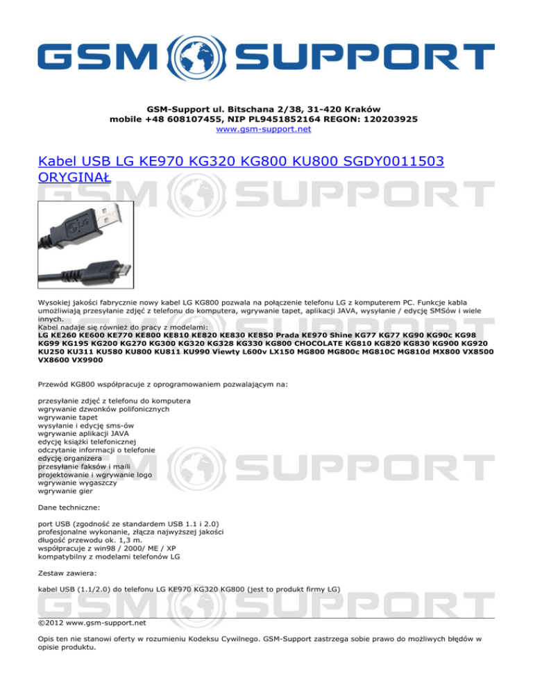 GSM-Support ul. Bitschana 2/38, 31-420 Kraków mobile +48 608107455, NIP PL9451852164 REGON: 120203925 www.gsm-support.net Kabel USB LG KE970 KG320 KG800 KU800 SGDY0011503 ORYGINAŁ Wysokiej jakości fabrycznie nowy kabel LG KG800 pozwala na połączenie telefonu LG z komputerem PC. Funkcje kabla umożliwiają przesyłanie zdjęć z telefonu do komputera, wgrywanie tapet, aplikacji JAVA, wysyłanie / edycję SMSów i wiele innych. Kabel nadaje się również do pracy z modelami: LG KE260 KE600 KE770 KE800 KE810 KE820 KE830 KE850 Prada KE970 Shine KG77 KG77 KG90 KG90c KG98 KG99 KG195 KG200 KG270 KG300 KG320 KG328 KG330 KG800 CHOCOLATE KG810 KG820 KG830 KG900 KG920 KU250 KU311 KU580 KU800 KU811 KU990 Viewty L600v LX150 MG800 MG800c MG810C MG810d MX800 VX8500 VX8600 VX9900 Przewód KG800 współpracuje z oprogramowaniem pozwalającym na: przesyłanie zdjęć z telefonu do komputera wgrywanie dzwonków polifonicznych wgrywanie tapet wysyłanie i edycję sms-ów wgrywanie aplikacji JAVA edycję książki telefonicznej odczytanie informacji o telefonie edycję organizera przesyłanie faksów i maili projektowanie i wgrywanie logo wgrywanie wygaszczy wgrywanie gier Dane techniczne: port USB (zgodność ze standardem USB 1.1 i 2.0) profesjonalne wykonanie, złącza najwyższej jakości długość przewodu ok. 1,3 m. współpracuje z win98 / 2000/ ME / XP kompatybilny z modelami telefonów LG Zestaw zawiera: kabel USB (1.1/2.0) do telefonu LG KE970 KG320 KG800 (jest to produkt firmy LG) ©2012 www.gsm-support.net Opis ten nie stanowi oferty w rozumieniu Kodeksu Cywilnego. GSM-Support zastrzega sobie prawo do możliwych błędów w opisie produktu. Prosimy o weryfikację z Państwa strony, a w razie wątpliwości o kontakt. GSM-Support ul. Bitschana 2/38 31-420 Kraków POLSKA tel. 608107455 e-mail: [email protected] Powered by TCPDF (www.tcpdf.org)