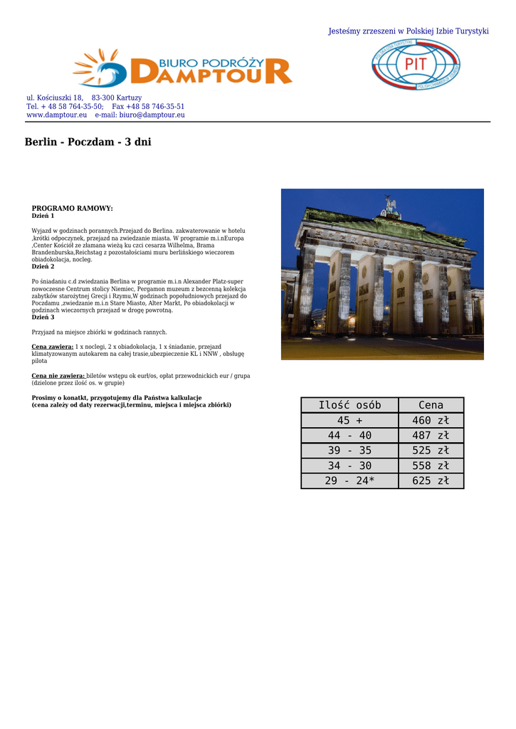 Jesteśmy zrzeszeni w Polskiej Izbie Turystyki ul. Kościuszki 18, 83-300 Kartuzy Tel. + 48 58 764-35-50; Fax +48 58 746-35-51 www.damptour.eu e-mail: [email protected] Berlin - Poczdam - 3 dni PROGRAMO RAMOWY: Dzień 1 Wyjazd w godzinach porannych.Przejazd do Berlina. zakwaterowanie w hotelu ,krótki odpoczynek, przejazd na zwiedzanie miasta. W programie m.i.nEuropa ,Center Kościół ze złamana wieżą ku czci cesarza Wilhelma, Brama Brandenburska,Reichstag z pozostałościami muru berlińskiego wieczorem obiadokolacja, nocleg. Dzień 2 Po śniadaniu c.d zwiedzania Berlina w programie m.i.n Alexander Platz-super nowoczesne Centrum stolicy Niemiec, Pergamon muzeum z bezcenną kolekcja zabytków starożytnej Grecji i Rzymu,W godzinach popołudniowych przejazd do Poczdamu ,zwiedzanie m.i.n Stare Miasto, Alter Markt, Po obiadokolacji w godzinach wieczornych przejazd w drogę powrotną. Dzień 3 Przyjazd na miejsce zbiórki w godzinach rannych. Cena zawiera: 1 x noclegi, 2 x obiadokolacja, 1 x śniadanie, przejazd klimatyzowanym autokarem na całej trasie,ubezpieczenie KL i NNW , obsługę pilota Cena nie zawiera: biletów wstępu ok eurł/os, opłat przewodnickich eur / grupa (dzielone przez ilość os. w grupie) Prosimy o konatkt, przygotujemy dla Państwa kalkulacje (cena zależy od daty rezerwacji,terminu, miejsca i miejsca zbiórki) Ilość 45 44 39 34 29 - osób + 40 35 30 24* Cena 460 zł 487 zł 525 zł 558 zł 625 zł