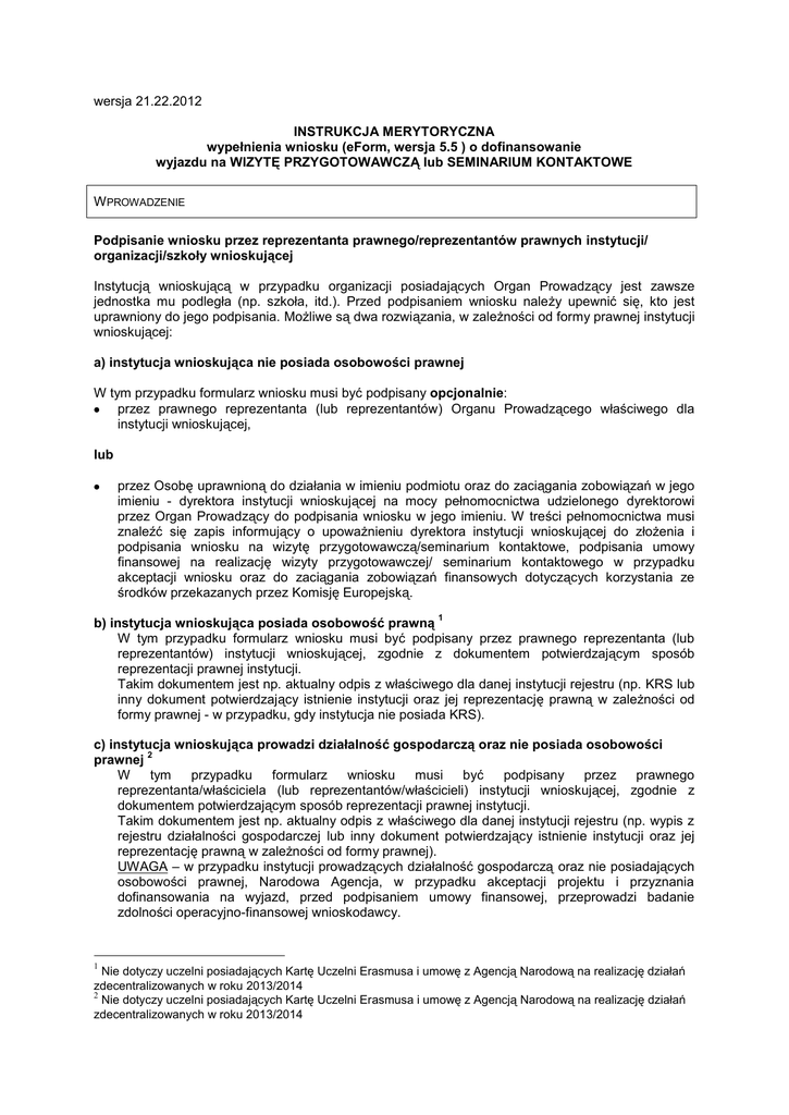 wersja 21.22.2012 INSTRUKCJA MERYTORYCZNA wypełnienia wniosku (eForm, wersja 5.5 ) o dofinansowanie wyjazdu na WIZYTĘ PRZYGOTOWAWCZĄ lub SEMINARIUM KONTAKTOWE W PROWADZENIE Podpisanie wniosku przez reprezentanta prawnego/reprezentantów prawnych instytucji/ organizacji/szkoły wnioskującej Instytucją wnioskującą w przypadku organizacji posiadających Organ Prowadzący jest zawsze jednostka mu podległa (np. szkoła, itd.). Przed podpisaniem wniosku należy upewnić się, kto jest uprawniony do jego podpisania. Możliwe są dwa rozwiązania, w zależności od formy prawnej instytucji wnioskującej: a) instytucja wnioskująca nie posiada osobowości prawnej W tym przypadku formularz wniosku musi być podpisany opcjonalnie: przez prawnego reprezentanta (lub reprezentantów) Organu Prowadzącego właściwego dla instytucji wnioskującej, lub przez Osobę uprawnioną do działania w imieniu podmiotu oraz do zaciągania zobowiązań w jego imieniu - dyrektora instytucji wnioskującej na mocy pełnomocnictwa udzielonego dyrektorowi przez Organ Prowadzący do podpisania wniosku w jego imieniu. W treści pełnomocnictwa musi znaleźć się zapis informujący o upoważnieniu dyrektora instytucji wnioskującej do złożenia i podpisania wniosku na wizytę przygotowawczą/seminarium kontaktowe, podpisania umowy finansowej na realizację wizyty przygotowawczej/ seminarium kontaktowego w przypadku akceptacji wniosku oraz do zaciągania zobowiązań finansowych dotyczących korzystania ze środków przekazanych przez Komisję Europejską. 1 b) instytucja wnioskująca posiada osobowość prawną W tym przypadku formularz wniosku musi być podpisany przez prawnego reprezentanta (lub reprezentantów) instytucji wnioskującej, zgodnie z dokumentem potwierdzającym sposób reprezentacji prawnej instytucji. Takim dokumentem jest np. aktualny odpis z właściwego dla danej instytucji rejestru (np. KRS lub inny dokument potwierdzający istnienie instytucji oraz jej reprezentację prawną w zależności od formy prawnej - w przypadku, gdy instytucja nie posiada KRS). c) instytucja wnioskująca prowadzi działalność gospodarczą oraz nie posiada osobowości 2 prawnej W tym przypadku formularz wniosku musi być podpisany przez prawnego reprezentanta/właściciela (lub reprezentantów/właścicieli) instytucji wnioskującej, zgodnie z dokumentem potwierdzającym sposób reprezentacji prawnej instytucji. Takim dokumentem jest np. aktualny odpis z właściwego dla danej instytucji rejestru (np. wypis z rejestru działalności gospodarczej lub inny dokument potwierdzający istnienie instytucji oraz jej reprezentację prawną w zależności od formy prawnej). UWAGA – w przypadku instytucji prowadzących działalność gospodarczą oraz nie posiadających osobowości prawnej, Narodowa Agencja, w przypadku akceptacji projektu i przyznania dofinansowania na wyjazd, przed podpisaniem umowy finansowej, przeprowadzi badanie zdolności operacyjno-finansowej wnioskodawcy. 1 Nie dotyczy uczelni posiadających Kartę Uczelni Erasmusa i umowę z Agencją Narodową na realizację działań zdecentralizowanych w roku 2013/2014 2 Nie dotyczy uczelni posiadających Kartę Uczelni Erasmusa i umowę z Agencją Narodową na realizację działań zdecentralizowanych w roku 2013/2014 INFORMACJE OGÓLNE DOT. WNIOSKU EFORM I. Instalacja programu Adobe Reader II. Pobranie i zapisanie wniosku eForm na swoim komputerze III. Informacje techniczne na temat wypełniania wniosku eForm I. Instalacja programu Adobe Reader Jeżeli na komputerze, z którego będzie składany wniosek jest zainstalowany program Adobe Reader w wersji 8.4 lub wyższej, proszę przejść do pkt. II. (Pobieranie i zapisywanie wniosku eForm na swoim komputerze). Proszę upewnić się, że na komputerze, na którym będą Państwo wypełniać wniosek, mają Państwo zainstalowany program Adobe Reader - wersję 9.2 lub wyższą. Jeżeli nie, mogą Państwo bezpłatnie ściągnąć najnowszą wersję programu Adobe Reader ze strony producenta programu http://get.adobe.com/reader/?promoid=BUIGO . II. Pobranie i zapisanie wniosku eForm na swoim komputerze Kiedy na komputerze zainstalowana jest właściwa wersja programu Adobe Reader, należy: 1. otworzyć stronę: www.pv.org.pl, lub stronę programu, w ramach którego będziecie Państwo wnioskować o wizytę przygotowawczą; 2. zapisać formularz wniosku eForm „Wizyty Przygotowawcze 2013” w formacie PDF na dysku lokalnym (na swoim komputerze). Wniosek zapisany na dysku lokalnym można wypełniać w dowolnym tempie, stale zapisując wprowadzane zmiany i zamknąć go w dowolnym momencie bez utraty wpisanych danych. III. Informacje techniczne na temat wypełniania wniosku eForm 1. Rodzaje pól we wniosku: We wniosku znajdują się: pola obowiązkowe – są to pola z czerwoną obwódką i/lub z pomarańczowym tłem pola o szarym tle - to pola, które wypełnią się automatycznie po wprowadzeniu odpowiednich danych w polach obowiązkowych wniosku. pola opisowe, w których należy samodzielnie wpisać tekst, pola wyboru, które umożliwiają wybór jednej z opcji pokazujących się w menu rozwijalnym. Menu rozwijalne jest widoczne po naciśnięciu strzałki w dół umieszczonej przy prawej krawędzi tego pola. 2. Dokument roboczy i dokument złożony Na formularzu w stopce poniżej sumy kontrolnej, widoczny jest status formularza: „Niniejszy dokument nie został złożony” - przez cały czas do momentu kiedy wniosek został zatwierdzony i złożony za pomocą przycisku Złóż on-line (lub jako załącznik e-mail) lub do momentu, kiedy po udanym zatwierdzeniu wniosku nastąpiła próba (nawet nieudana) złożenia wniosku przy pomocy przycisku Złóż on-line. Ponadto na ostatniej stronie, w części L.2. („Zdarzenie”) podany jest aktualny status wniosku. 3. Weryfikacja wypełnienia pól - przycisk Zatwierdź Po wypełnieniu każdej strony wniosku należy przy pomocy przycisku Zatwierdź u dołu strony zweryfi