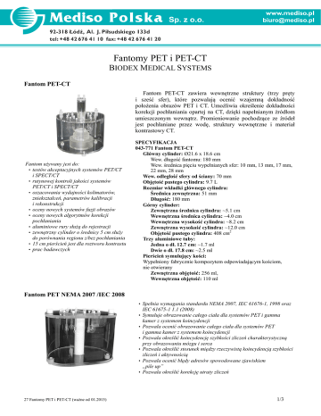 Fantomy PET i PET-CT BIODEX MEDICAL SYSTEMS Fantom PET-CT Fantom PET-CT zawiera wewnętrzne struktury (trzy pręty i sześć sfer), które pozwalają ocenić wzajemną dokładność położenia obrazów PET i CT. Umożliwia określenie dokładności korekcji pochłaniania opartej na CT, dzięki napełnianym źródłom umieszczonym wewnątrz. Promieniowanie pochodzące ze źródeł jest pochłaniane przez wodę, struktury wewnętrzne i materiał kontrastowy CT. Fantom używany jest do: • testów akceptacyjnych systemów PET/CT i SPECT/CT • rutynowej kontroli jakości systemów PET/CT i SPECT/CT • oszacowania wydajności kolimatorów, zniekształceń, parametrów kalibracji i rekonstrukcji • oceny nowych systemów fuzji obrazów • oceny nowych algorytmów korekcji pochłaniania • aluminiowe rury służą do rejestracji • zewnętrzny cylinder o średnicy 5 cm służy do porównania regionu z/bez pochłaniania • 15 cm pierścień jest dla roztworu kontrastu • prac badawczych SPECYFIKACJA 043-771 Fantom PET-CT Główny cylinder: Ø21.6 x 18.6 cm Wew. długość fantomu: 180 mm Wew. średnica pięciu wypełnianych sfer: 10 mm, 13 mm, 17 mm, 22 mm, 28 mm Wew. odległość sfery od ściany: 70 mm Objętość pustego cylindra: 9.7 L Rozmiar wkładki głównego cylindra: Średnica zewnętrzna: 51 mm Długość: 180 mm Górny cylinder: Zewnętrzna średnica cylindra: ~5.1 cm Wewnętrzna średnica cylindra: ~4.0 cm Wewnętrzna wysokość cylindra: ~8.2 cm Zewnętrzna wysokość cylindra: ~12.0 cm Objętość pustego cylindra: 408 cm2 Trzy aluminiowe tuby: Jedna o dł. 12.7 cm: ~1.7 ml Dwie o dł. 17.8 cm: ~2.5 ml Pierścień symulujący kości: Wypełniony fabrycznie kompozytem odpowiadającym kościom, nie otwierany Zewnętrzna objętość: 256 ml, Wewnętrzna objętość: 110 ml Fantom PET NEMA 2007 /IEC 2008 • Spełnia wymagania standardu NEMA 2007, IEC 61676-1, 1998 oraz IEC 61675-1 1.1 (2008) • Symuluje obrazowanie całego ciała dla systemów PET i gamma kamer z systemem koincydencji • Pozwala ocenić obrazowanie całego ciała dla systemów PET i gamma kamer z systemem koincydencji • Pozwala określić koincydencję szybkości zliczeń charakterystyczną przy obrazowaniu mózgu i serca • Pozwala określić stosunek między rzeczywistą koincydencją szybkości zliczeń i aktywnością • Pozwala ocenić błędy adresów spowodowane zjawiskiem „pile up” • Pozwala określić korekcję utraty zliczeń 27 Fantomy PET i PET-CT (ważne od 01.2015) 1/3 SPECYFIKACJA 043-767 Fantom PET NEMA 2007/IEC 2008 Wymiary: 24.1 x 30.5 x 24.1 cm Wewnętrzna dł. fantomu: 180 mm Wew. średnica sześciu wypełnianych sfer: 10 mm, 13 mm, 17 mm, 22 mm, 28 mm, 37 mm Wew. odległość sfery od ściany: 70 mm Objętość pustego cylindra: 9.7 L Rozmiar wkładki cylindra: Ø51 x 180 mm Waga transportu: 4.9 kg Fantom rozpraszania PET NEMA SPECYFIKACJA 043-768 Fantom rozpraszania PET NEMA Wymiary zew. cylindra: Ø20.3 x 70 cm Średnica otworu cylindra: 6.4 mm Przesunięcie otworu cylindra: 4.5 cm Wymiary zew. źródła liniowego: Ø5 mm x 80 cm Średnica wew. źródła liniowego: 3.2 mm Waga transportu: 23.5 kg • Spełnia wymagania standardu NEMA 2007 • Wskazany do testów akceptacyjnych • Pozwala określać stosunek czułości do rozpraszania • Pozwala zmierzyć efekt czasu martwego i odpowiedź systemu na źródło liniowe o różnej aktywności Fantom czułości PET NEMA SPECYFIKACJA 043-769 Fantom czułości PET NEMA Pięć współśrodkowych aluminiowych tub – wszystkie o długości 700 mm • Spełnia wymagania standardu NEMA 2007 • Doskonały do pomiaru czułości systemu PET 27 Fantomy PET i PET-CT (ważne od 01.2015) 1. tuba śr. wew. 3.9 mm śr. zew. 6.4 mm 2. tuba śr. wew. 7.0 mm śr. zew. 9.5 mm 3. tuba śr. wew. 10.2 mm śr. zew. 12.7 mm 4. tuba śr. wew. 13.4 mm śr. zew. 15.9 mm 5. tuba śr. wew. 16.6 mm śr. zew. 19.1 mm 6. tuba (położona najbliżej środka, wypełniana polietylenowa tuba) śr. wew. 1 mm śr. zew. 3 mm Waga transportu: 1.3 kg 2/3 Fantom Jaszczaka SPECT/PET bez kołnierza Fantomy Jaszczaka SPECT oraz PET bez kołnierza spełniają wymogi ACR. Umożliwiają one wykonanie wszechstronnego testu każdego systemu SPECT lub PET. Fantom Jaszczaka SPECT bez kołnierza jest taki sam, jak fantom Jaszczaka SPECT Deluxe, różni się od niego tylko usuniętym kołnierzem. Na podstawie tylko jednej akwizycji możliwe jest uzyskanie wielu różnorodnych charakterystyk systemu np. funkcji rozproszenia źródła liniowego w osi i poza osią, pomiar FWHM (lub FWTM) zarówno z rozproszeniem jak i bez. Fantom Jaszczaka SPECT bez kołnierza przeznaczony jest dla kamer o wysokiej rozdzielczości. Fantom używany jest do: • oszacowania wydajności kolimatorów, zniekształceń, parametrów kalibracji i rekonstrukcji • testów akceptacyjnych • rutynowej kontroli jakości • oceny błędu centrum osi obrotu • oszacowania zniekształceń niejednorodności • oceny zmian rozdzielczości w zależności od promienia obrotu • oceny zmian rozdzielczości w zależności od filtracji podczas rekonstrukcji • oszacowania korekcji pochłaniania i rozproszenia • oceny jednorodności tomograficznej • oceny czułości przestrzennej dla pojedynczej warstwy • oceny całkowitej czułości systemowej • oceny zdolności detekcji zmian SPECYFIKACJA Fantomy Jaszczaka SPECT i PET: Wymiary wewnętrzne cylindra: Ø20.4 x 18.6 cm Grubość ścian cylindra: 6.4 mm Objętość: 6.4 L Objętość z wkładkami: 5.7 L Wysokość wkładek „zimnych prętów”: 8.8 cm Wymiary „zimnych prętów”: 4.8 mm, 6.4 mm, 7.9 mm, 9.5 mm, 11.1 mm, 12.7 mm Wysokość sfer od podstawy: 12.7 cm Średnice sfer: 9.5 mm, 12.7 mm, 15.9 mm, 19.1 mm, 25.4 mm, 31.8 mm Pokrywa Fantomu Jaszczaka PET, bez kołnierza Wielorazowe cienkościenne cylindry: 8, 12, 16, 25 (x3) mm Cylindry (Teflon): 25 mm Wysokość cylindrów: 3.8 cm 043-765 Fantom Jaszczaka SPECT, bez kołnierza 043-757 Fantom Jasz